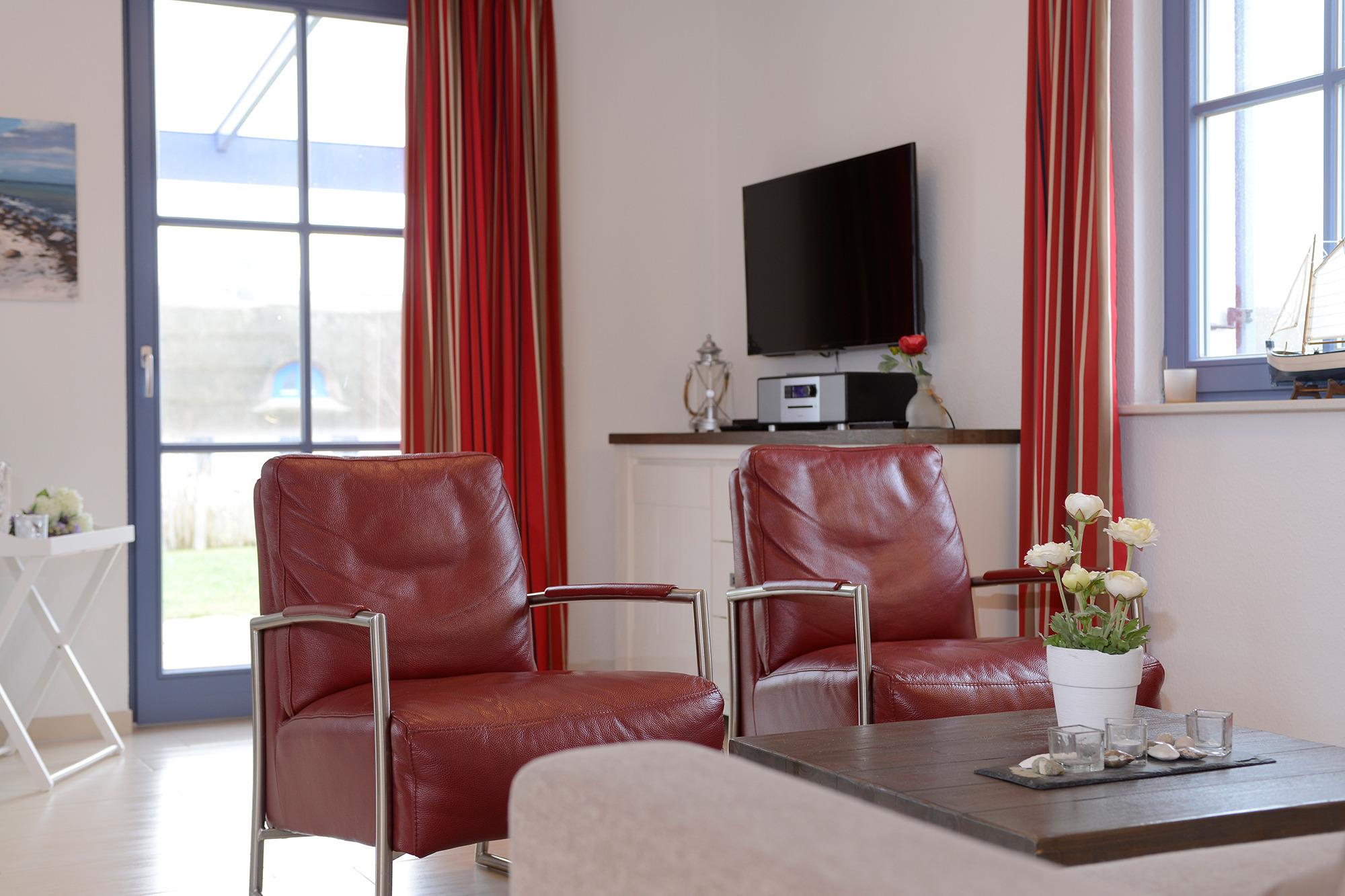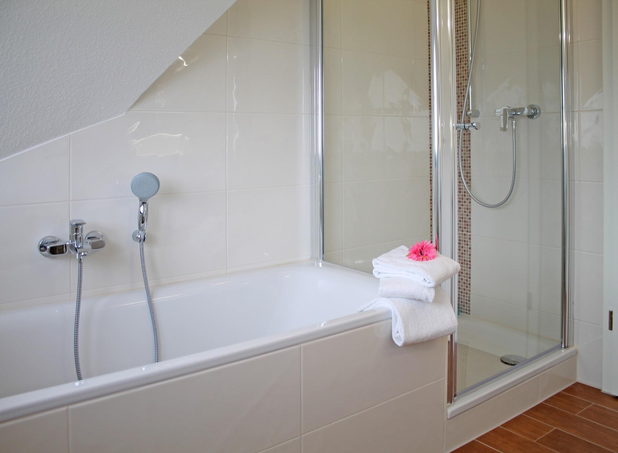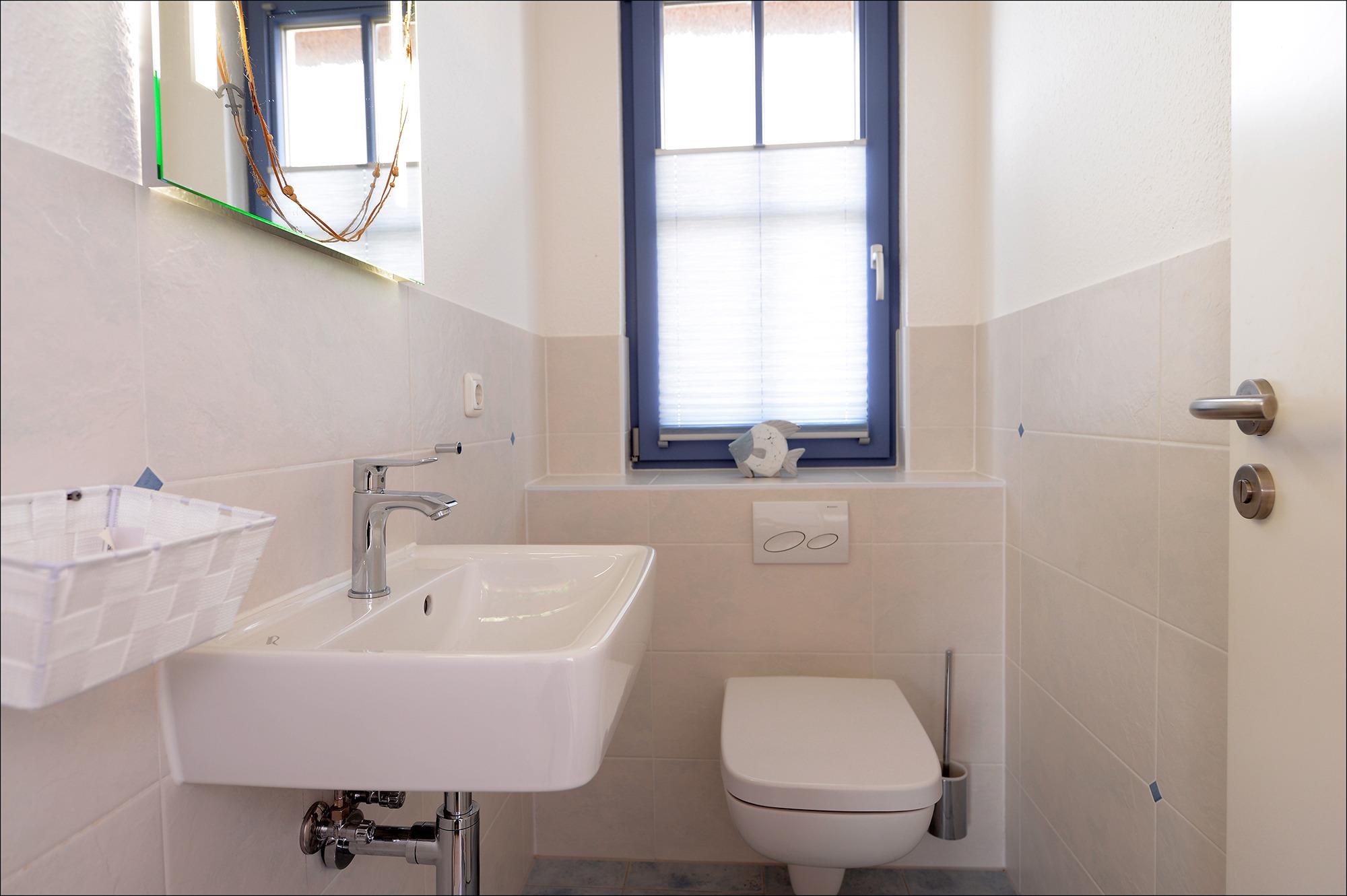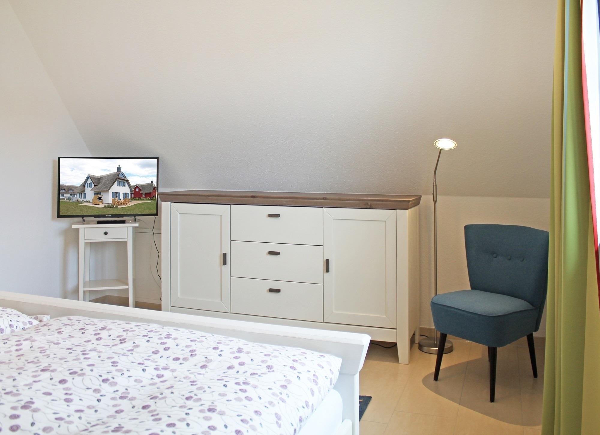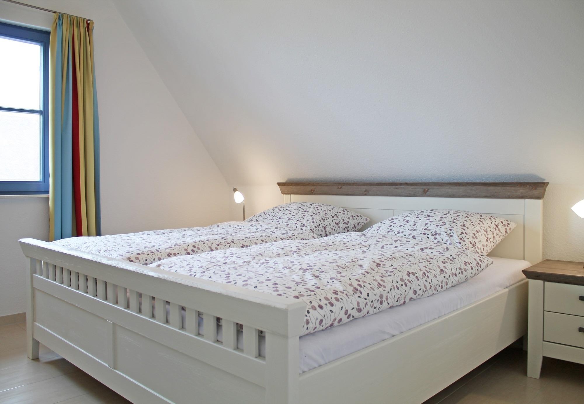 Im Obergeschoss befinden sich zwei Schlafzimmer (1 x Doppelbett, 1 x zwei Einzelbetten). Sowie das Tageslichtbad (Fön) mit Dusche und Badewanne in einer sehr hochwertigen Bauausführung.