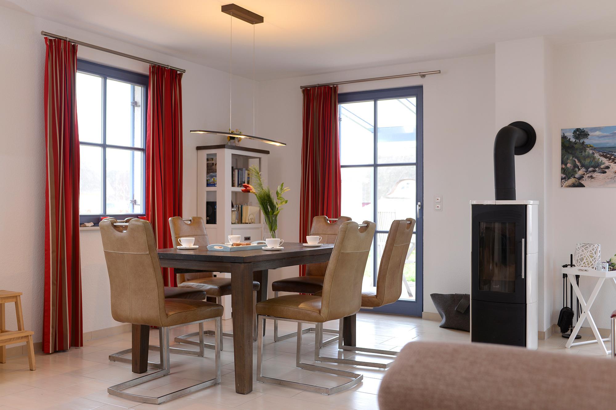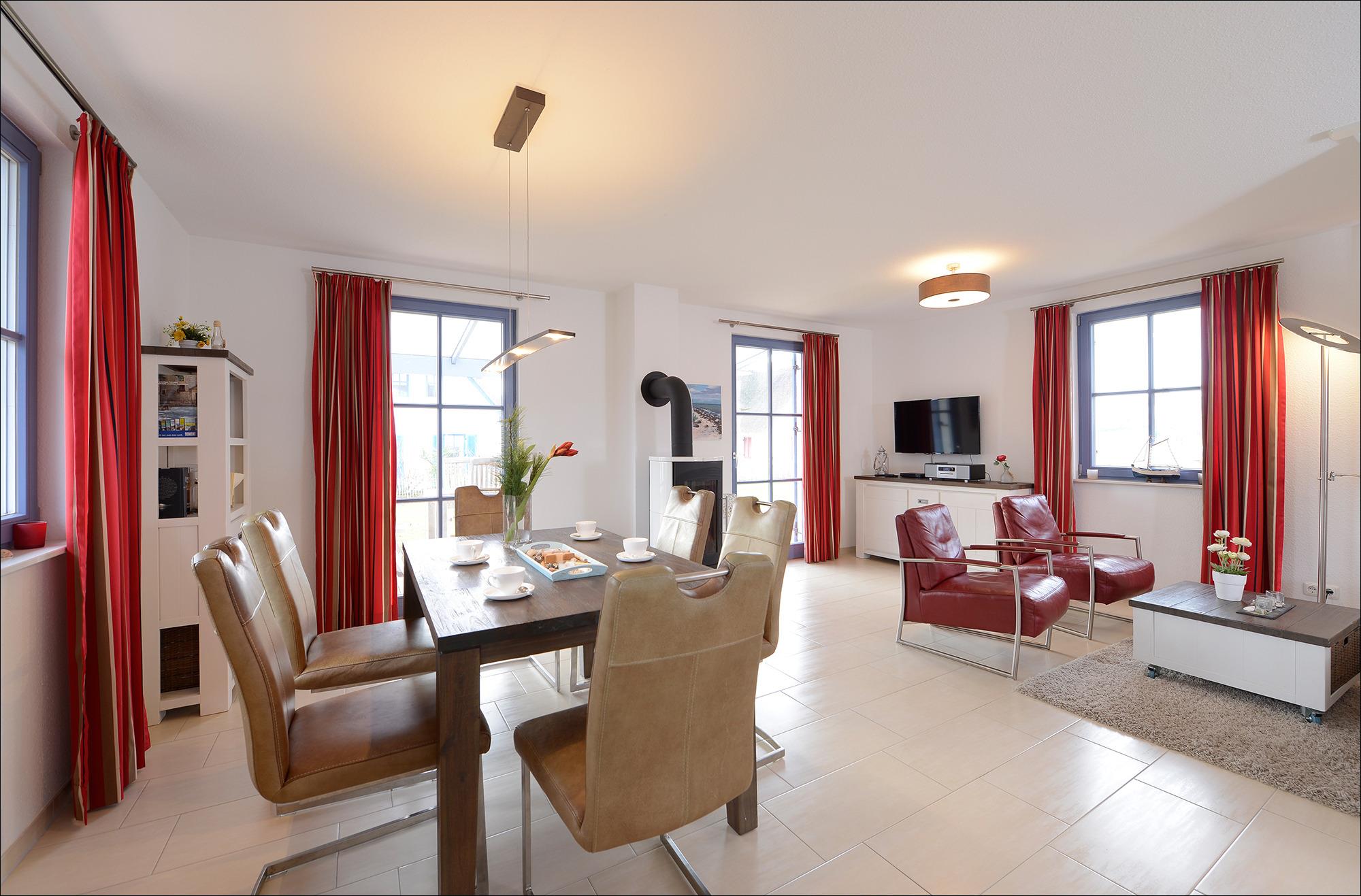 Im Erdgeschoss des Hauses empfängt Sie ein heller und offener Wohn-/ Essbereich (Schlafsofa, Stereo-Anlage mit Bluetoothfunktion, Blue-Ray-Player), inkl. Kaminofen und integrierter Küche (Geschirrspüler, Herd, Kühlschrank mit Gefrierfach, Mikrowelle, Dolce Gusto Kapselautomat, u.v.m.) sowie die Sauna mit zusätzlicher Dusche, das Gäste-WC und der Hauswirtschaftsraum mit Wasch-/ und Trockenautomat. Für Ihre Information und Unterhaltung im Ferienhaus sorgen zahlreiche Reiseführer [&] Karten, Bücher sowie DVDs und Spiele für drinnen und draußen!