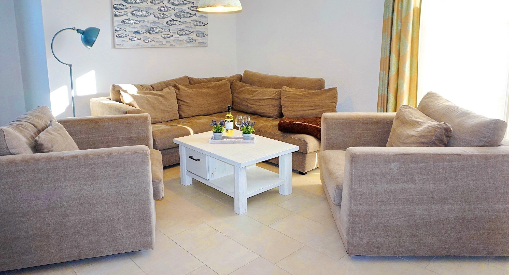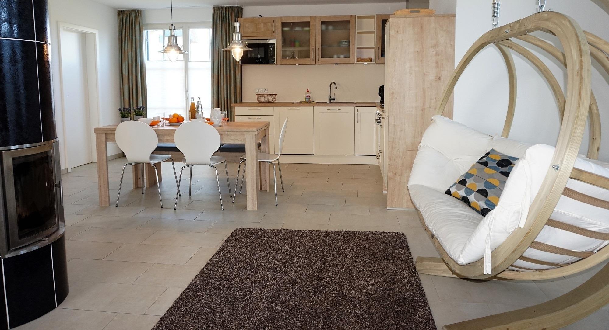 Im Erdgeschoss des Hauses empfängt Sie ein heller und offener Wohn-/ Essbereich mit integrierter moderner Küche. Die hochwertige Ausstattung(Geschirrspüler, Kühlschrank, Herd, Mikrowelle, u.v.m.) lässt keine Wünsche offen. Mit einem guten Buch oder etwas Musik können Sie in der Sitzlounge vor dem Kamin entspannen und Ihre Zeit an der Ostsee genießen. Die gemütliche Sofalandschaft lädt zum Verweilen und gemütlichen Spieleabenden ein.