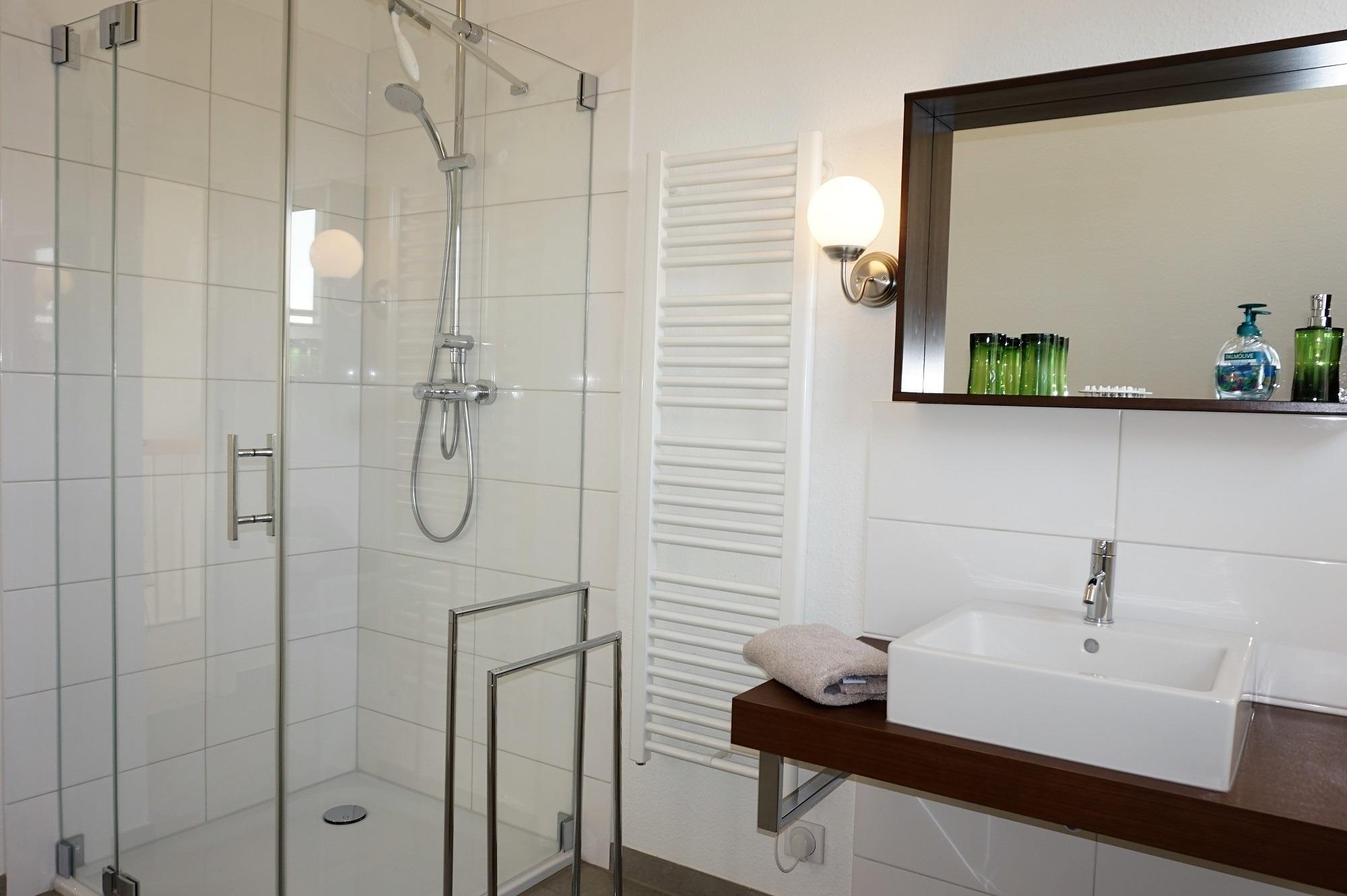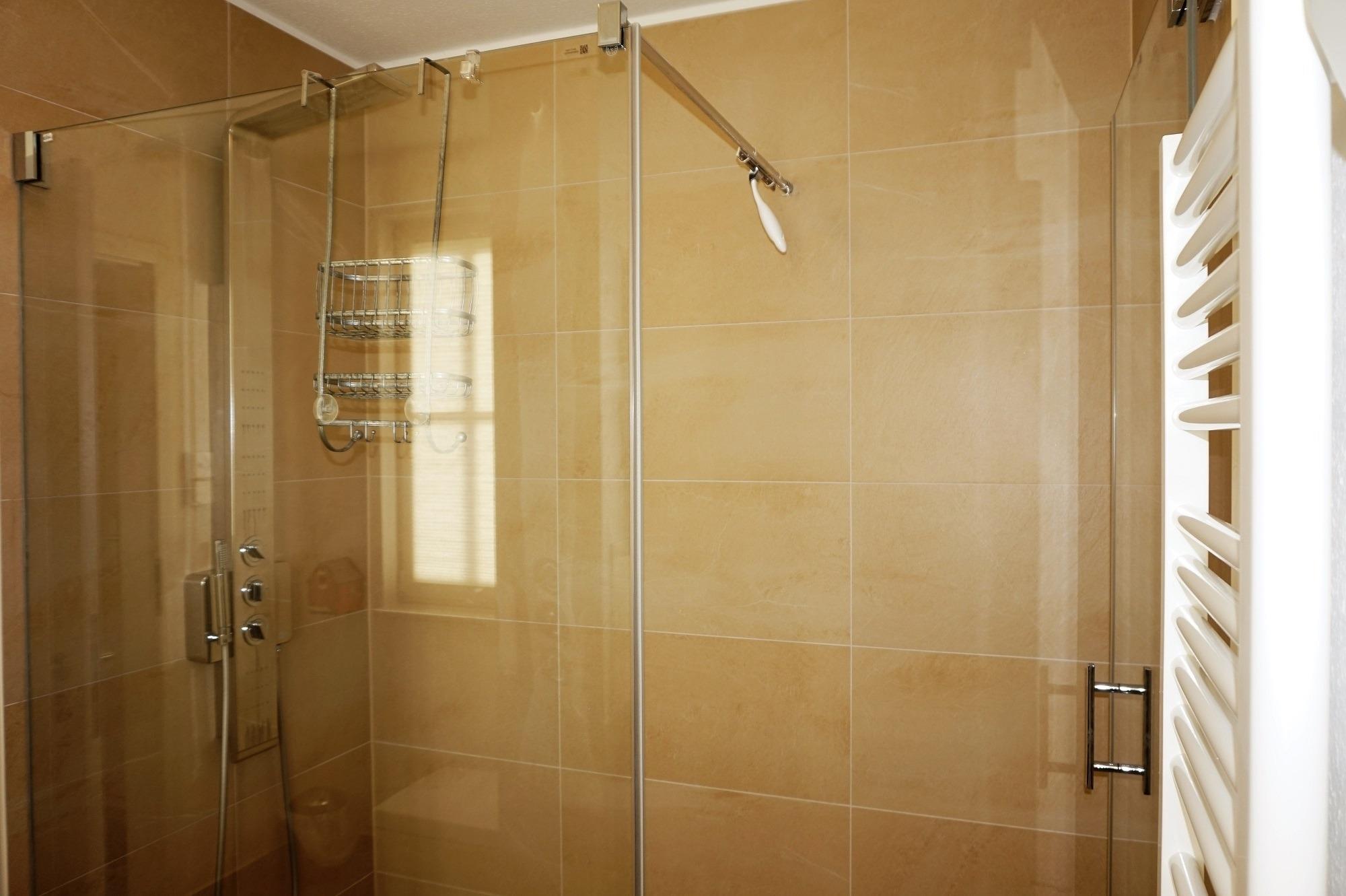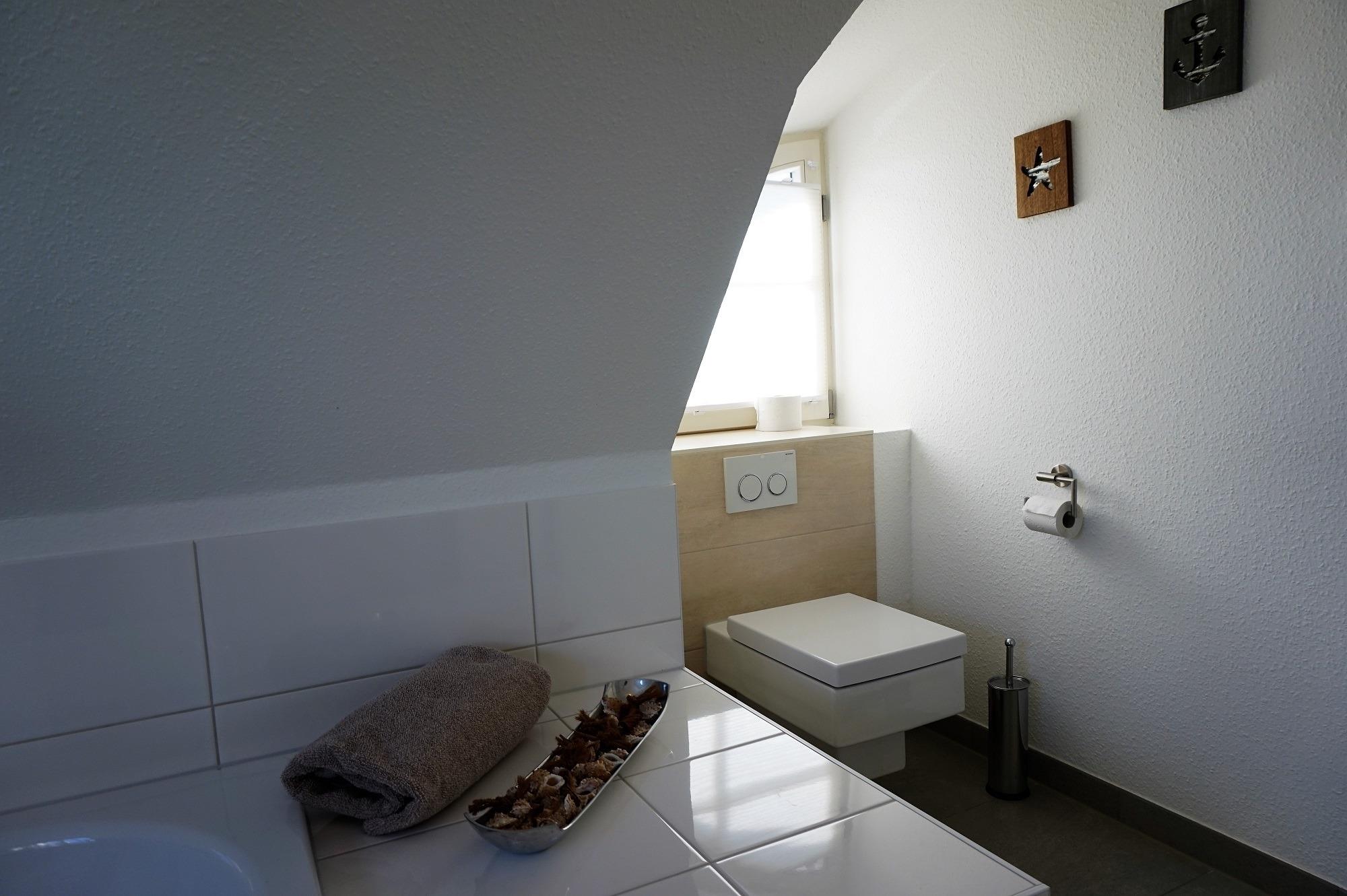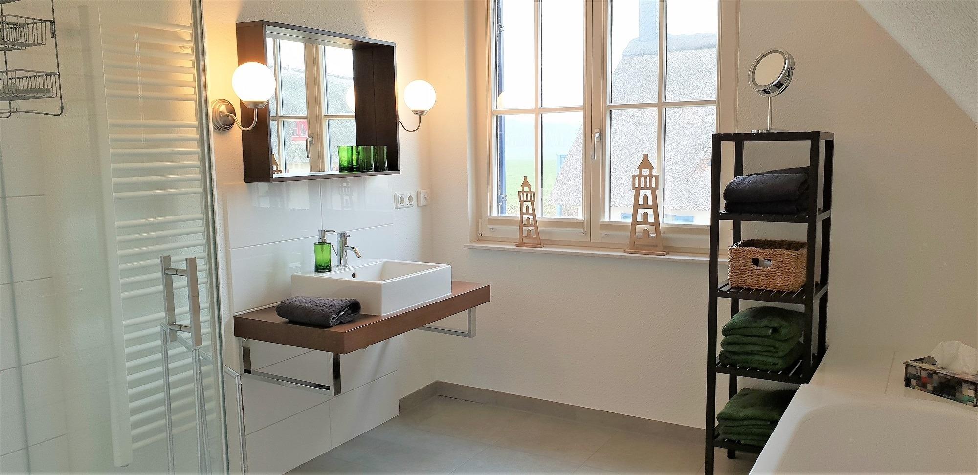 Das Vollbad mit Dusche und Badewanne sowie Haartrockner und Handtuchhalter befindet sich ebenfalls im Obergeschoss.