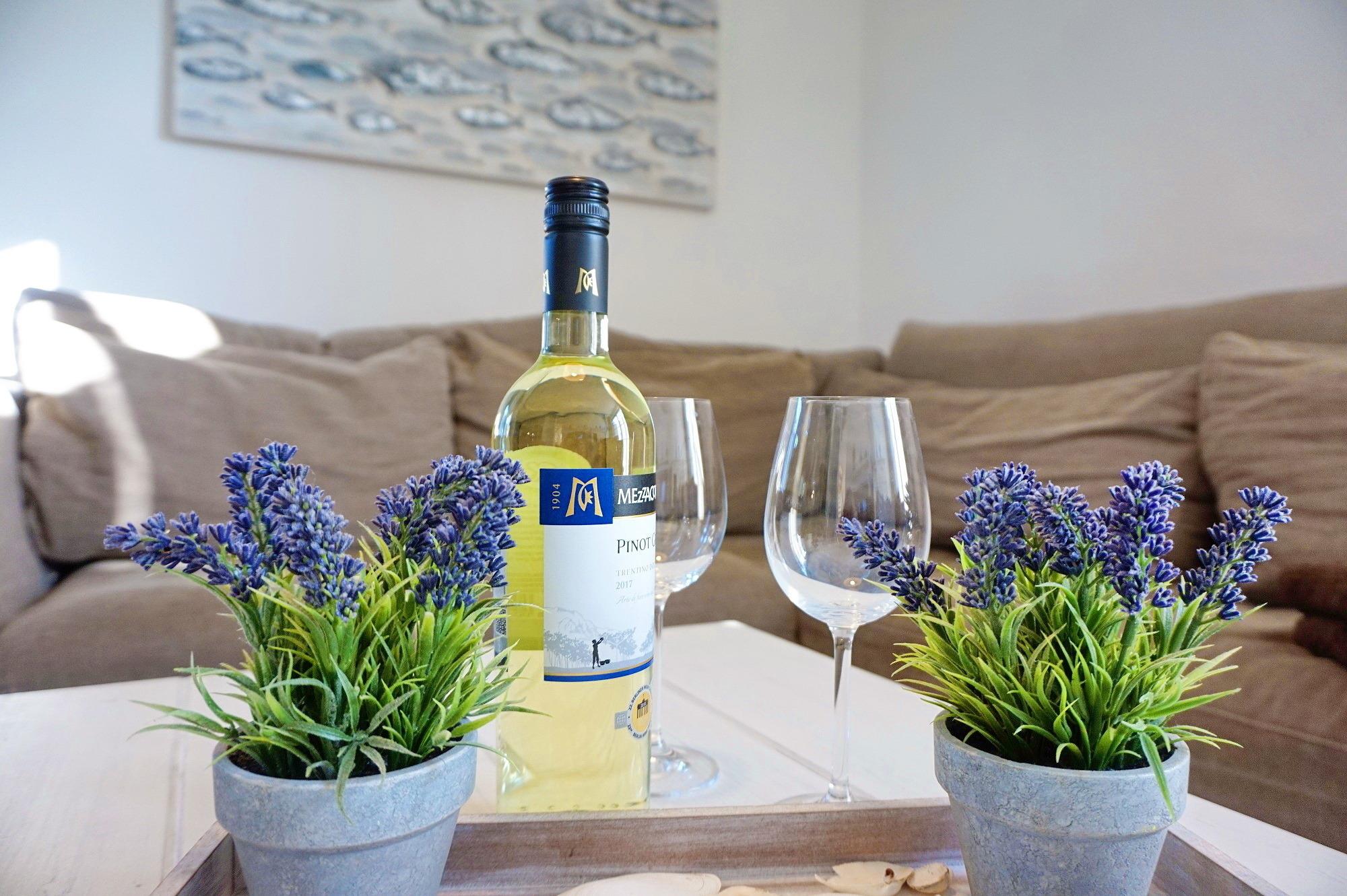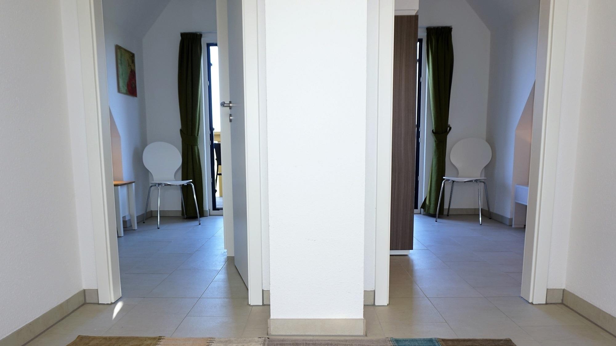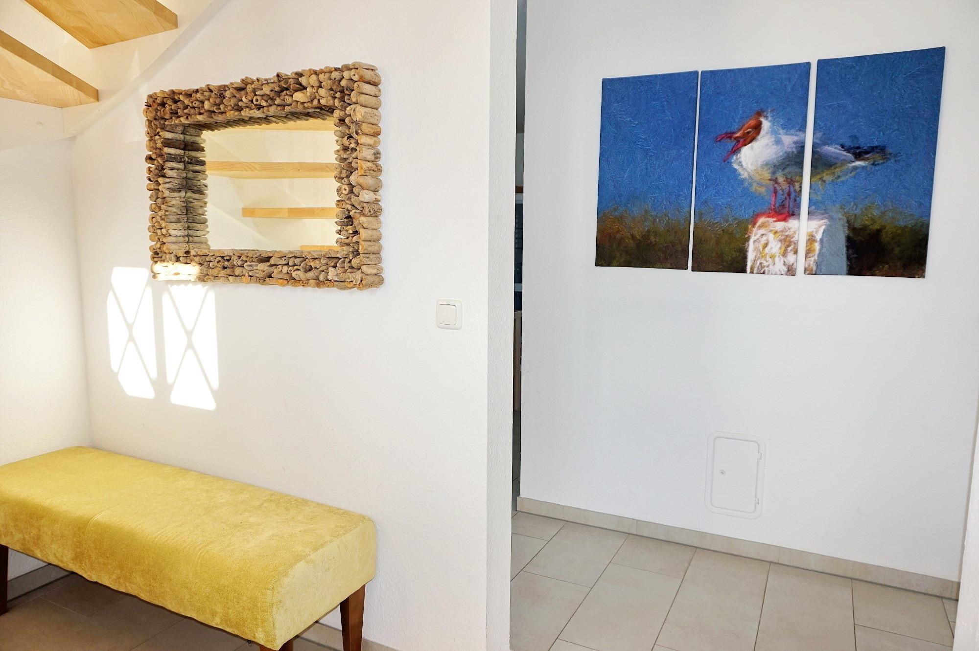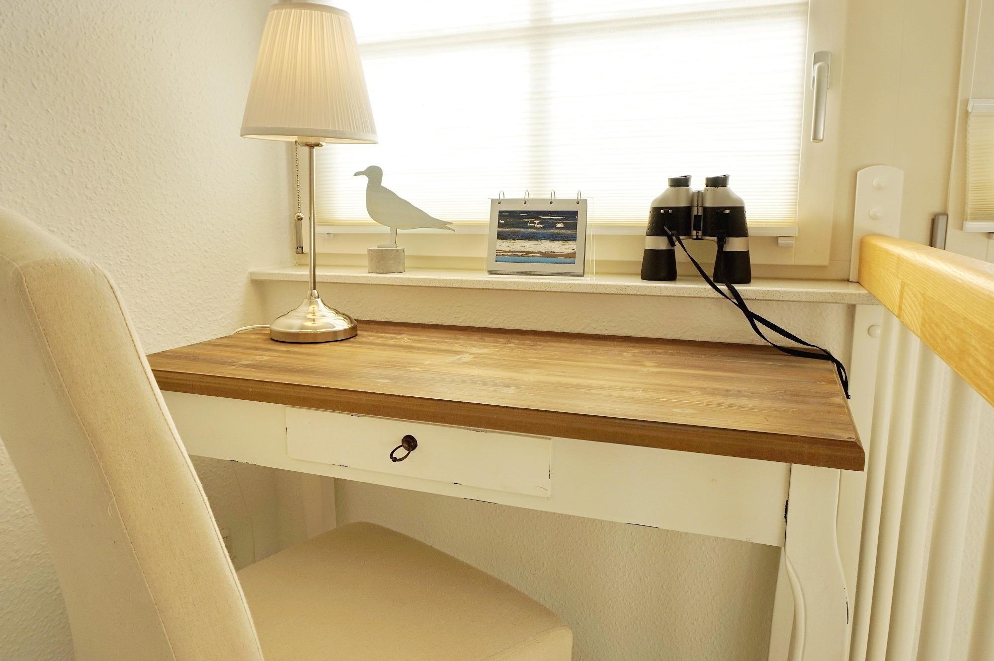 Für Urlaubsgrüße oder kurze Respons am Laptop steht Ihnen ein Schreibtisch im lichtdurchfluteten Flur zur Verfügung.
