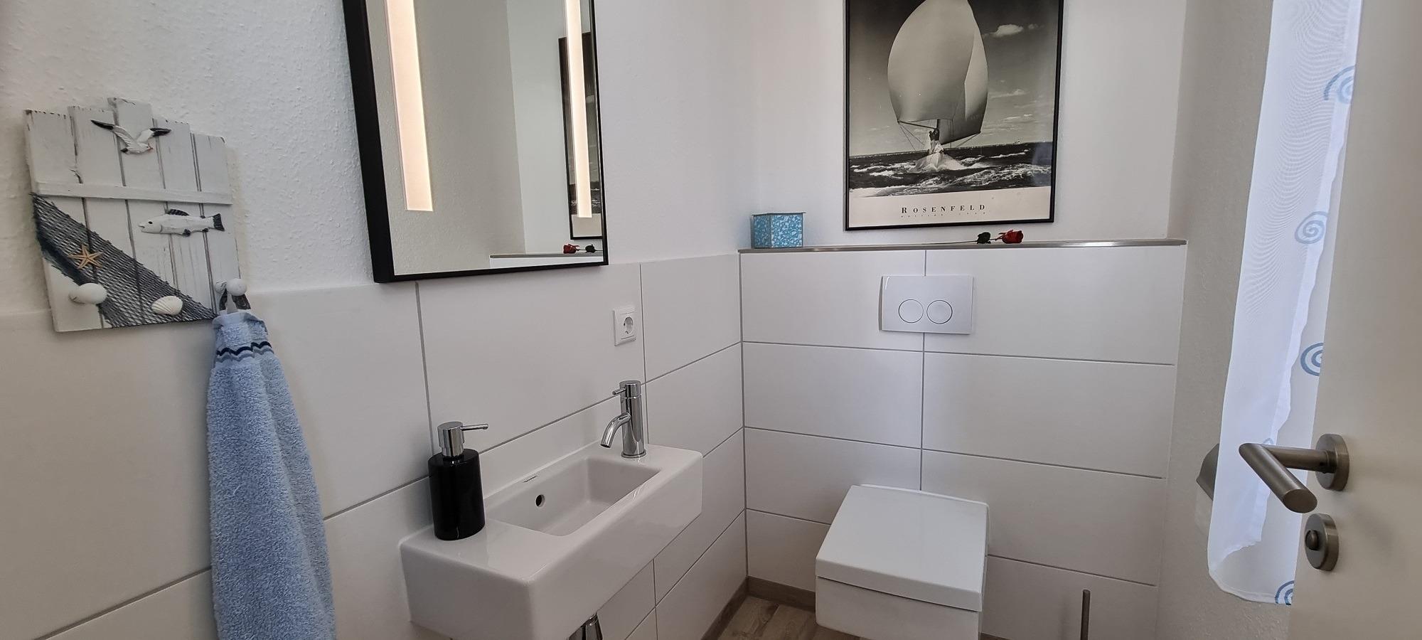 Das Vollbad ist modern mit Badewanne, Dusche und großen Waschtisch ausgestattet. Hier kann der Urlaubstag starten.