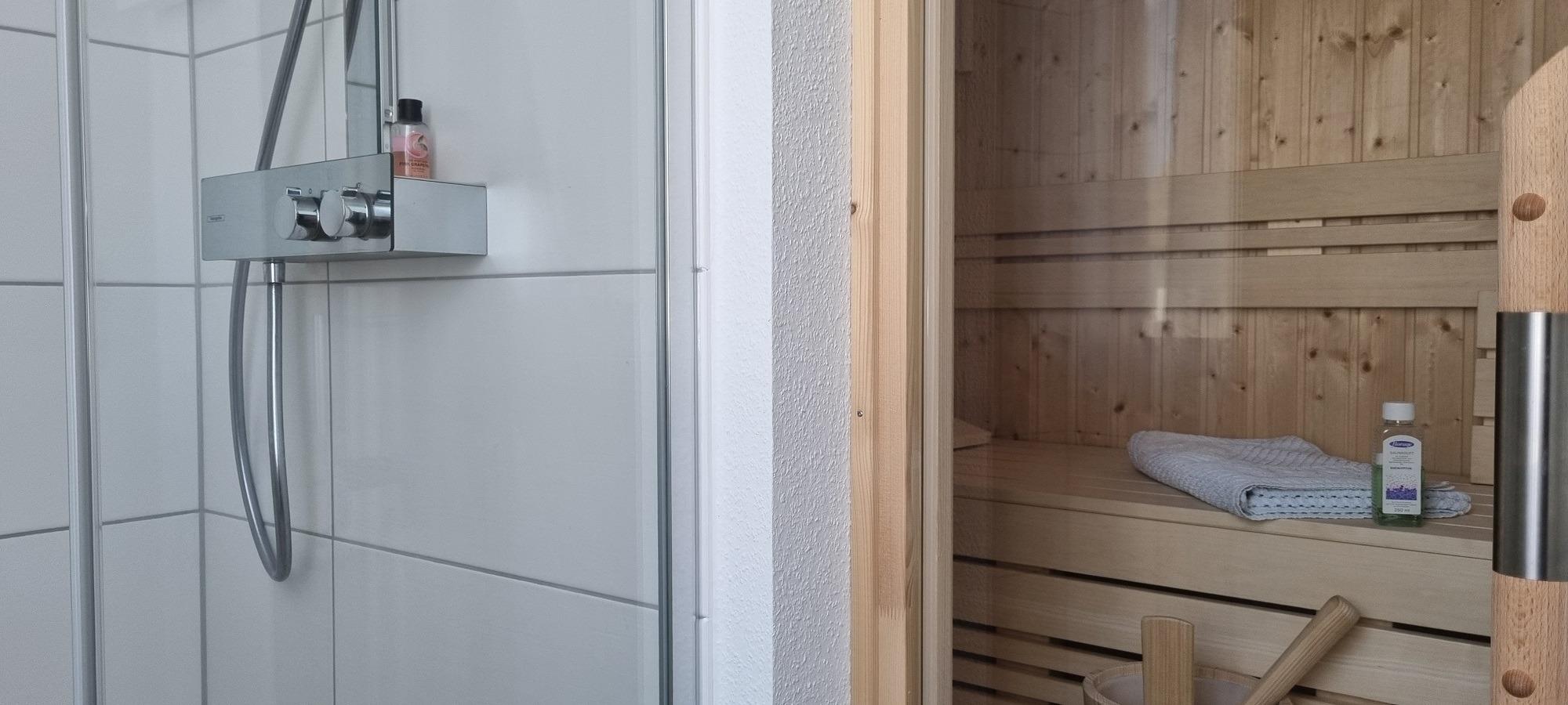 Im Erdgeschoss befindet sich zudem die Sauna mit Wellnessdusche und ein separates Gäste-WC.