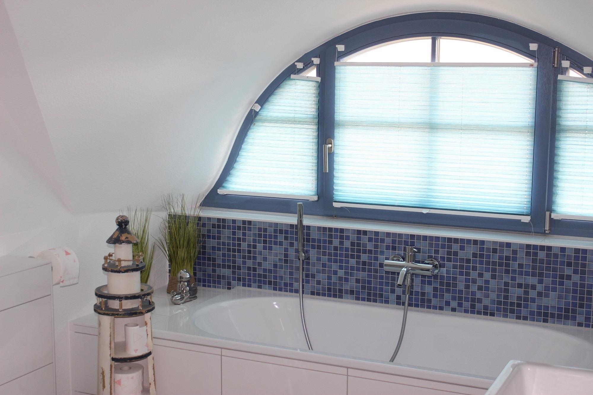 Im Obergeschoss des Ferienhauses befinden sich die drei Schlafzimmer und das Vollbad mit Badewanne und Dusche.