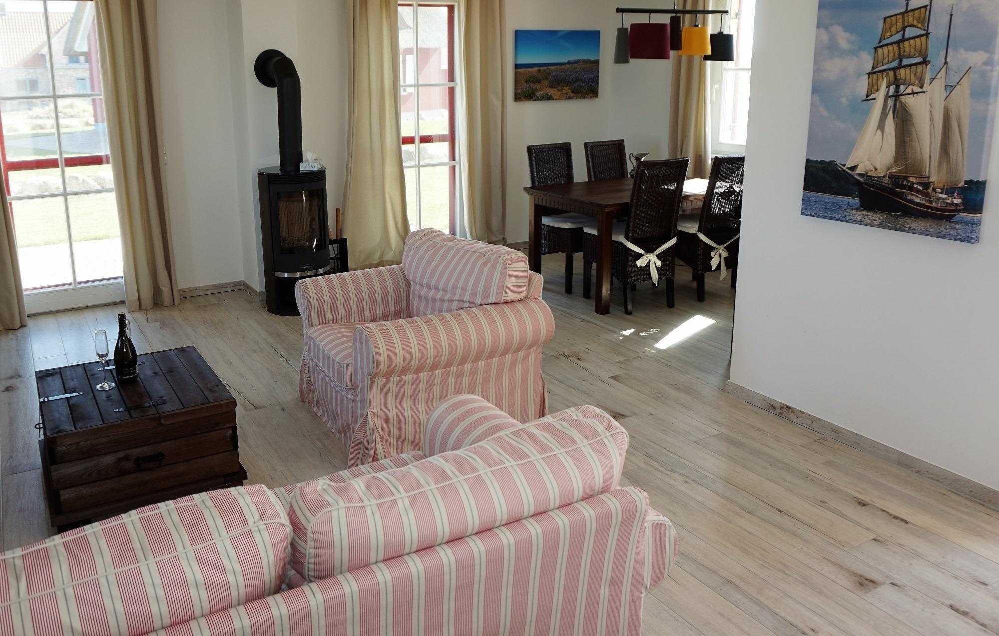 Kleintiere sind auf Anfrage möglich, jedoch ist das Rauchen nicht gestattet. Das Reethaus lädt zu jeder Jahreszeit an die Ostsee ein, auch die kälteren und schmuddeligen Tage lassen sich hier gut verbringen, denn sowohl eine Sauna als auch ein Kaminofen sind vorhanden. Im Sommer lädt der nahe liegende Strand ein, aber auch der umlaufen Garten lädt zum Verweilen ein. Es erwartet Sie eine komplett geflieste, mit Fußbodenheizung ausgestattete Doppelhaushälfte. Zur hochwertigen Innenausstattung gehören eine Echtholzküche, aber auch weitere Echtholzmöbel, eine Sauna und ein Kaminofen, der wohlige Wärme in der kalten Jahreszeit schenkt, Kaminholz ist mitzubringen. Die roten Echtholzsprossenfenster und Fensterläden unterstreichen den Charme des Feriendomizils. Das Erdgeschoss empfängt Sie mit einem großen Wohn- und Essbereich mit Kaminofen. Die separate Küche ist voll ausgestattet mit einem hochwertigen Backofen und Cerankochfeld, einem Kühlschrank mit Gefrierfach, einem Geschirrspüler, Kaffeemaschine, Kapselkaffeemaschine, Toaster, Wasserkocher und Mikrowelle. Die zwei Sofas und er Sessel laden zu einem gemütlichen Abend ein. Ein Flach-TV, Blue-Ray-Player und Bluetooth-Stereoanlage bieten Unterhaltung, zudem stehen einige Bücher, Reiseführer und Spiele zur Verfügung. Der Essbereich bietet Platz für 4 Personen, ein Kinderhochstuhl ist zusätzlich vorhanden. Weiterhin befinden sich im EG ein Tageslicht-Gäste-WC und ein Hauswirtschaftsraum mit Waschtrockner, Wäscheständer, Staubsauger und Putzutensilien. Im Obergeschoss finden Sie zwei Schlafzimmer (je X qm) und ein Bad mit Sauna vor.