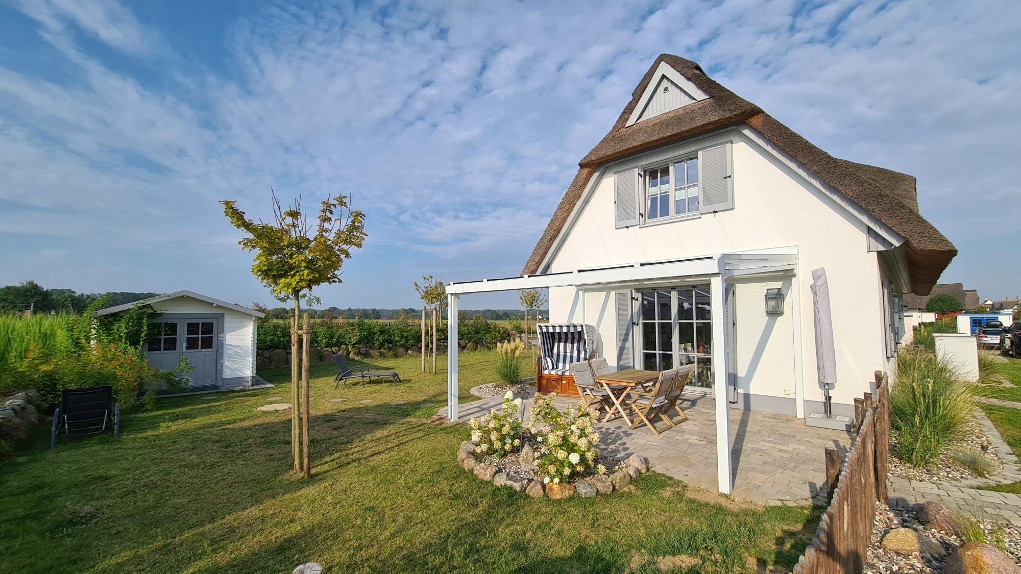Das Gartenhäuschen im Garten bietet nicht nur Unterstellmöglichkeit für mitgebrachte Räder. Ein elektrischer Grill und Holzmöbel für die umlaufende Terrasse finden dort Ihren Platz. Genießen Sie den Wiesenblick vom hauseigenen Strandkorb.