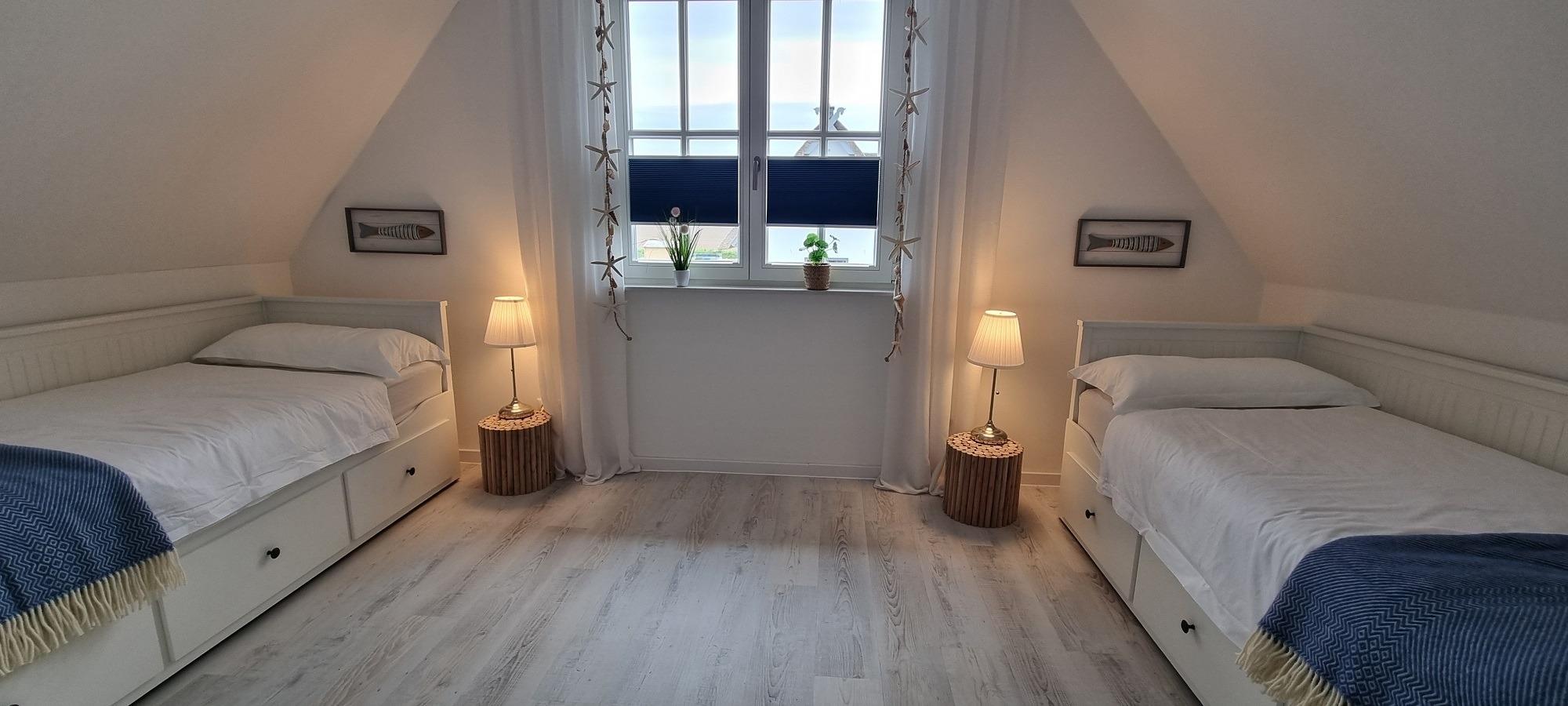 Die Schlafzimmer sind mit einem Doppelbett und zwei Einzelbetten und viel Staumöglichkeiten eingerichtet. Bei Anreise sind die Betten bereits bezogen und Handtücher liegen bereit.