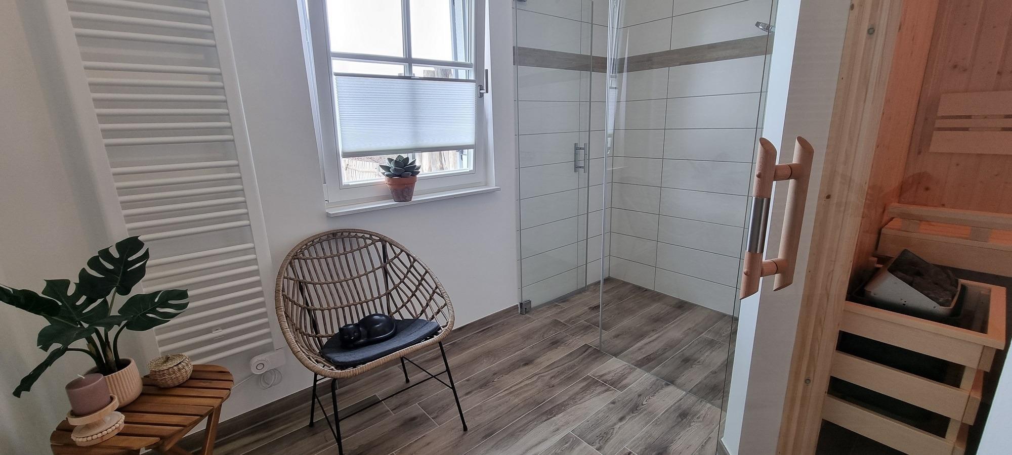 Die moderne Küchenzeile ist voll ausgestattet. Im Erdgeschoss befindet sich des Weiteren das Wellnessbad mit Sauna und bodengleicher Dusche. Hier können Sie von Ihrem Alltag entfliehen. Das Gäste-WC und der Hauswirtschaftsraum mit Waschmaschine[nbsp] runden das Erdgeschoss ab.