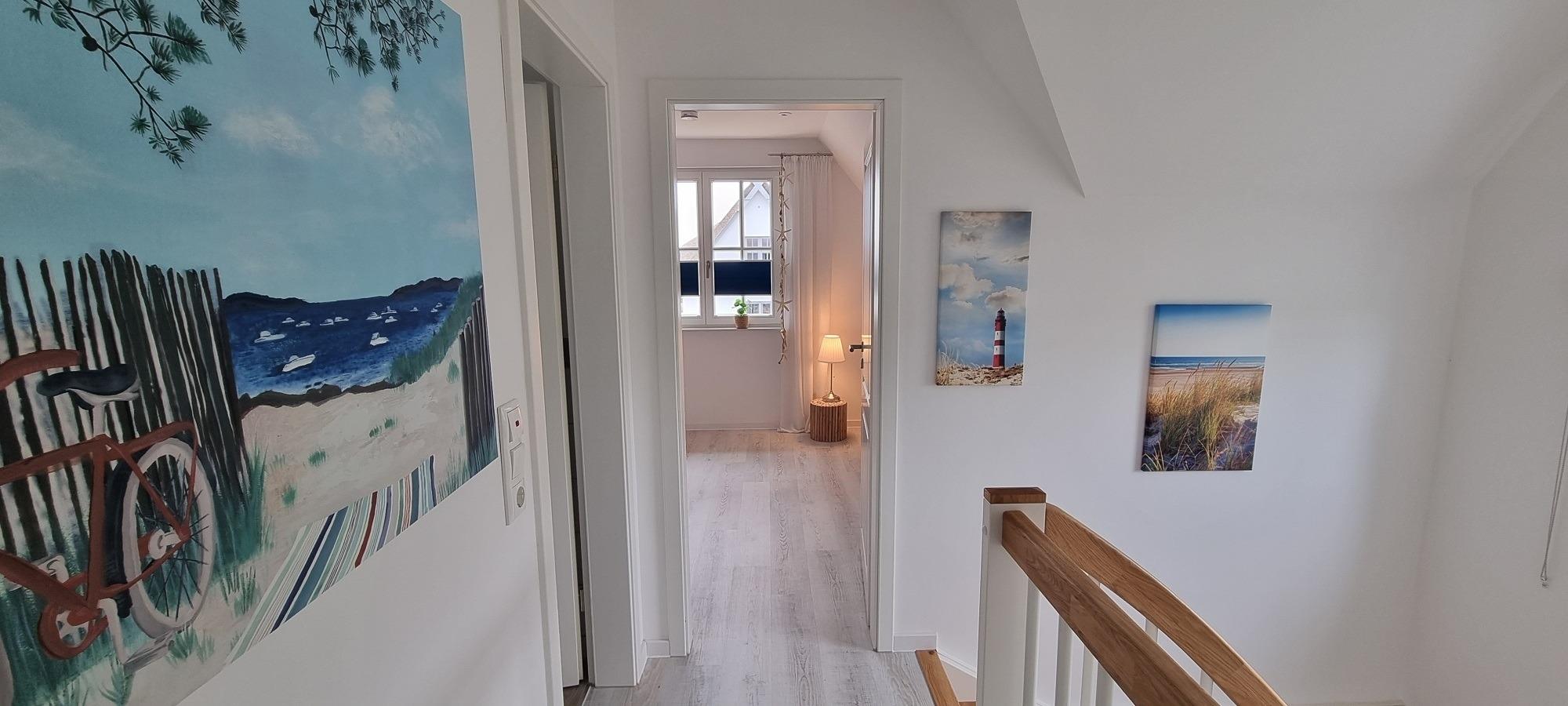 Der helle Treppenaufgang führt ins Übergeschoss mit zwei Schlafzimmern und modernen Duschbad.