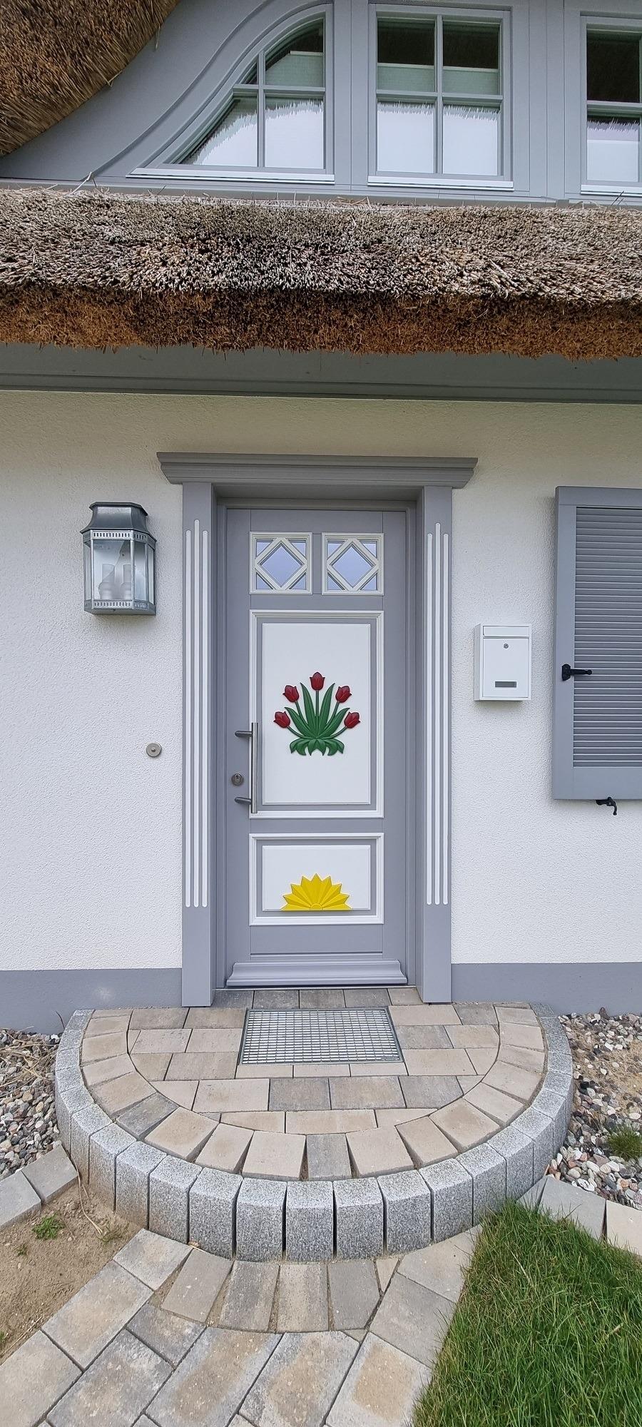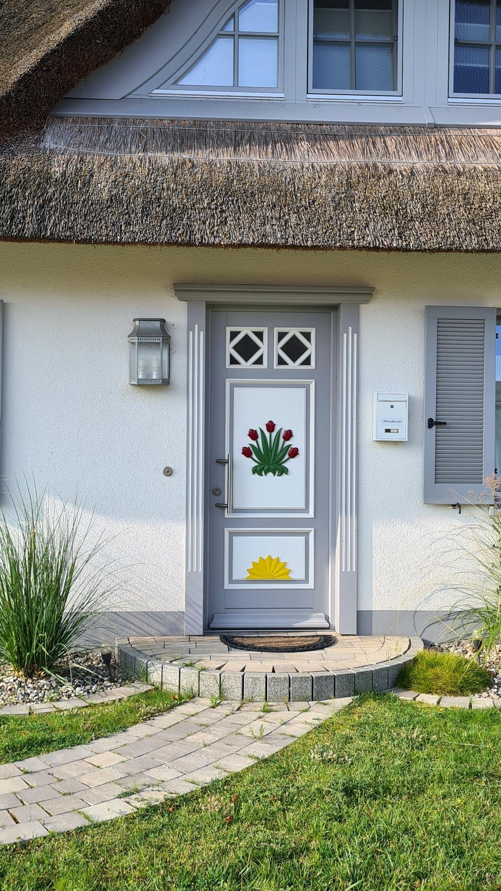 Die typische Seemannstür mit den schönen Ornamenten heißt Sie willkommen im Haus "Strandmuschel".