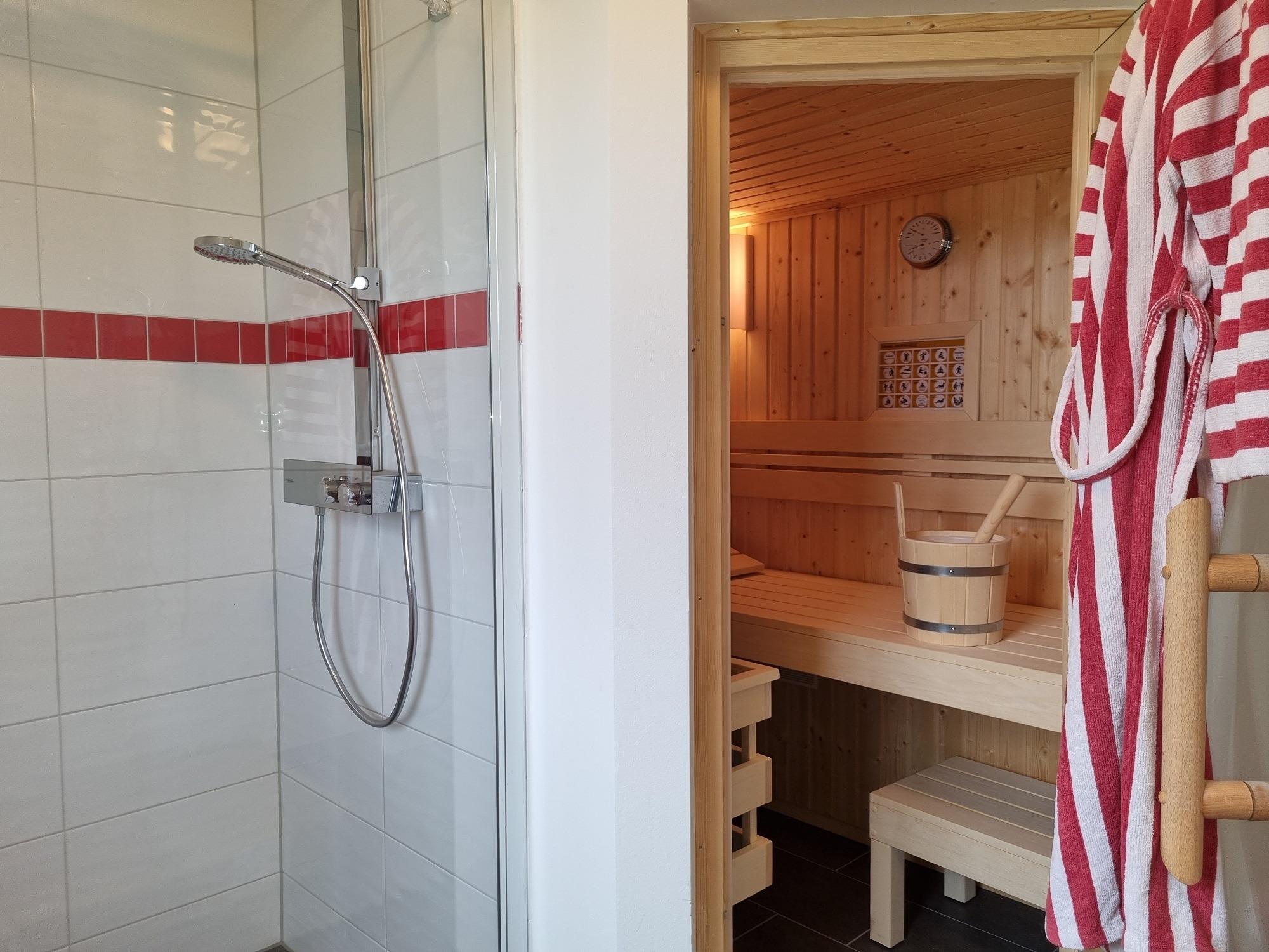 Zudem befindet sich im Erdgeschoss ein eigenes Badzimmer mit Walk-In Regenwalddusche sowie eine Sauna, in der Sie sich nach einem aktiven Urlaubstag entspannen können. Ferner befindet sich im Erdgeschoss ein Hauswirtschaftsraum mit Waschmaschine, Zustellbett, Sitzauflagen und Haushaltsreinigern.
