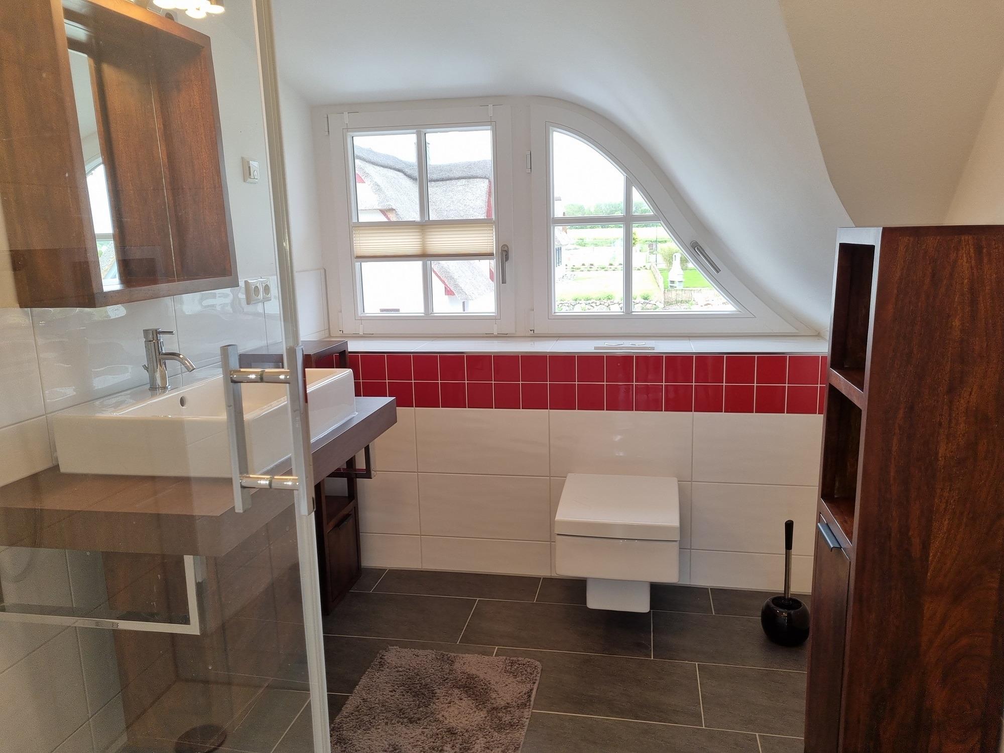 Im Erdgeschoß des Reethauses befindet sich der Eingangsbereich mit Sauberlauf und separater Gästetoilette mit Waschbecken.