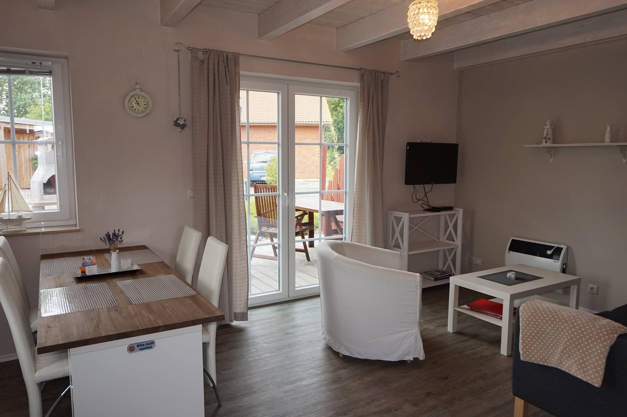 Die Doppelhaushälfte - Haus 23a - hat eine Wohnfläche von ca. 54 qm, ist neu und modern eingerichtet. Im Erdgeschoss befinden sich ein offenes Wohn- und Esszimmer mit Küche, Schlafzimmer (zwei Einzelbetten), Flur und Bad, im Obergeschoss eine große Schlafgalerie (Doppelbett) und Leseecke. Im Wohnbereich steht Ihnen ein Flachbildfernseher mit Satellitenempfang zur Verfügung. Das Bad hat eine große bodentiefe/ barrierefreie Dusche.