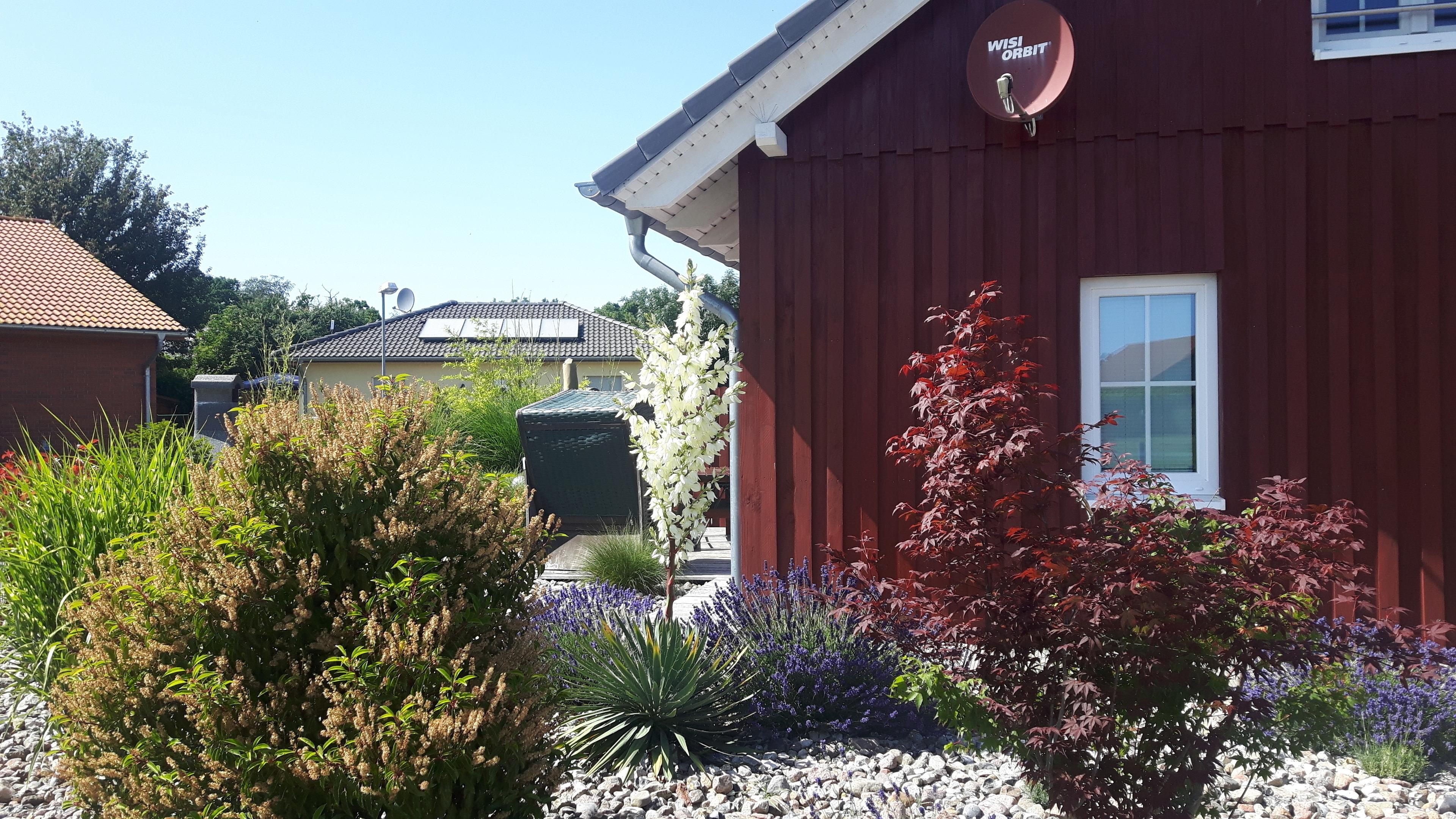 Durch die original schwedenrote (faluröd) Holzfassade, den weißen Türen und Sprossenfenstern, der liebevoll angelegten Außenanlage, wirkt das Ferienhaus freundlich und einladend. Die Terrassen (mit Gartenmöbeln ausgestattet) und Stege sind aus Holz, der überwiegende Teil des vollständig umzäunten Grundstücks ist mit Dekorsteinen ausgelegt und dezent bepflanzt. Durch die Süd-Westausrichtung des Hauses können Sie bis weit in die Abendstunden auf der Terrasse die Sonne genießen.