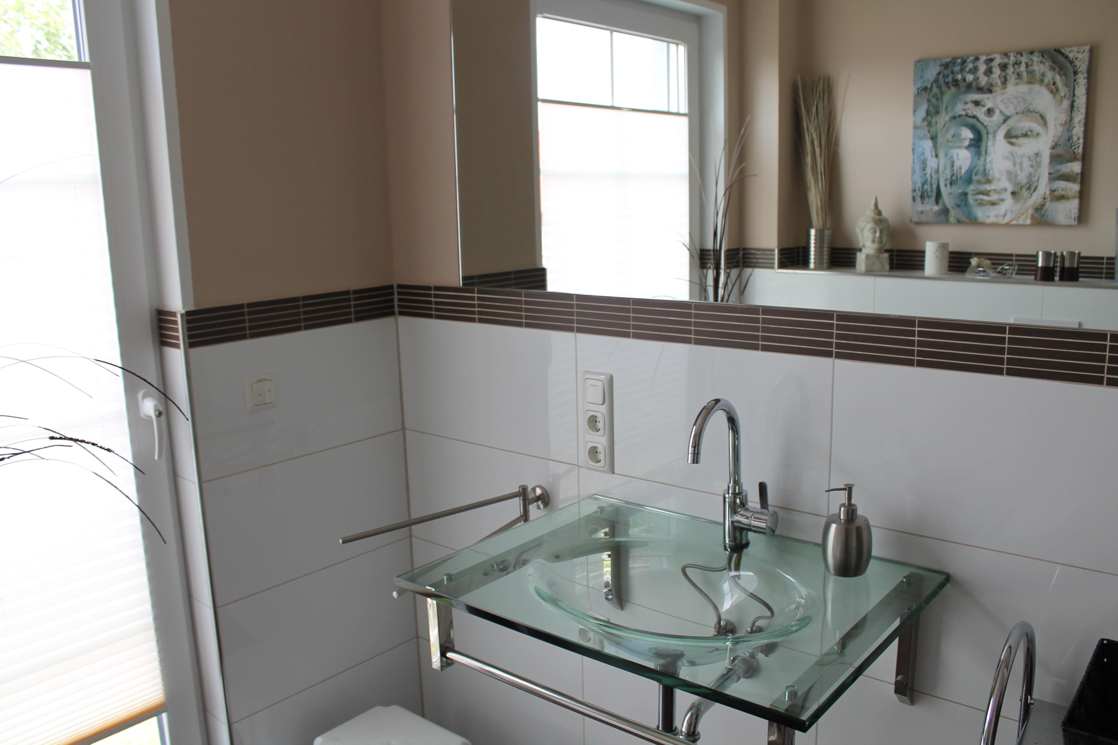 Duschbäder im EG und OG mit Glasduschen, Tageslicht, Außenjalousien, Toilette.