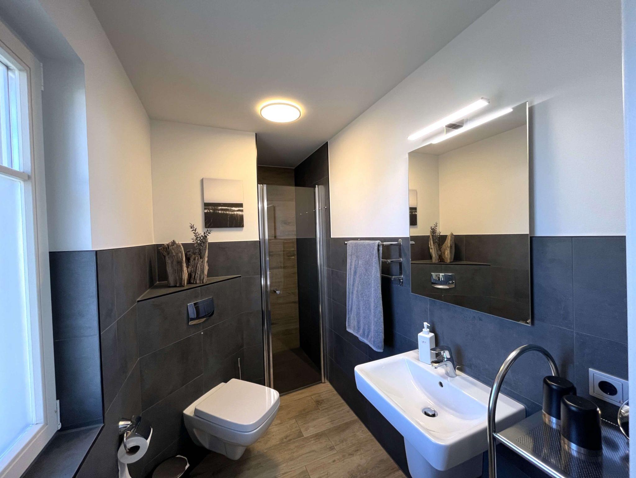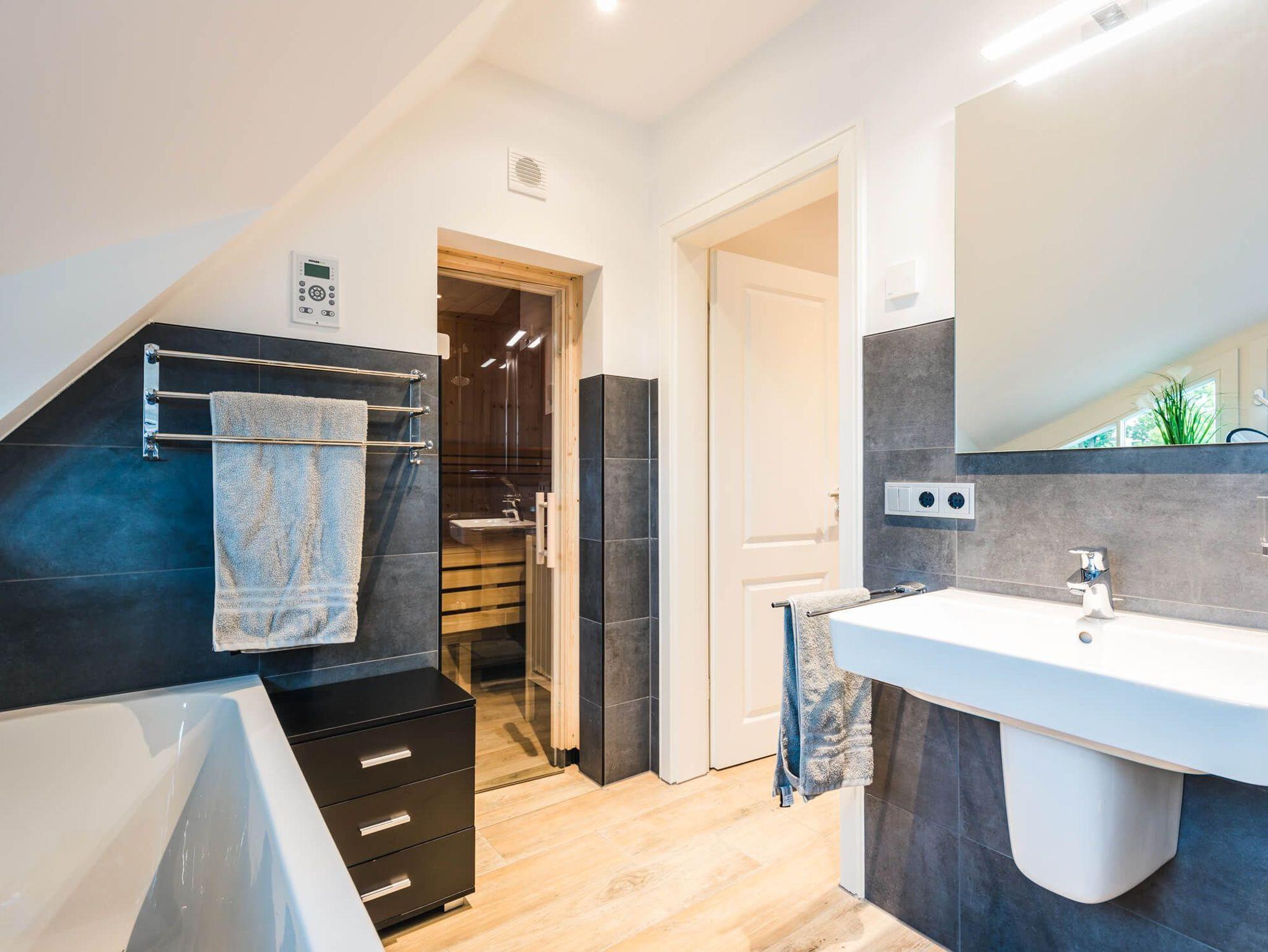Auf der zweiten Ebene befindet sich das Badezimmer mit bodengleicher Dusche sowie einer Badewanne und finnischer Sauna.
