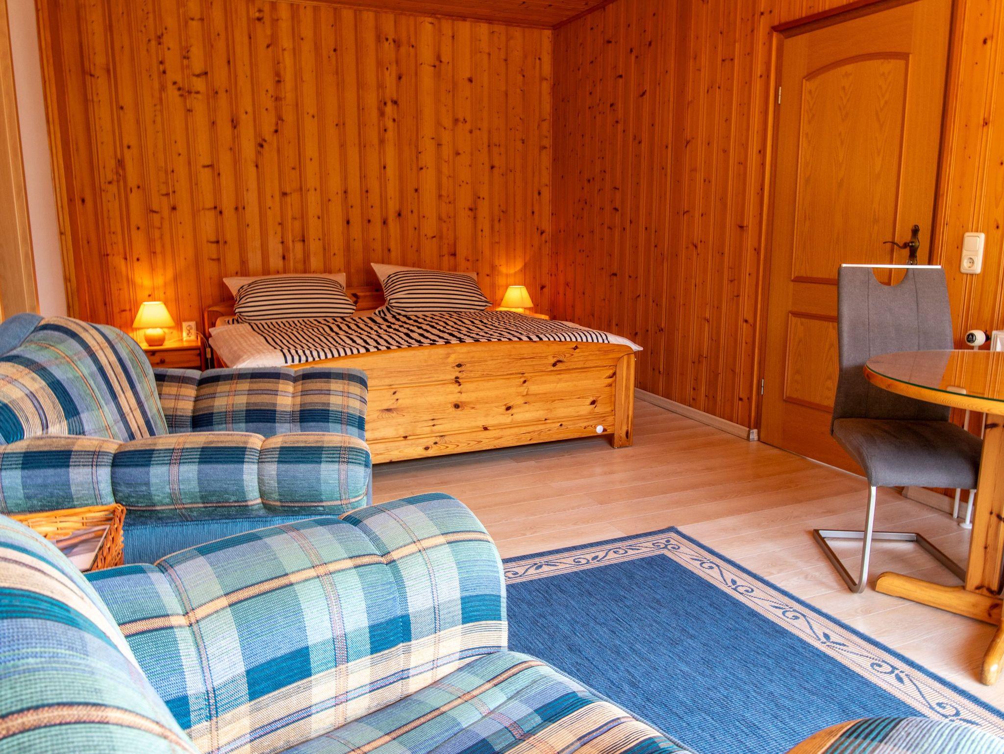 Sie erreichen die Ferienwohnung 1 über einen separaten Eingang am Haus der Vermieter. Im Eingangsbereich erwartet sie eine kleine Küche mit 2-Platten-Kochfeld, Kühlschrank, Kaffeemaschine, Toaster, Wasserkocher und Kochutensilien. Das gemütliche Wohnzimmer verfügt über zwei Sessel, TV, Esstisch und ein Doppelbett (180x200). Von hieraus erreichen sie die Terrasse mit Sitzmöglichkeit und das Bad mit Dusche und WC.