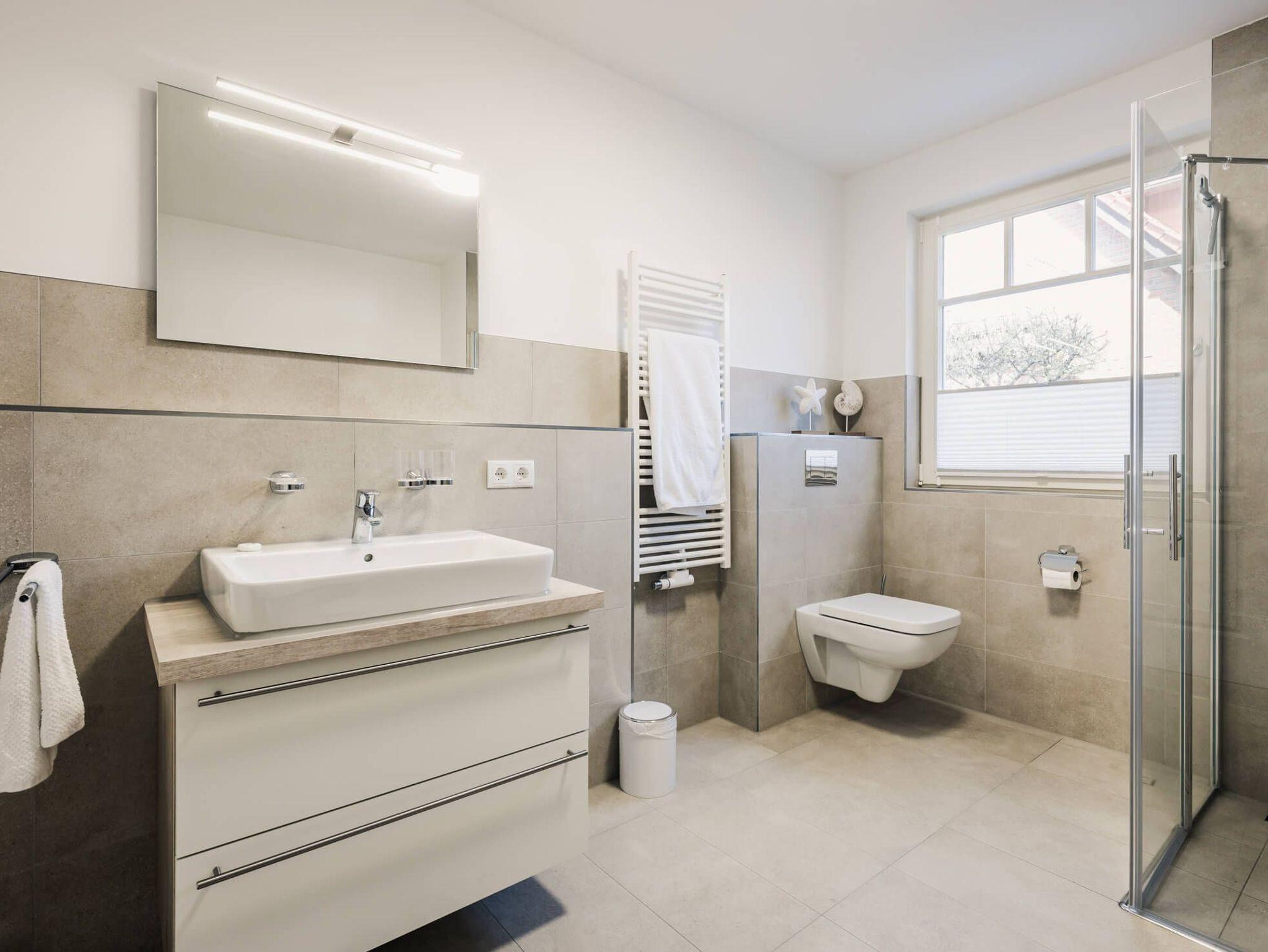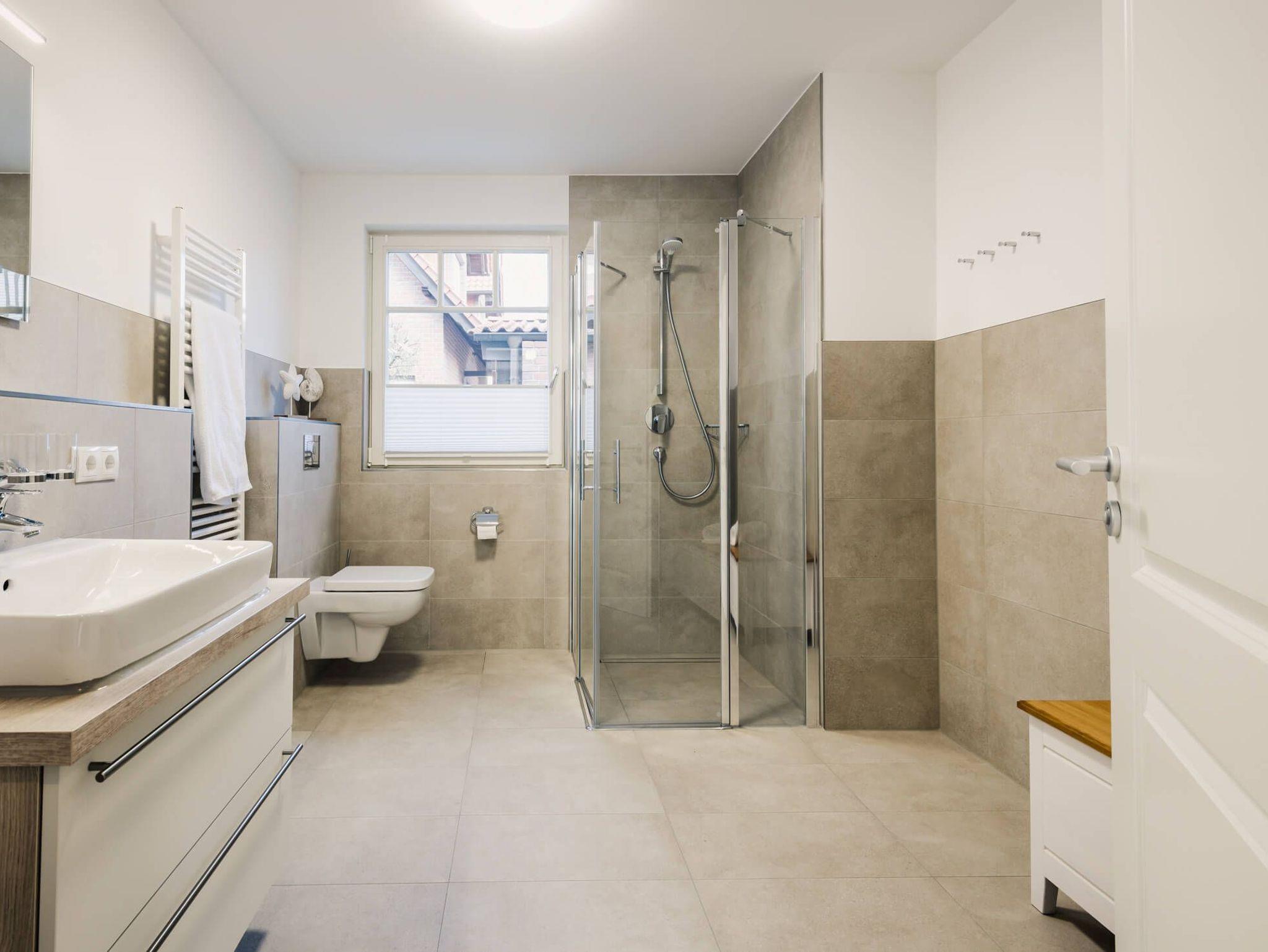 Das moderne Design der Wohnung setzt sich im Tageslichtbad mit bodentiefer Dusche fort. Wie in der gesamten Wohnung genießen Sie auch hier den Komfort der Fußbodenheizung.