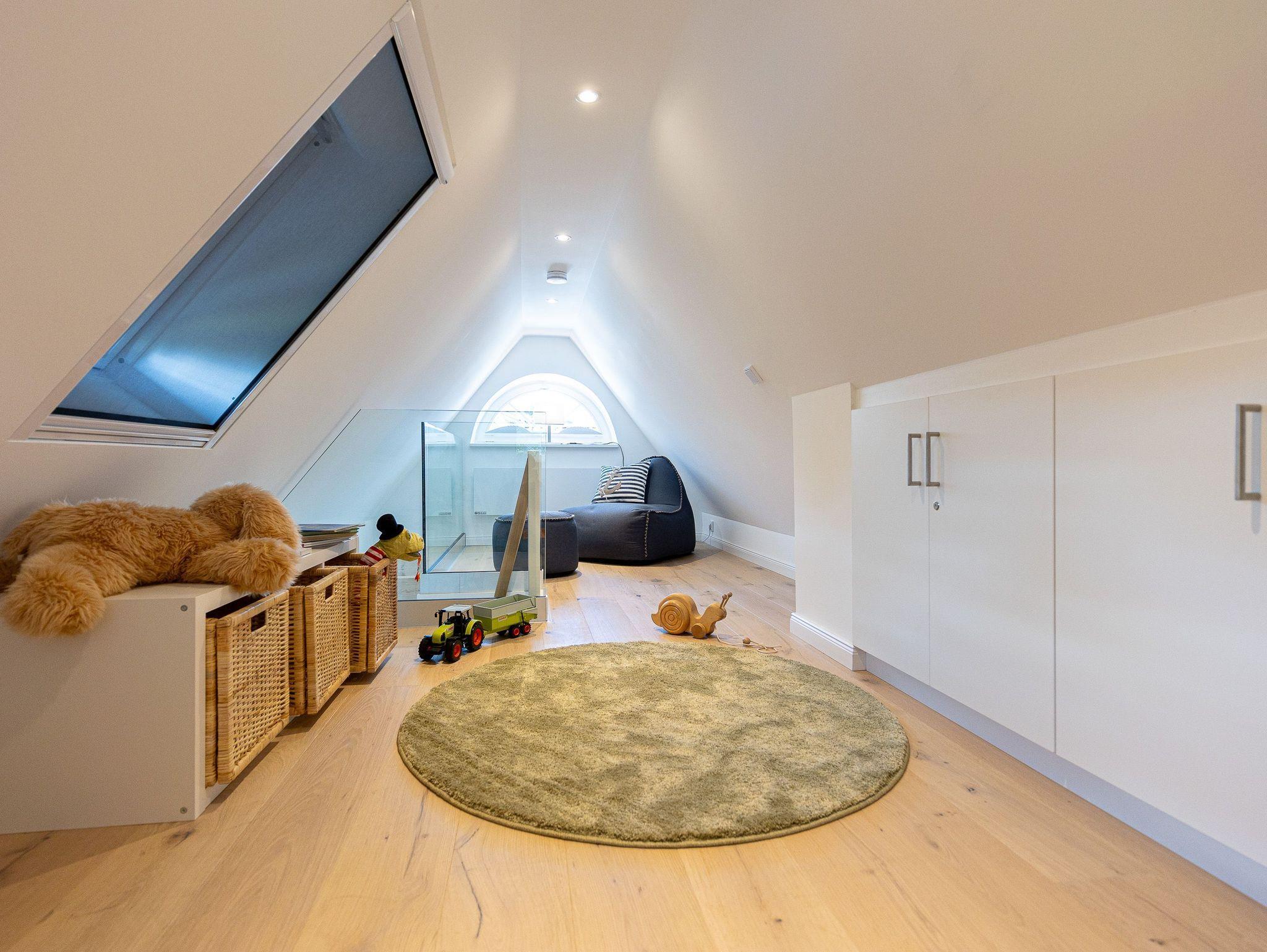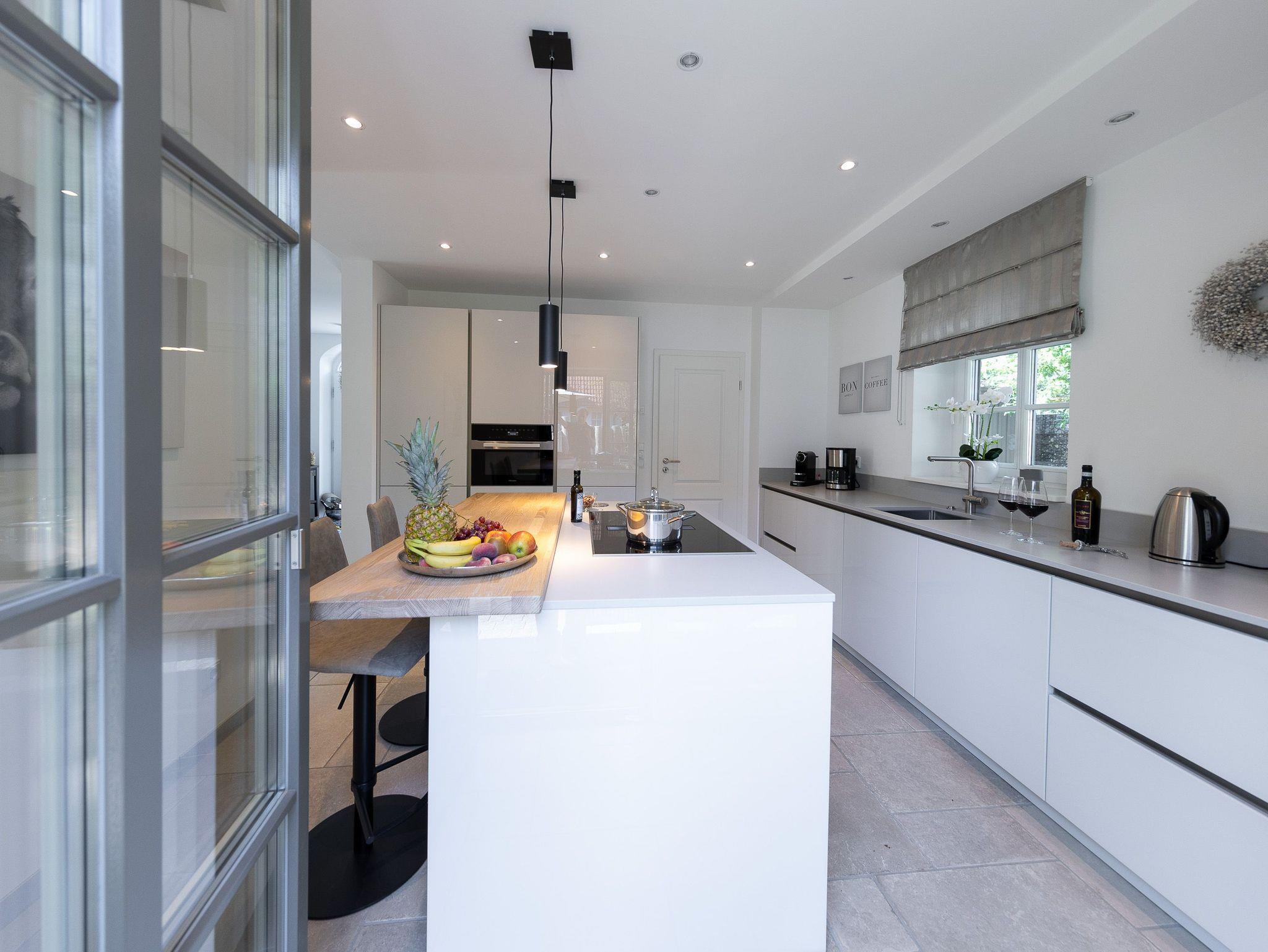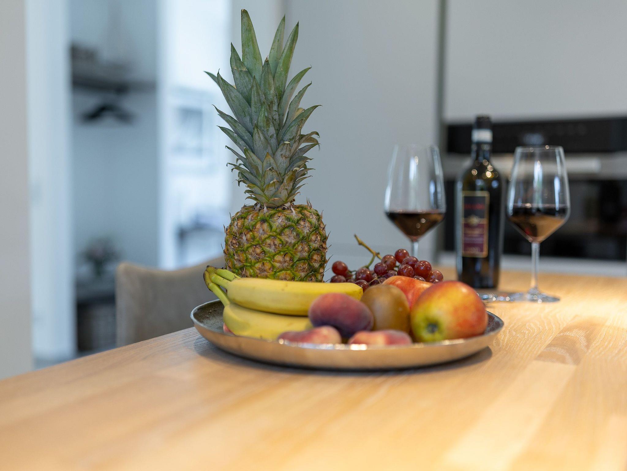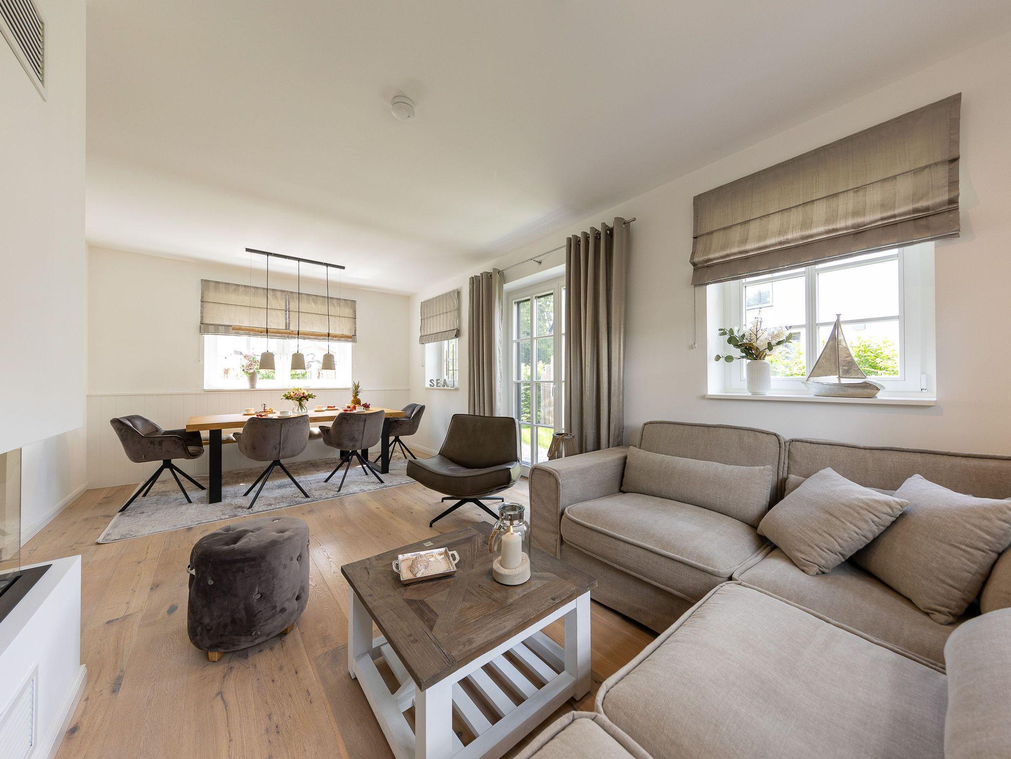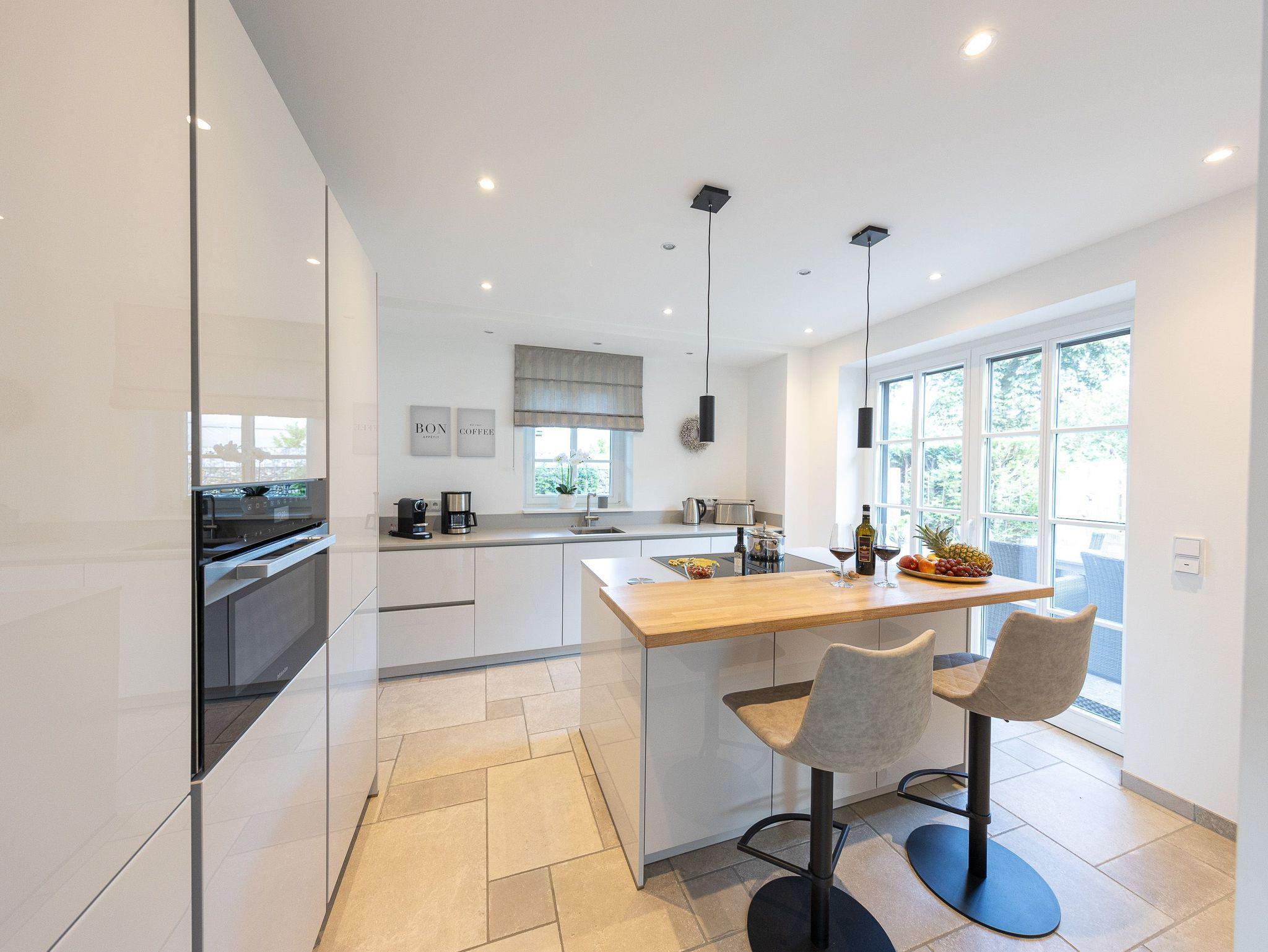 Im Inneren des Hauses gibt es eine große offene Wohnküche, die mit modernen Miele Geräten sowie hochwertigem Geschirr ausgestattet ist. Der Essbereich bietet Platz bietet Platz für eine große Familie oder eine Gruppe von Freunden und lädt zu gemütlichen Abenden ein. Ein bequemes Wohnzimmer mit komfortablen Sofa ermöglicht entspannte Abende vor dem Fernseher oder vor dem Kaminfeuer.