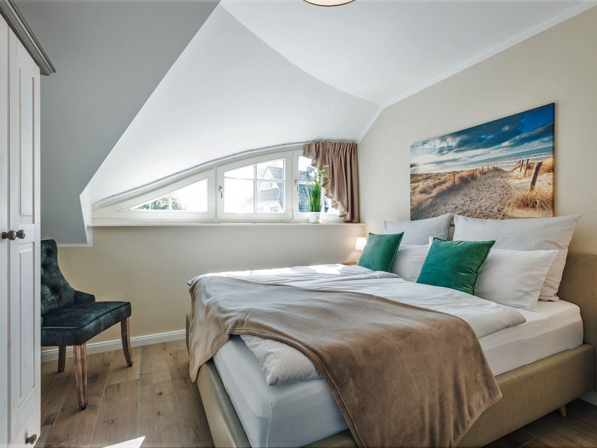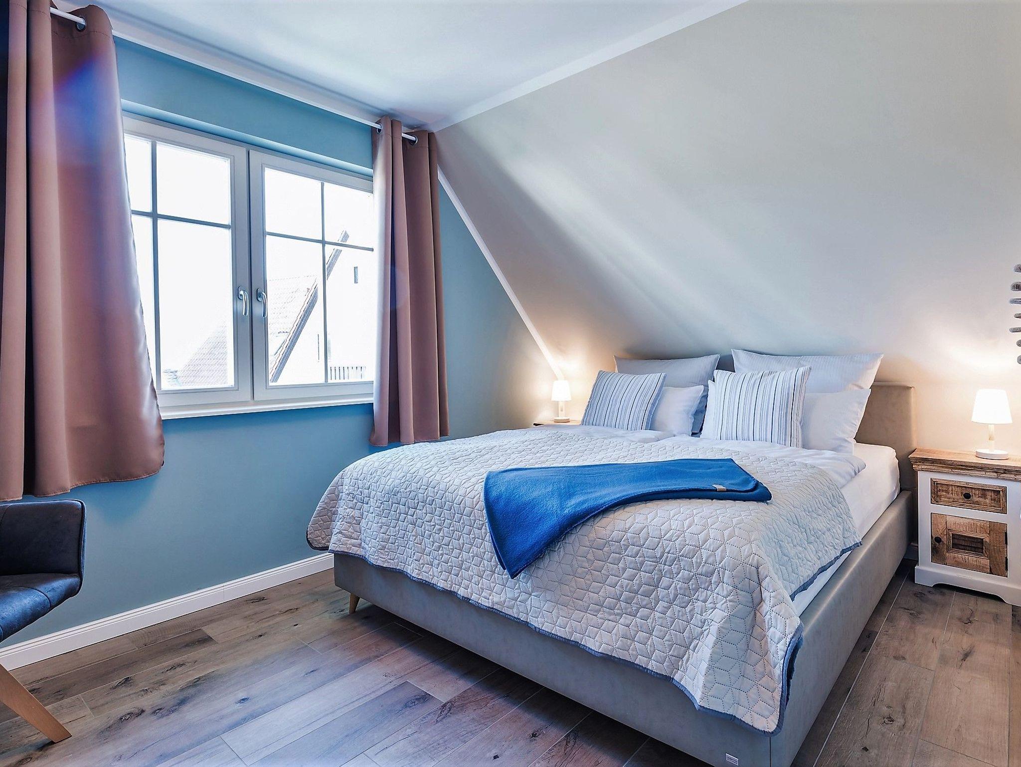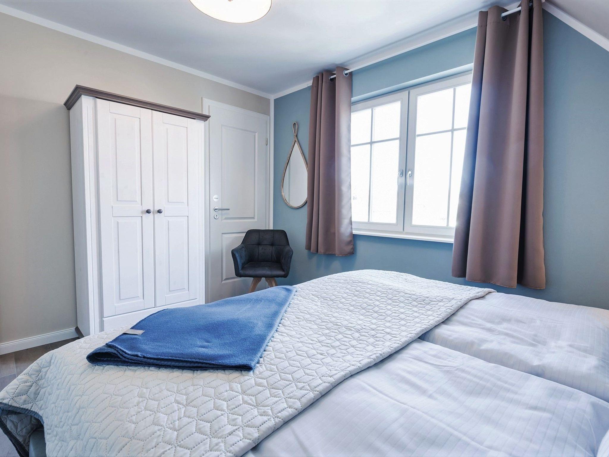 Im Obergeschoss befinden sich 2 Schlafzimmer mit hochwertigen Doppelbetten (1x 180x200 und 1x 160x200) und ein Bad mit Badewanne und Dusche.