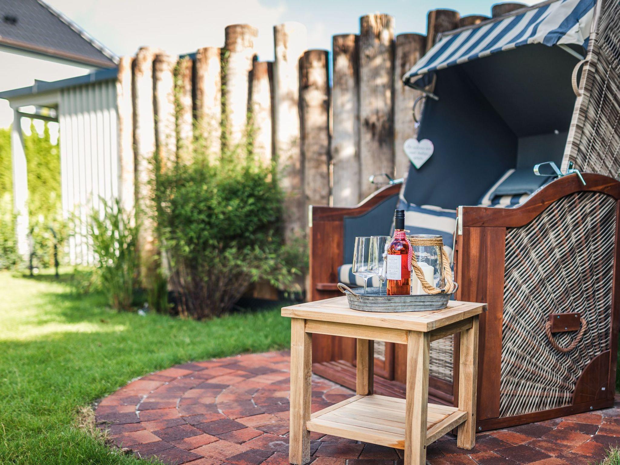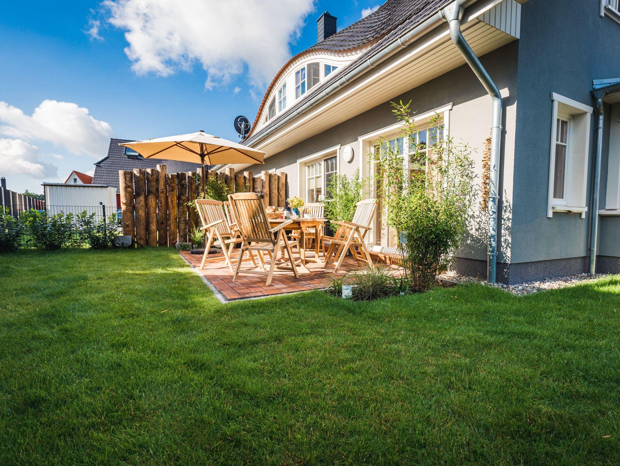 Erholen Sie sich in einem wunderschönen, liebevoll angelegten Garten mit Terrasse, Teakholz-Essgruppe, Sonnenschirm, zwei Relax-Liegen und einem gemütlichem Strandkorb. Falls Sie Lust auf etwas Leckeres vom Grill haben steht Ihnen ein großer Holzkohlegrill zur Verfügung.
