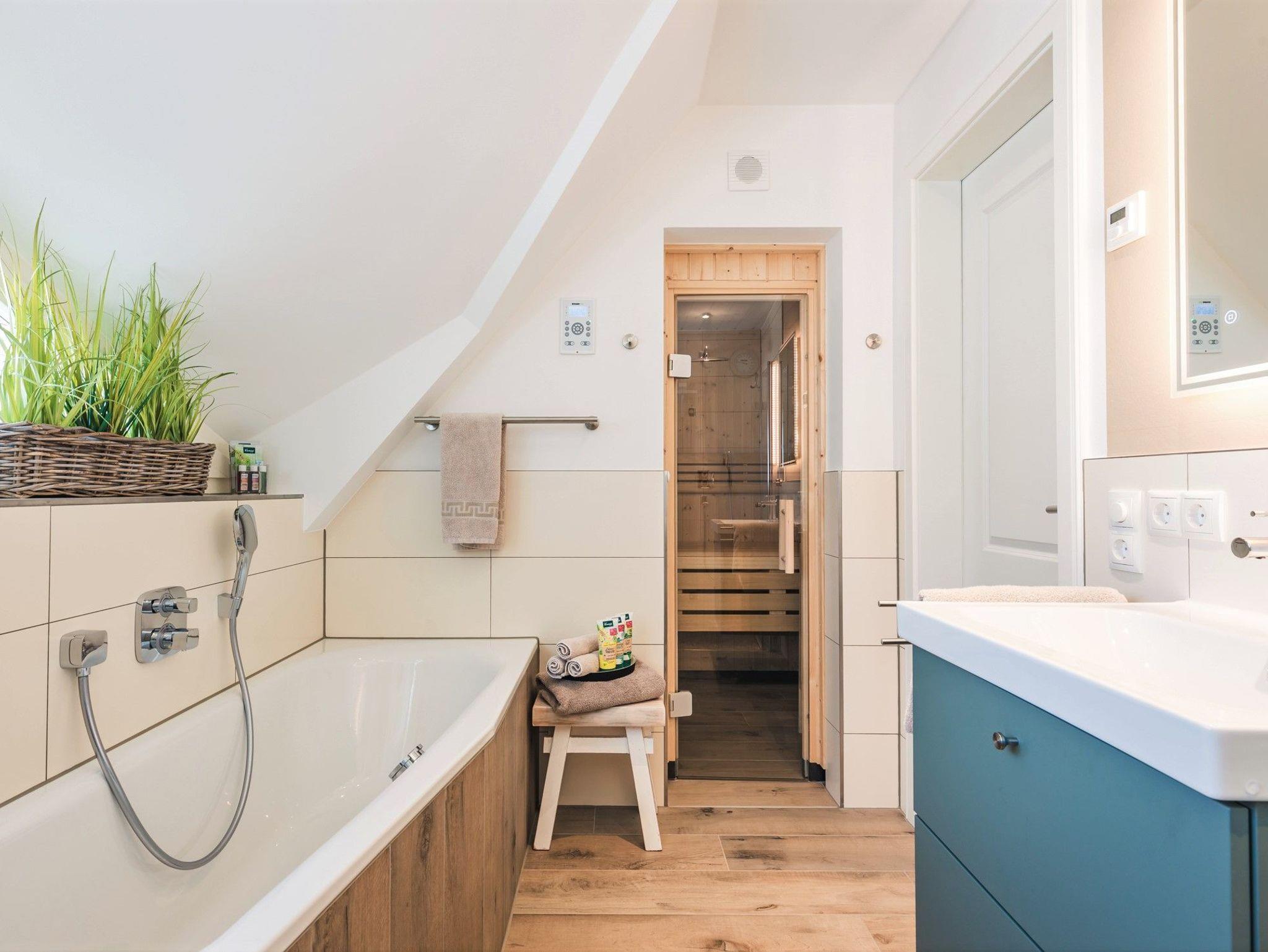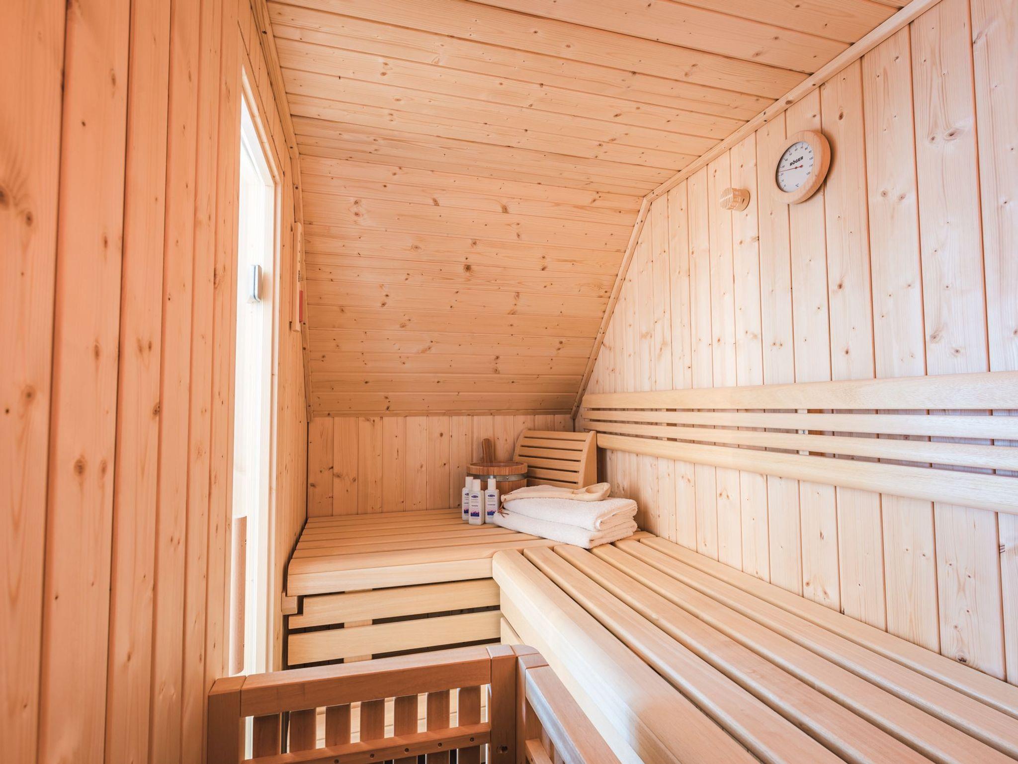 Ein besonderes Schmankerl ist die angrenzende kleine Sauna, in der Sie ausgiebig relaxen können.