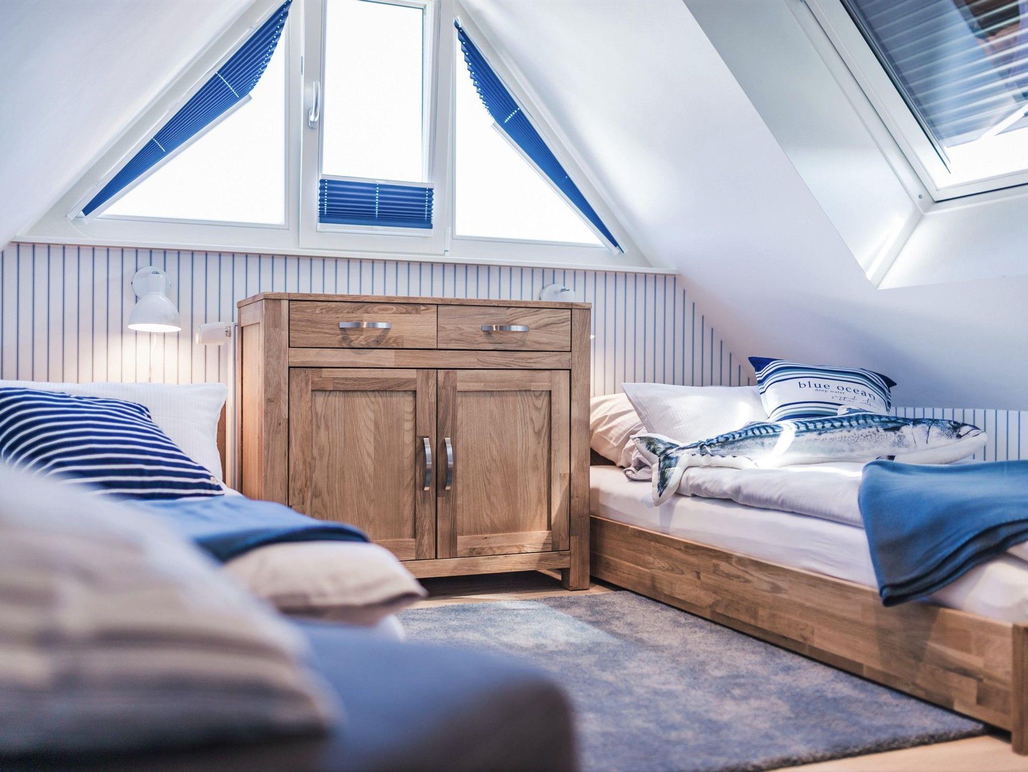 Das gemütliche Dachgeschoß beherbergt ein weiteres Schlafzimmer mit 2 Einzelbetten in der Größe 90x200 cm sowie ein flat- TV. Hier fühlen sich besonders Kinder wohl.