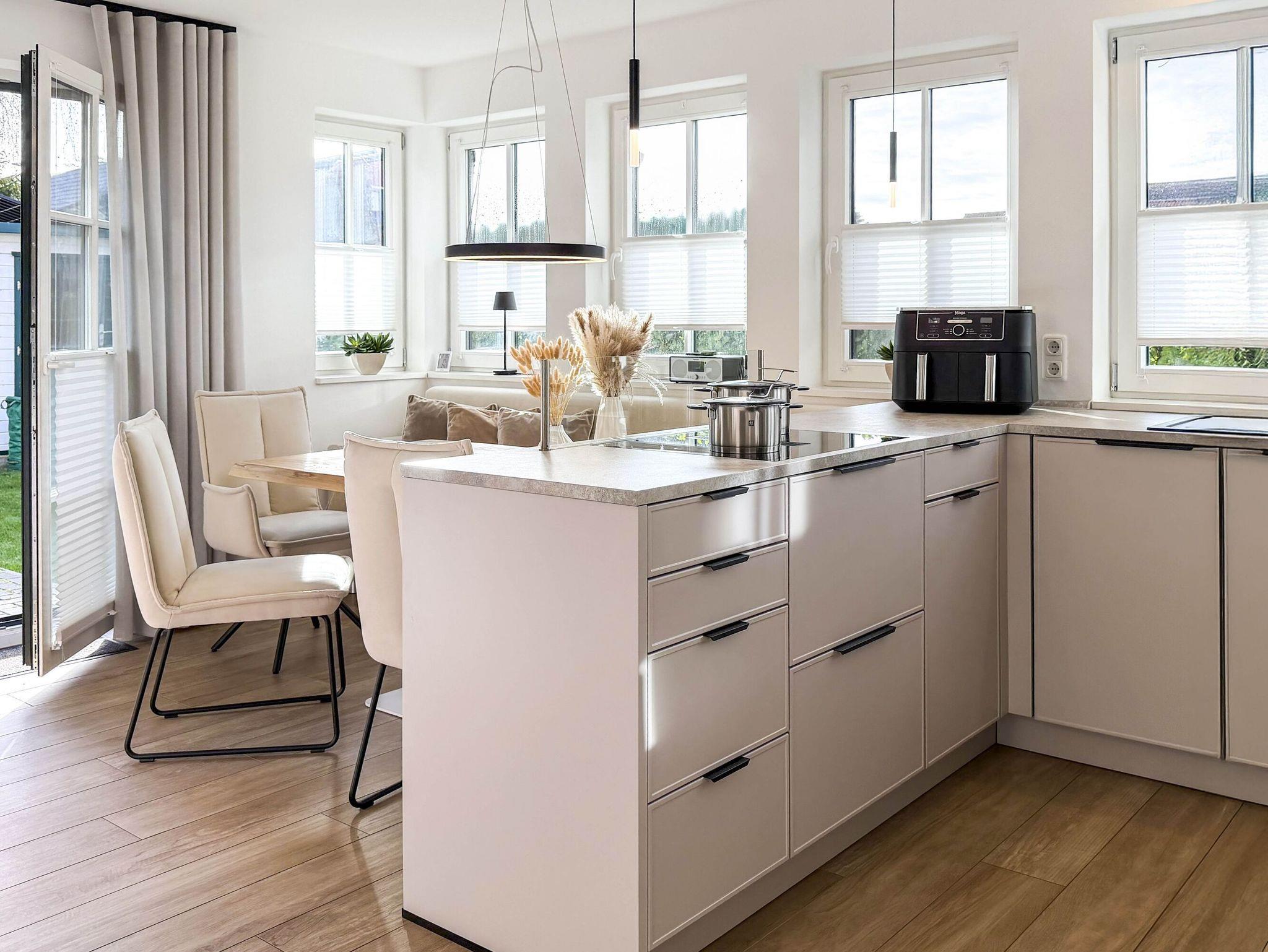 Der offene Wohn- und Essbereich bildet das warme Herz des Hauses. Großzügige Fenster öffnen den Blick ins Grüne, während der Kamin sanftes Licht und behagliche Wärme schenkt perfekt für entspannte Abende nach einem Tag an der frischen Ostseeluft.