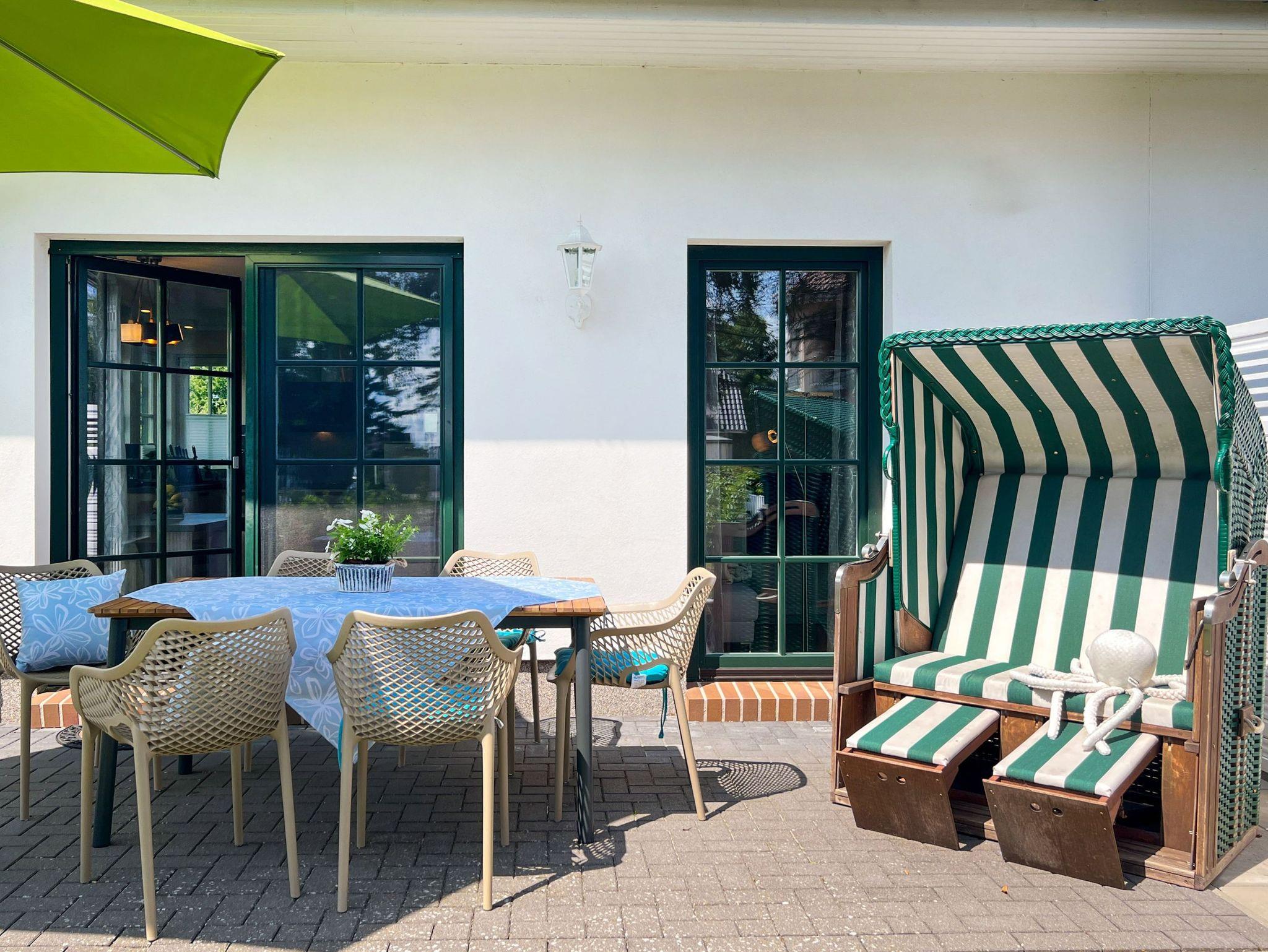 Die sonnige Terrasse rundet das Urlaubserlebnis ab: ausgestattet mit Strandkorb, komfortablen Liegen, Gartenmöbeln und einem Holzkohlengrill ist sie ein Platz zum Durchatmen, Träumen und Genießen vom ersten Kaffee des Tages bis zum entspannten Abend im Freien.