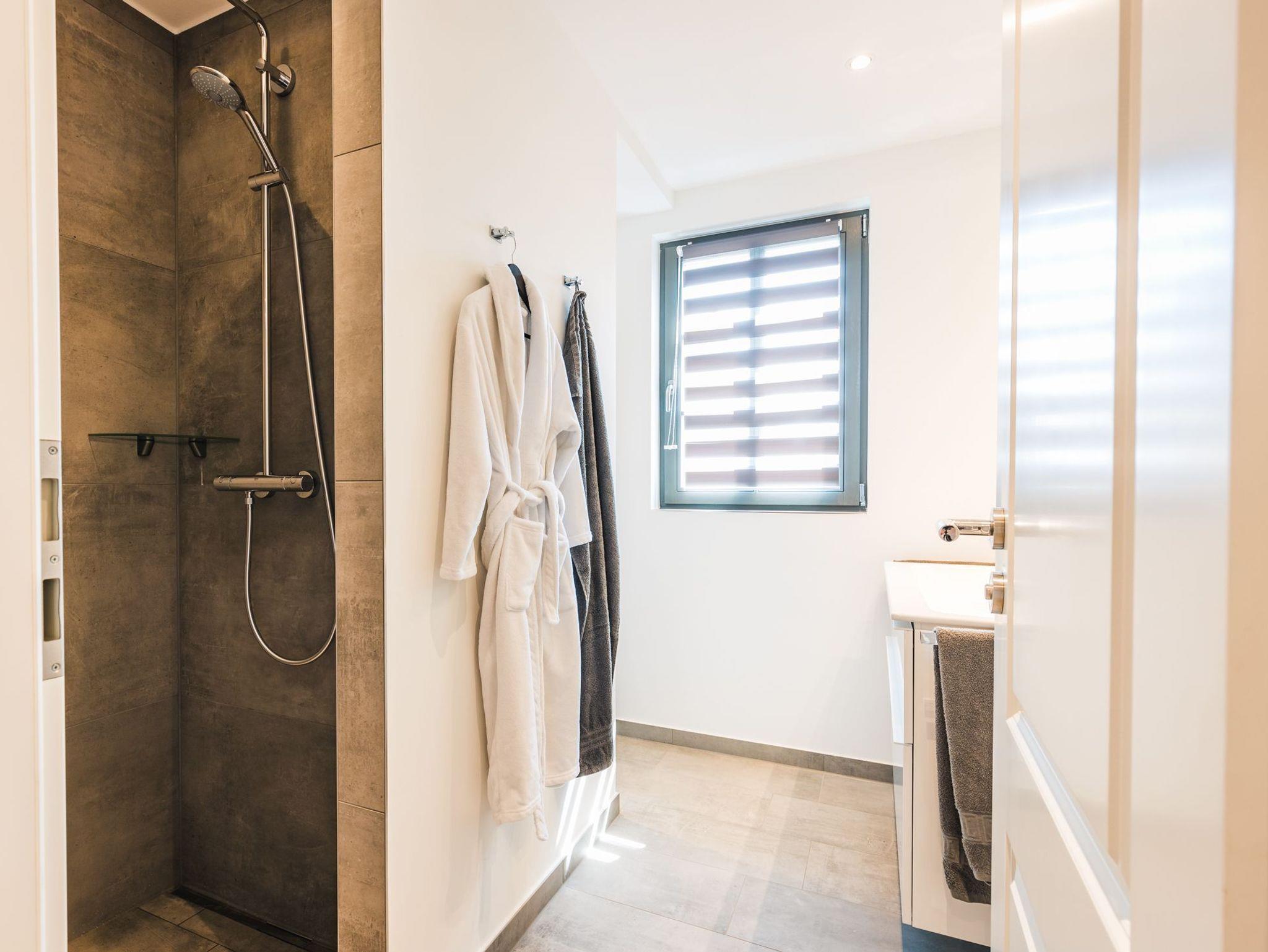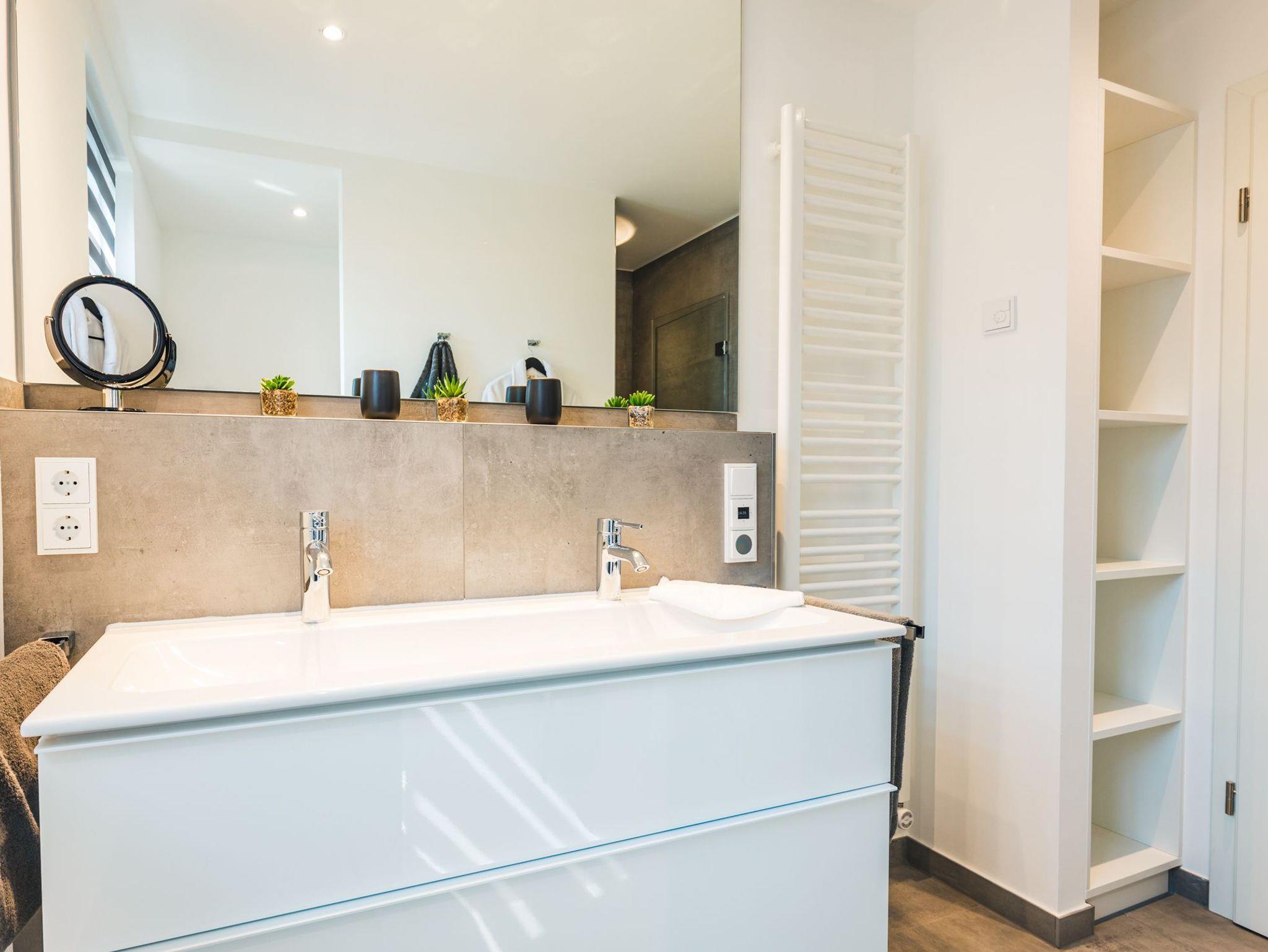 Im großzügigen Bad gibt es großformatige moderne Fliesen sowie eine Doppelwaschtisch mit Panoramaspiegel. In der Dusche kann man zusätzlich die Regenschauerpipe genießen.