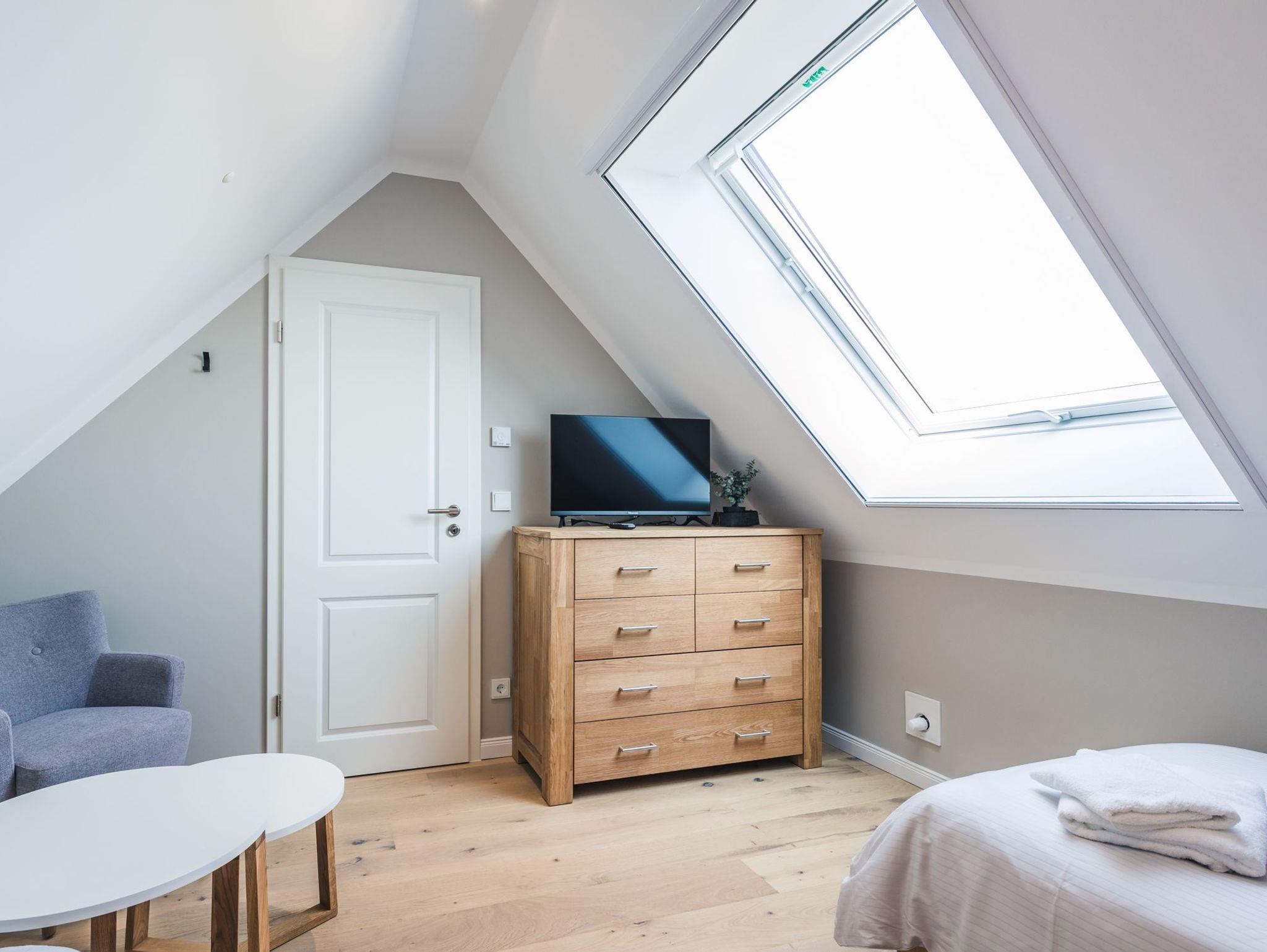 So hat die Wohnung zum Beispiel eine Lüftungsanlage, eine außenliegende elektrisch anzusteuernde Beschattung beider Dachfenstern, sowie 3 modere Flatscreen Fernseher 1 x im WZ und je 1 x im Schlafzimmer.
