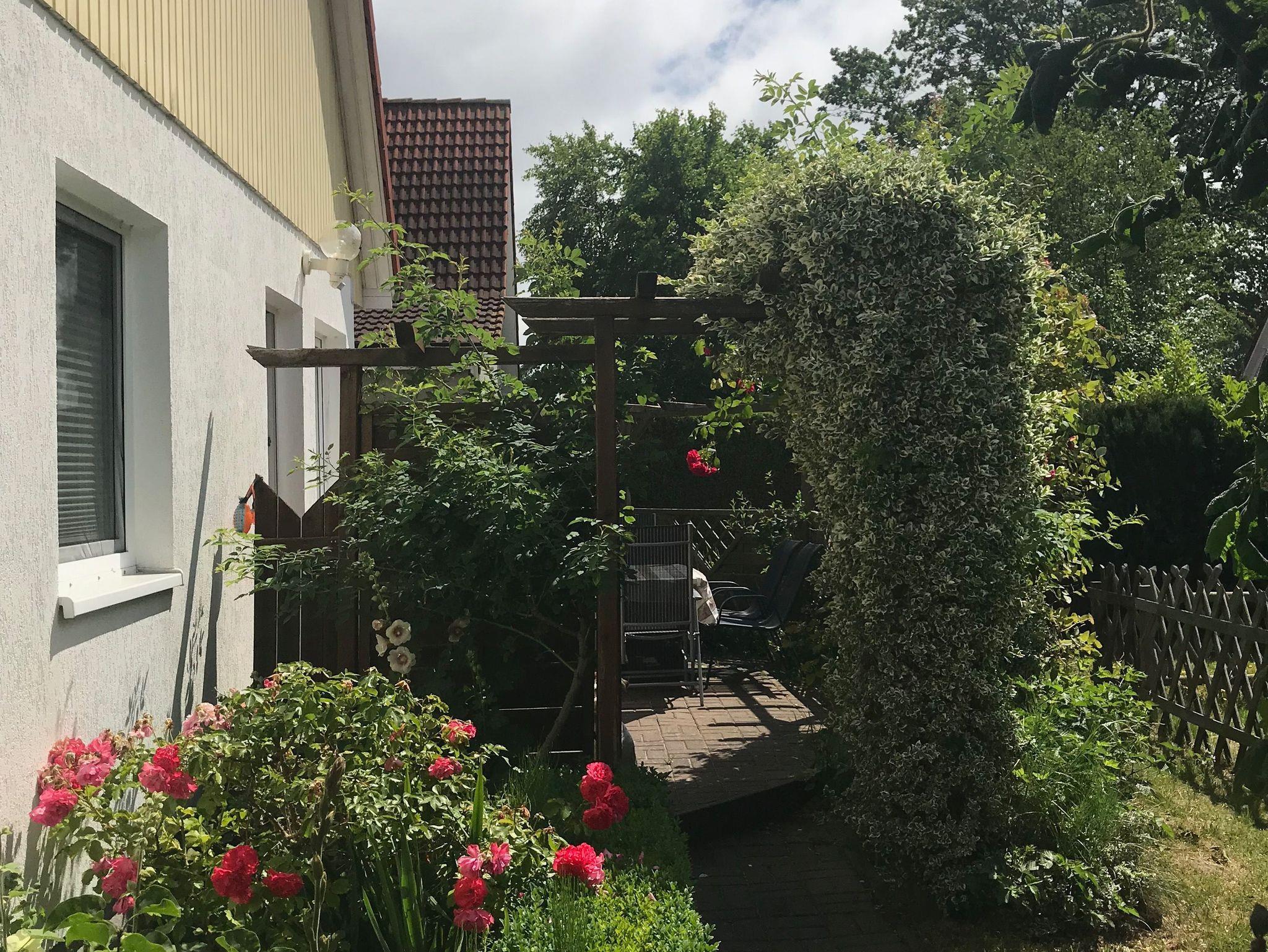 Die große Südterrasse mit Terrassenmöbeln und Sonnenschirm laden zum Frühstücken im Freien ein. Der 300qm große Garten ist komplett eingezäunt. So können sich unsere kleinen Gäste unbeschwert vergnügen und auch die vierbeinigen Gäste können sich frei bewegen.