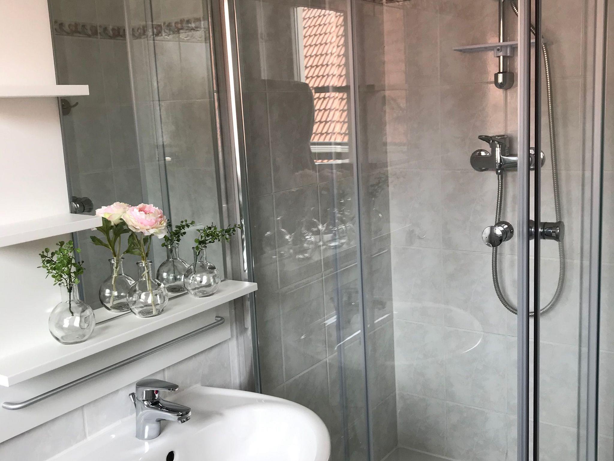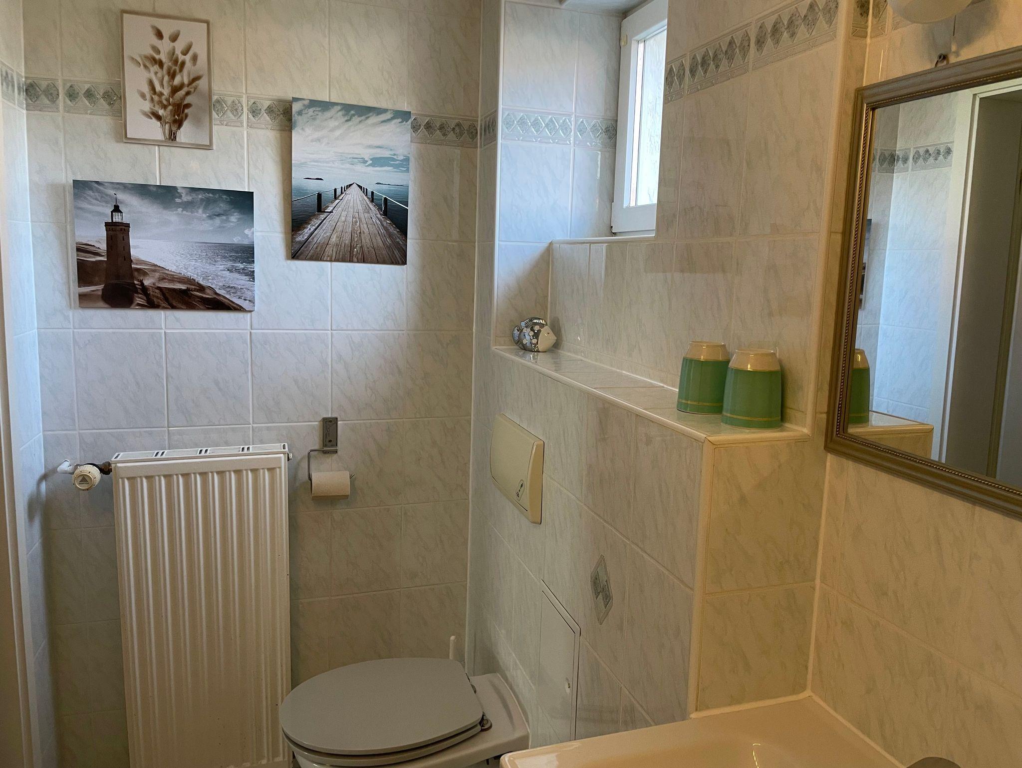 Im Erdgeschoss befindet sich die vollausgestattete Küche mit Geschirrspüler, Backofen, Mikrowelle, Herd und kleinem Essbereich, der einladende Wohnbereich mit Ecksofa, Sessel und TV, das gemütliche Esszimmer, ein Schlafzimmer mit Boxspringbetten, ein Bad mit Dusche und ein großes Bad mit Eckbadewanne.