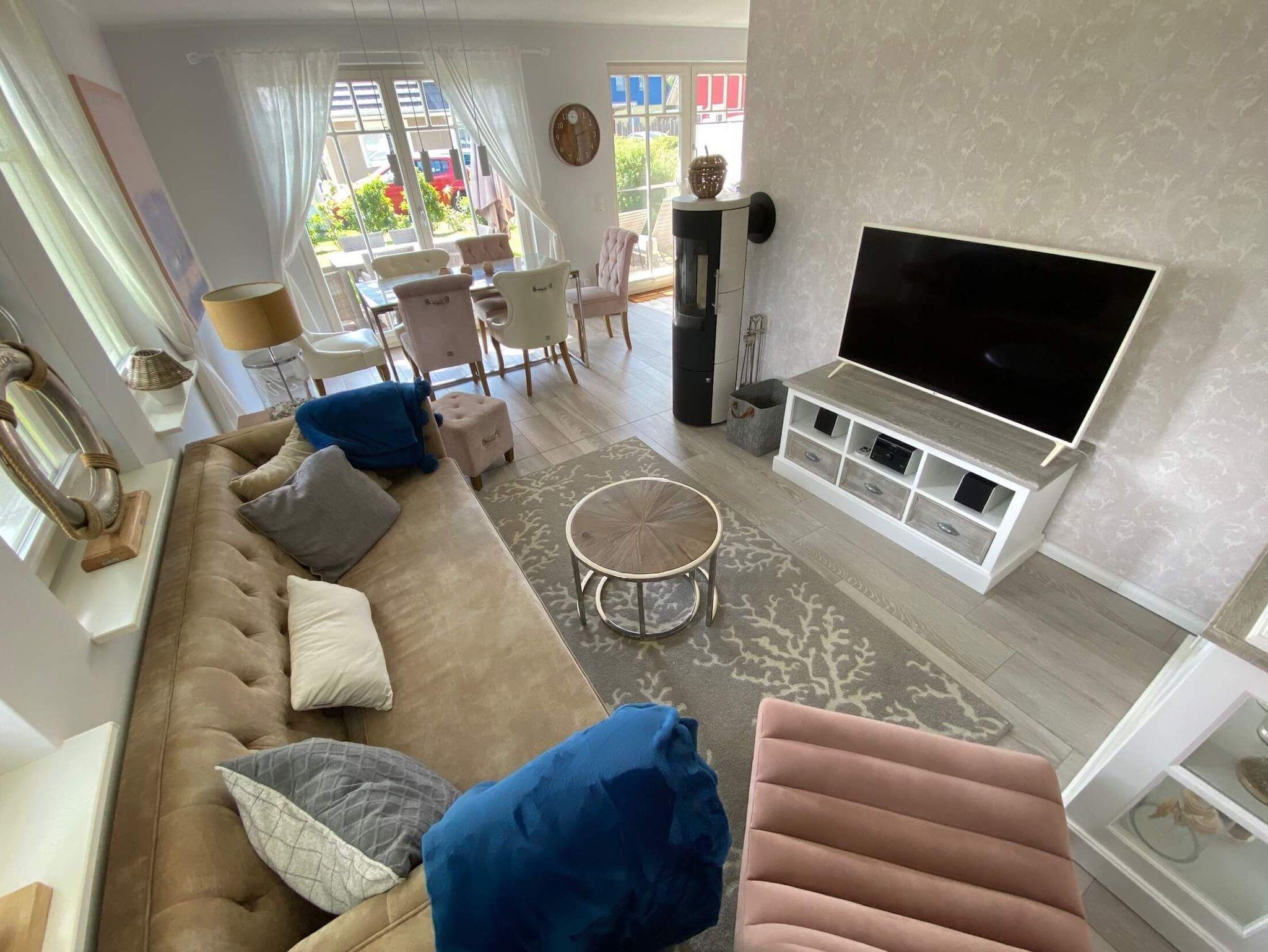 Die voll ausgestattete Küche, 2 Bäder (eines zusätzlich mit Wanne) und 3 Schlafzimmer bieten genügend Freiraum für alle. Der schöne, rustikale Esstisch im Wohnbereich lädt zum geselligen Speisen und Beisammensitzen ein.
