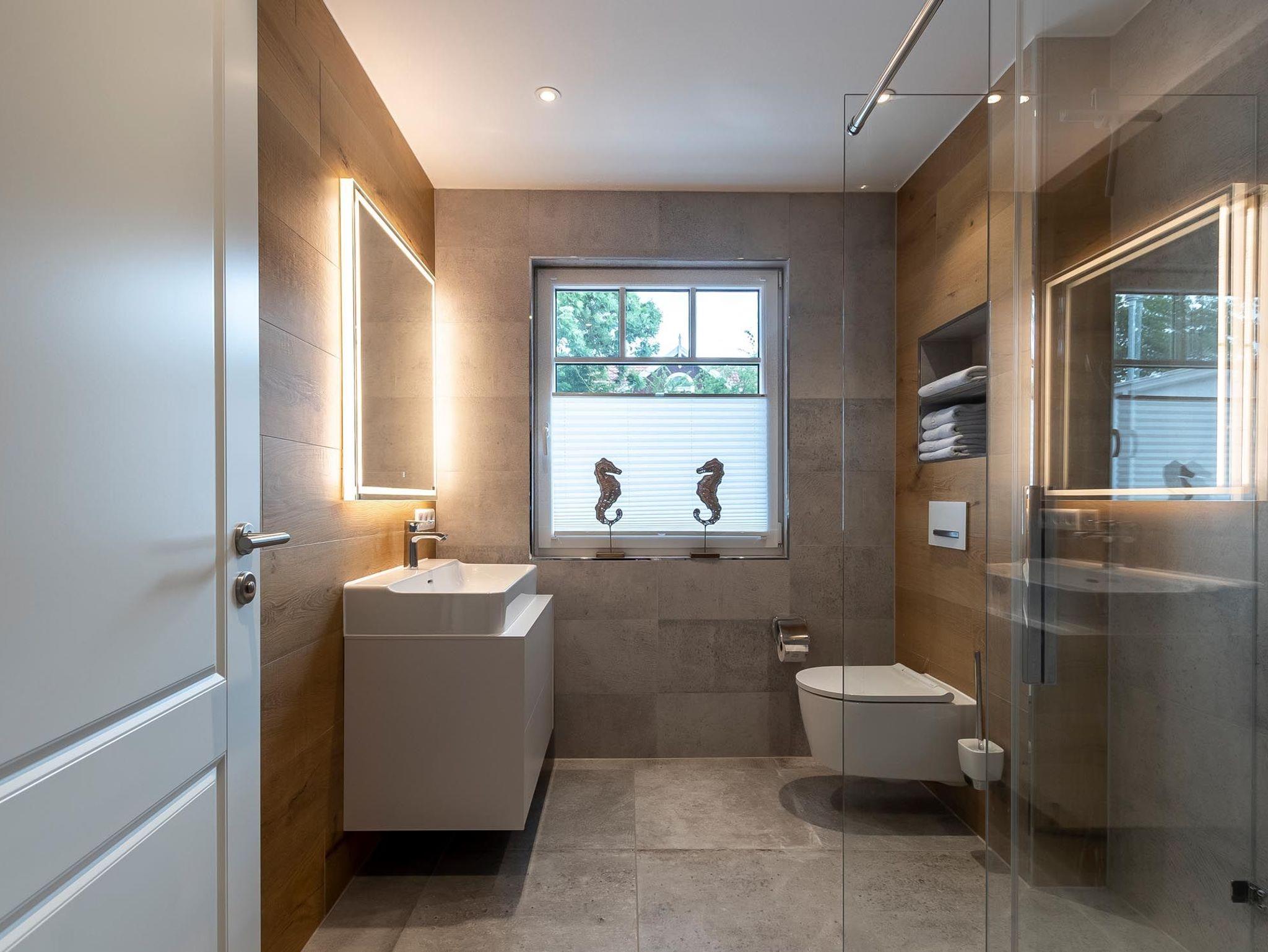 Das ansprechend eingerichtete Badezimmer verfügt über eine bodengleiche Dusche.