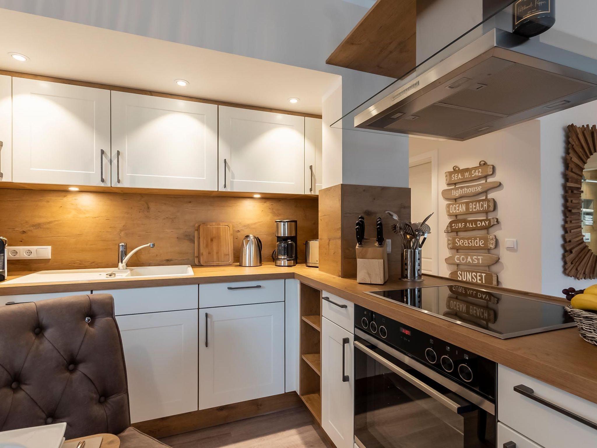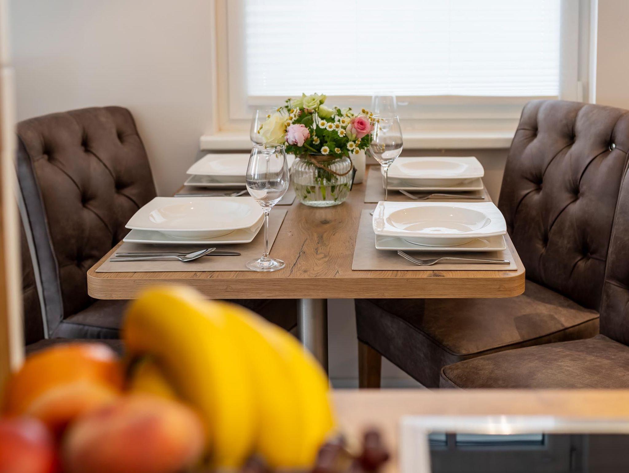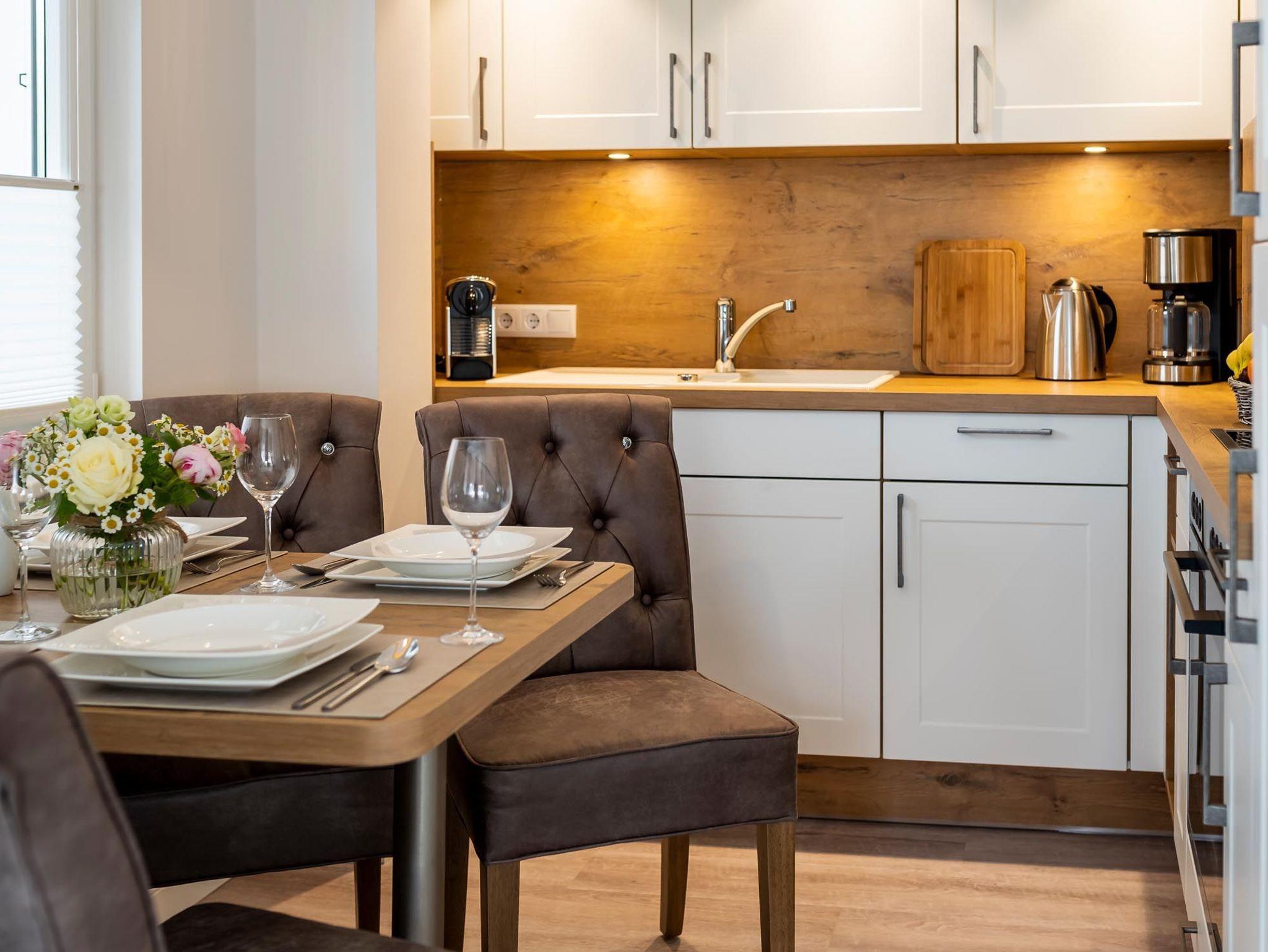 Sie verfügt über einen eleganten Wohnbereich mit einer offenen Küche und gemütlichem Essbereich. Die Küche ist hochwertig ausgestattet und lässt keine Wünsche offen.
