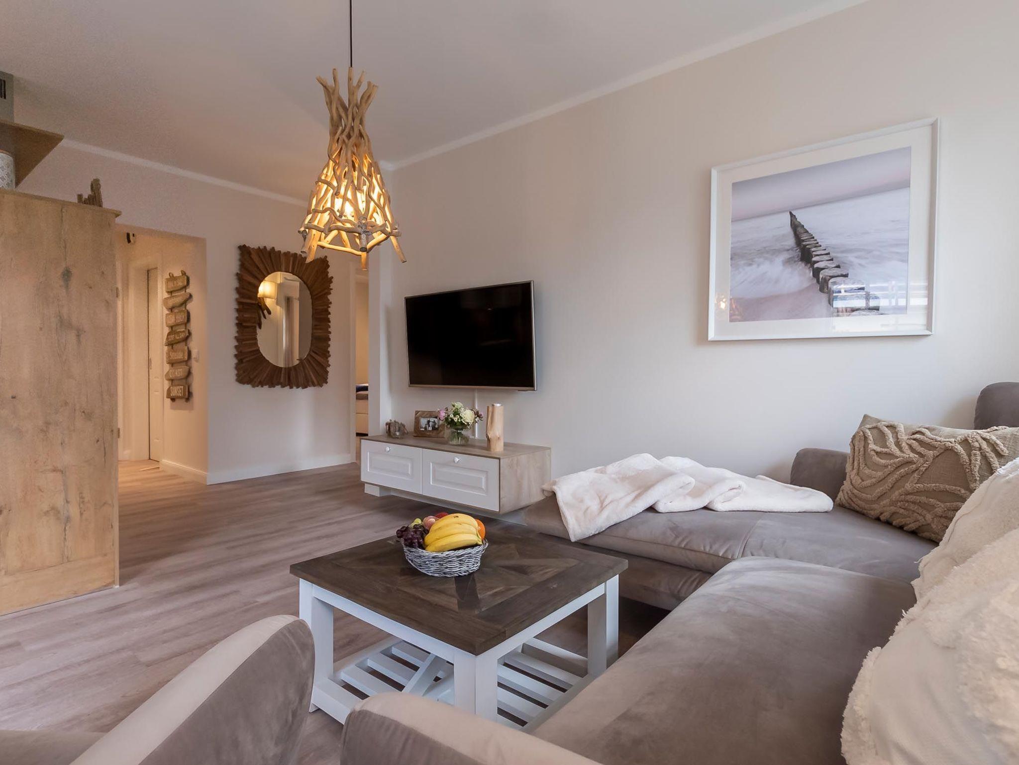 Die Ferienwohnung Treibholz I in Zingst bietet modernen Komfort, eine möblierte Terrasse und kostenfreie Sauna für entspannte Urlaubstage.