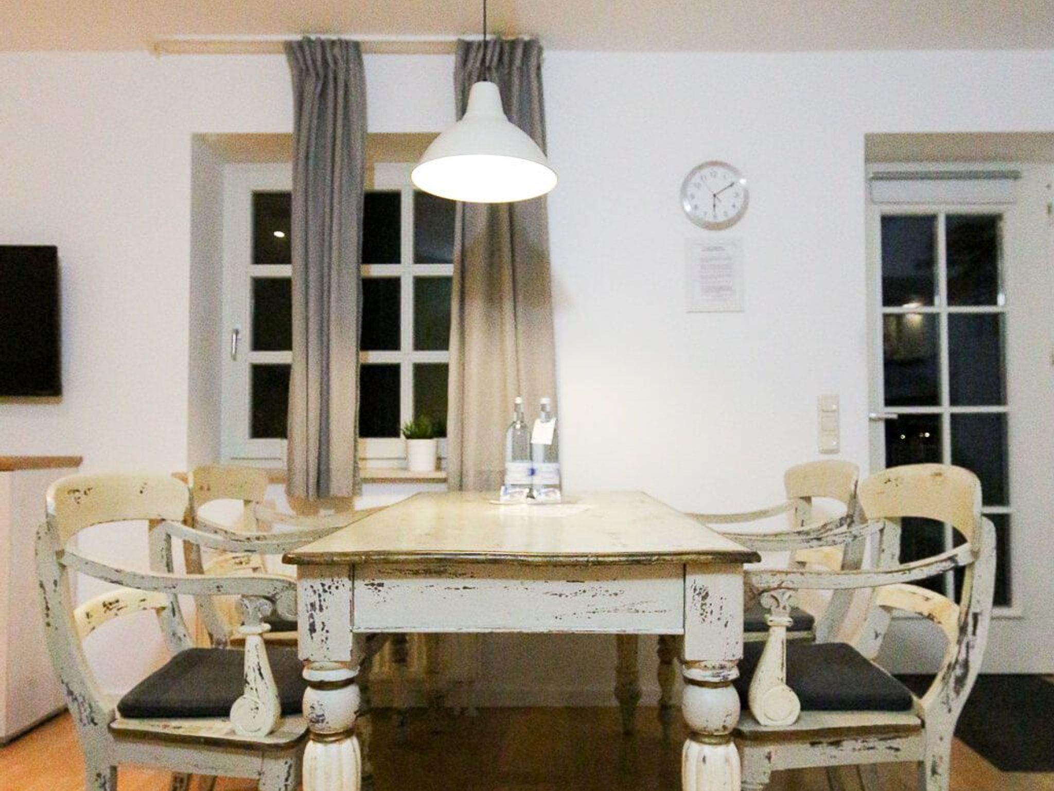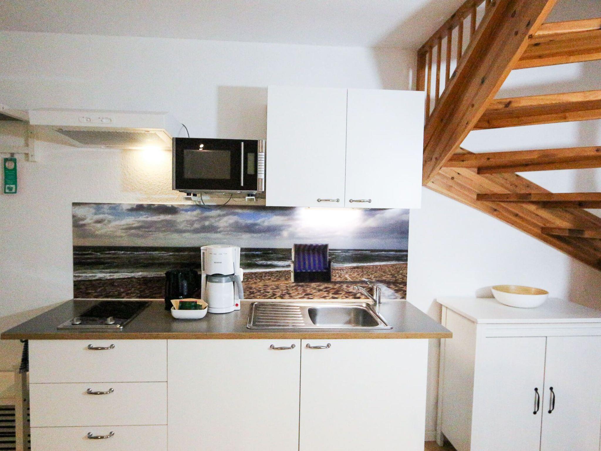 Das Maisonette-Apartment Pier 3 im Haus 3 der Ferienanlage Captain Pahlen in Zingst bietet auf zwei Ebenen ein modernes, klar strukturiertes Wohnkonzept. Der Wohnbereich im unteren Geschoss ist offen gestaltet und verbindet eine gemütliche Sitzecke mit einem Essplatz sowie einer funktionalen Küchenzeile. Diese ist mit 2-Platten-Ceranfeld, Kühlschrank mit Gefrierfach, Mikrowelle mit Grillfunktion, Wasserkocher, Toaster und Kaffeemaschine ausgestattet.