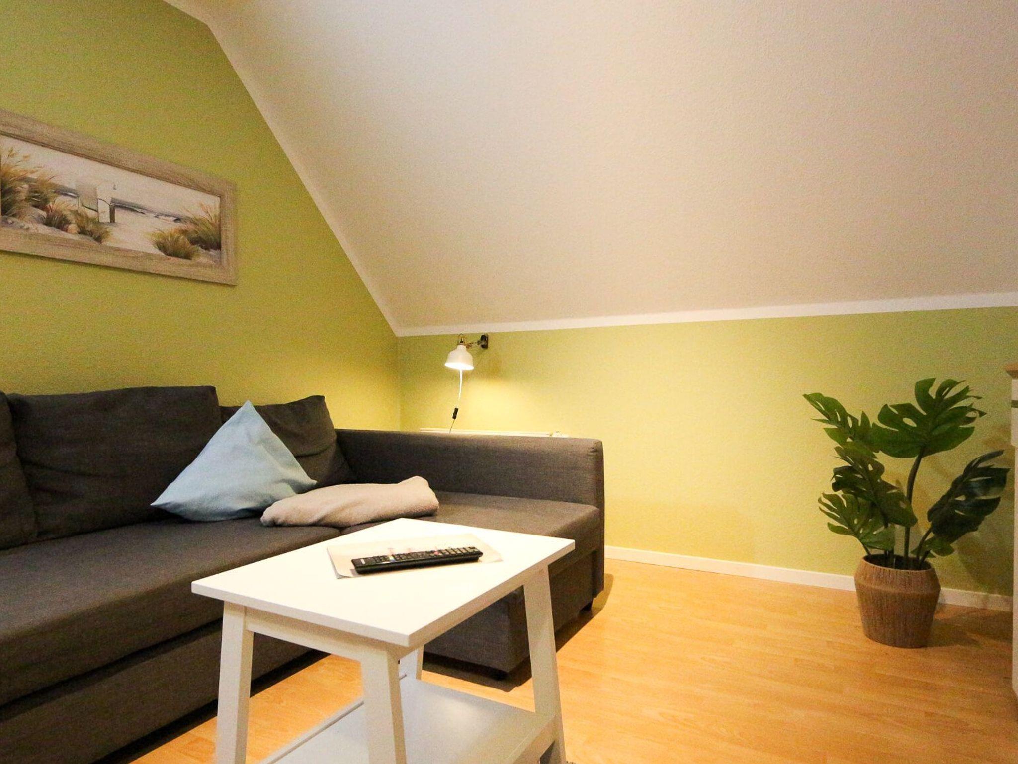 Das Badezimmer befindet sich ebenfalls auf dieser Ebene und verfügt über Dusche, WC, Föhn und Pflegeprodukte. Über eine Innentreppe gelangen Sie in den oberen Schlafbereich mit Doppelbett (160 × 200 cm, getrennte Matratzen) sowie einer separaten Schlafkoje mit ca. 1,85 m Länge. WLAN, Bettwäsche und Handtücher sind inklusive. Nichtraucher-Apartment, geeignet für Paare mit Kind oder kleine Familien.