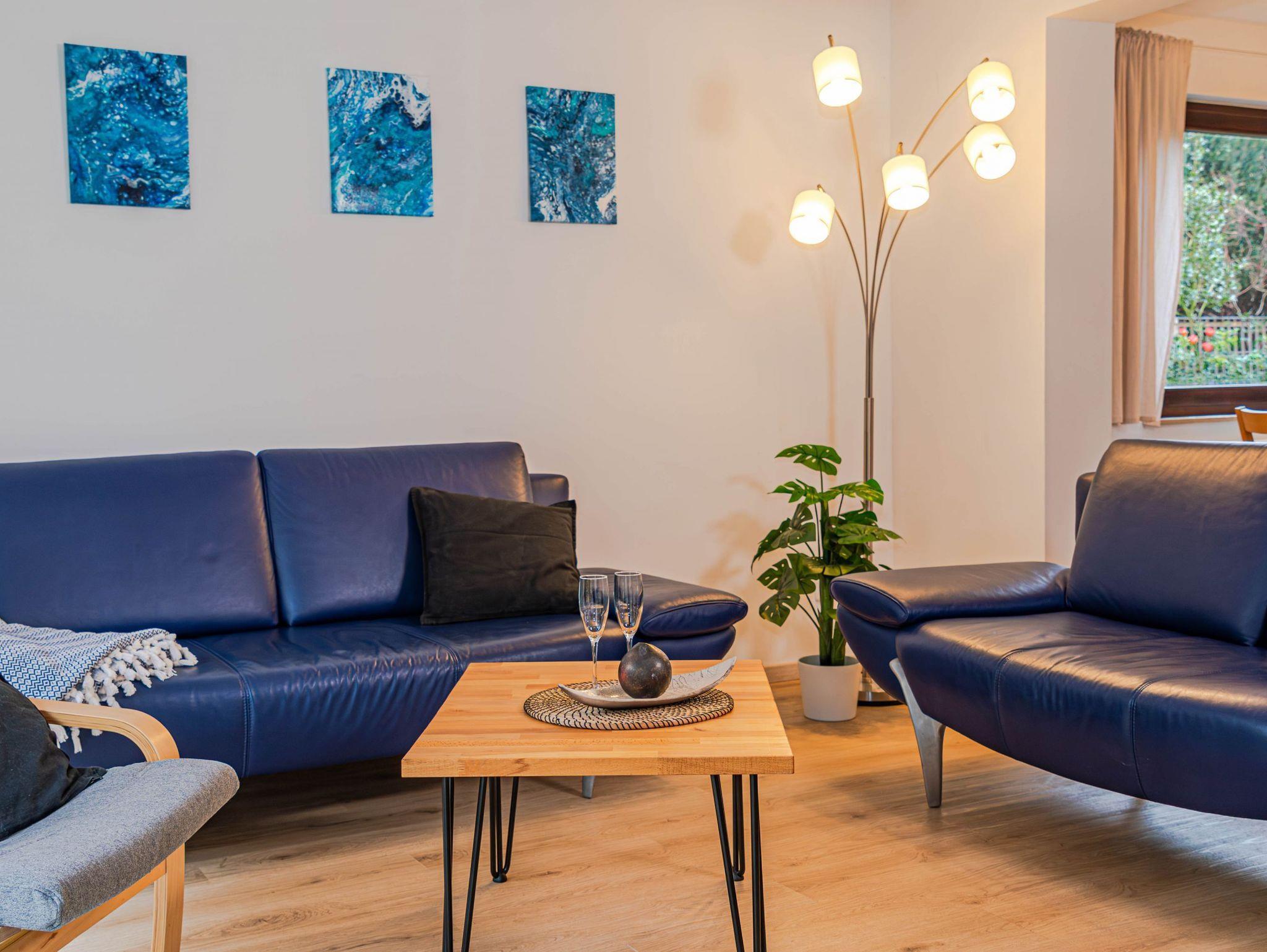 • Gemütlicher Wohnbereich mit Smart-TV und Blick in den Garten