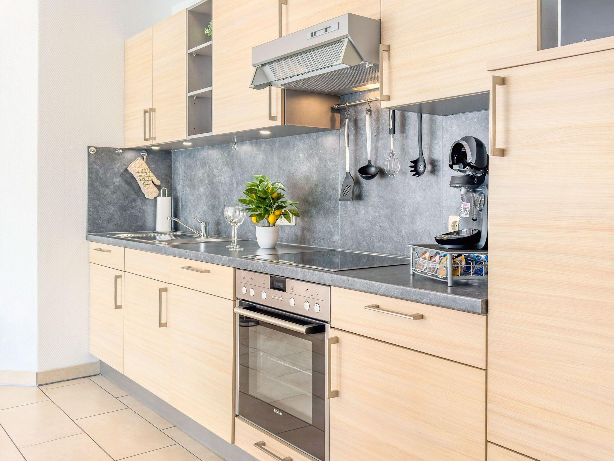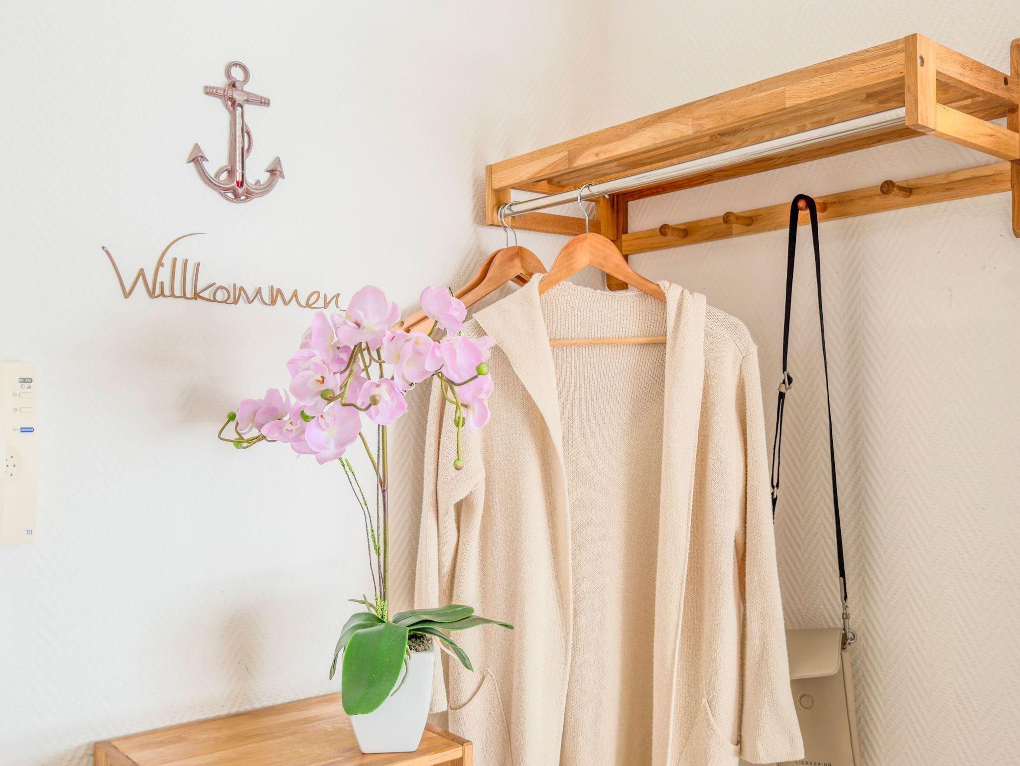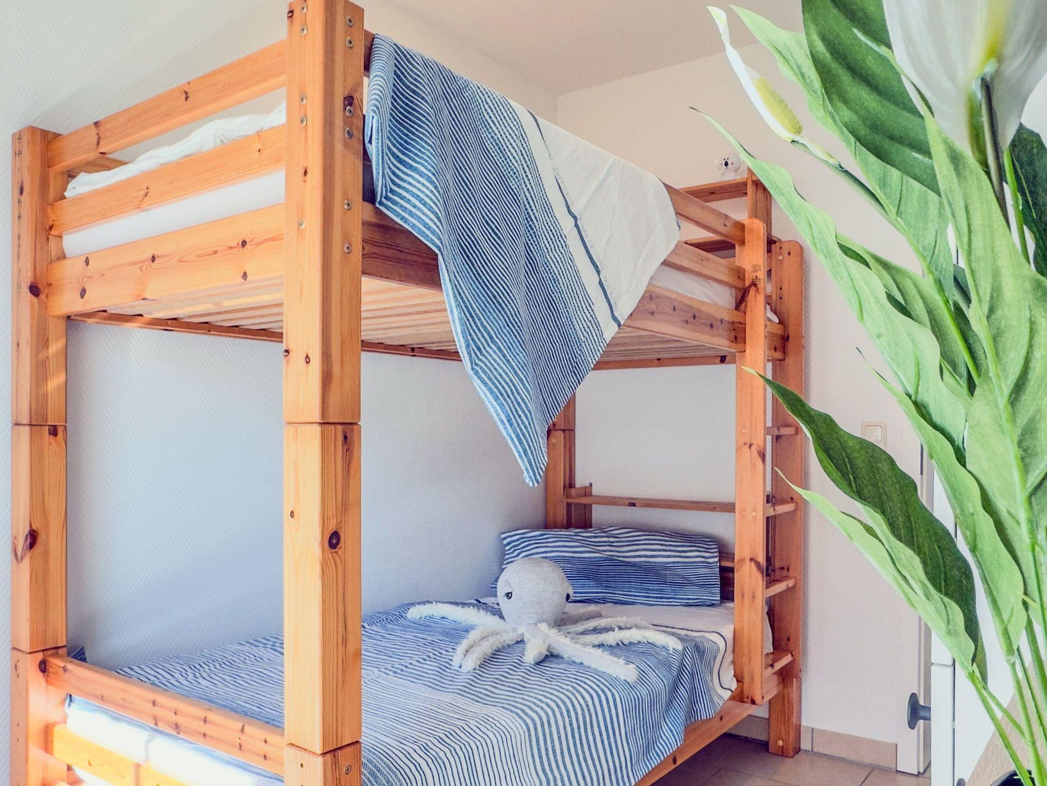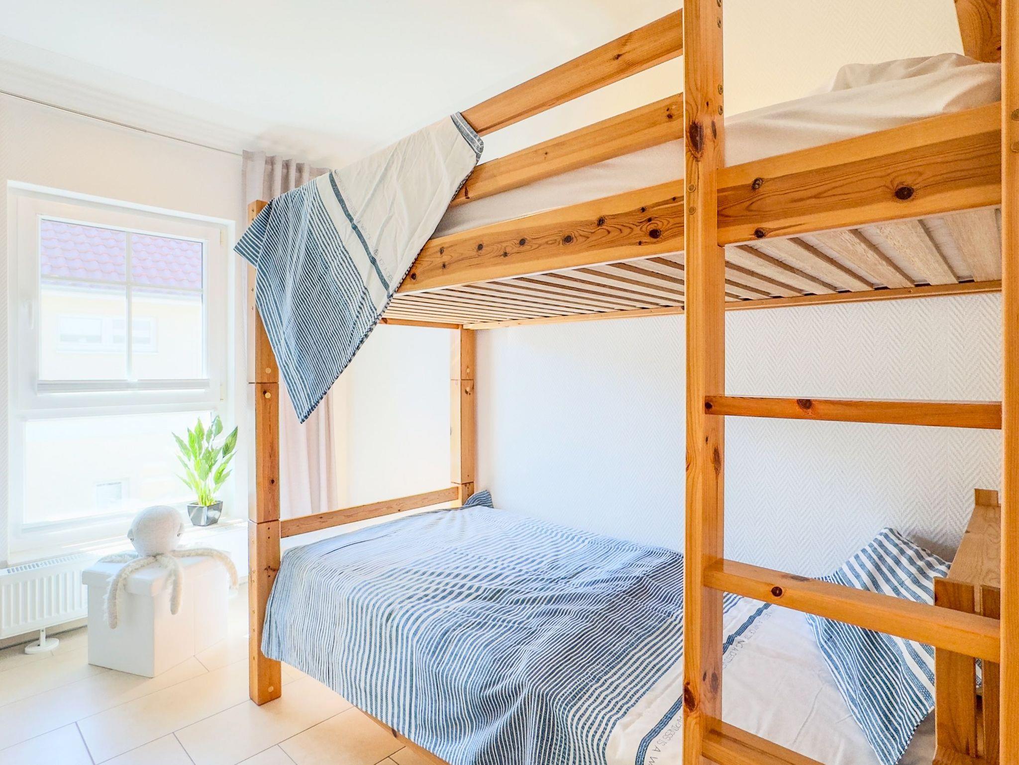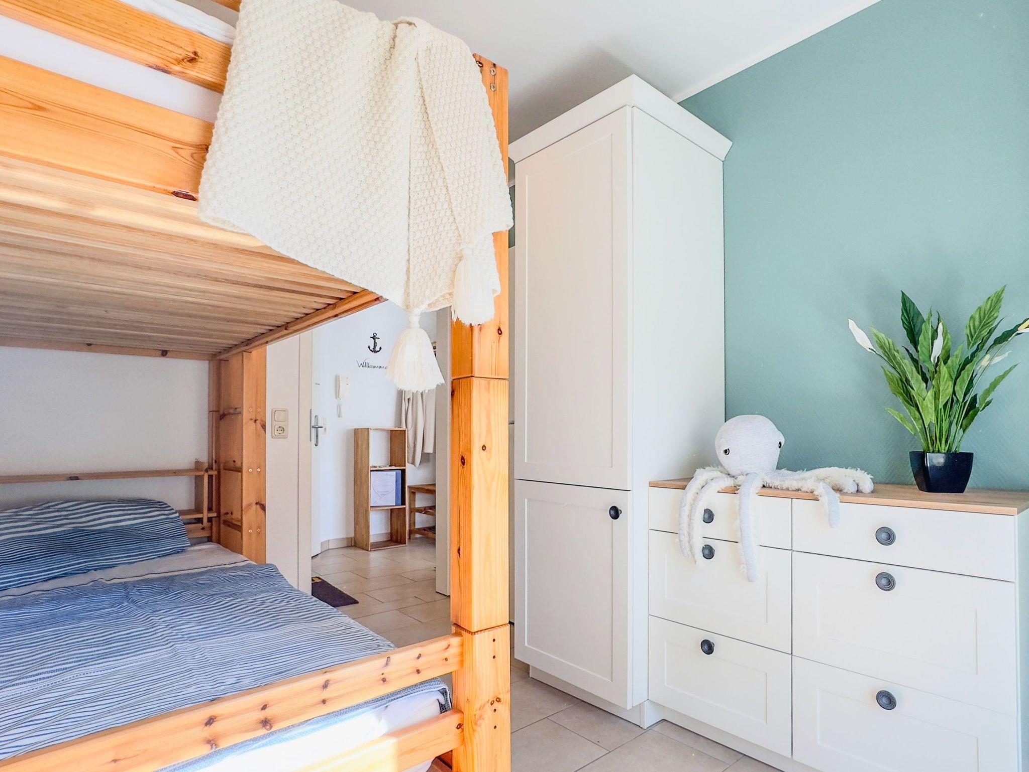 Die Ferienwohnung Seeluft empfängt Sie mit einer modernen und einladenden Atmosphäre. Der Wohnbereich mit voll ausgestatteter Küche bietet alles, was Sie für kulinarische Genüsse benötigen. Das gemütliche Schlafzimmer mit Boxspringbett garantiert erholsame Nächte und verfügt über einen direkten Zugang zum Balkon. Das separate Kinderzimmer mit Etagenbett ist ideal für Familien mit kleinen Gästen.
