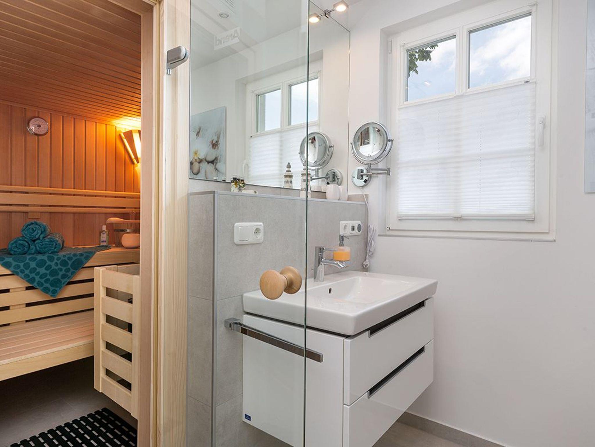 Im Obergeschoss erwarten Sie zwei traumhafte Schlafzimmer mit Boxspringbetten und eigenem Flachbild-TV, ergänzt durch ein stilvolles Badezimmer mit Sauna und Regendusche. Hier können Sie die Seele baumeln lassen und neue Energie tanken. Das Dachgeschoss bietet ein weiteres charmantes Schlafzimmer ein behaglicher Rückzugsort, ideal für Kinder oder Freunde.