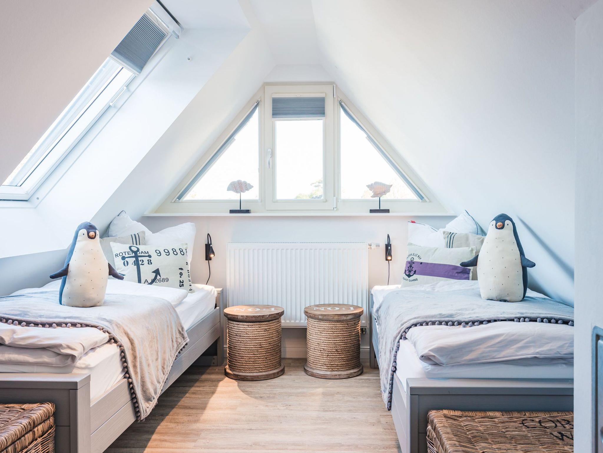 Im Obergeschoss befinden sich zwei Schlafzimmer für je zwei Personen. Die Schlafzimmer sind mit Boxspringbetten und Kleiderschank ausgestattet. Der ausgebaute Spitzboden verfügt über zwei weitere Einzelbetten. Alle Schlafzimmerverfügen über einen Flatscreen Smart TV.