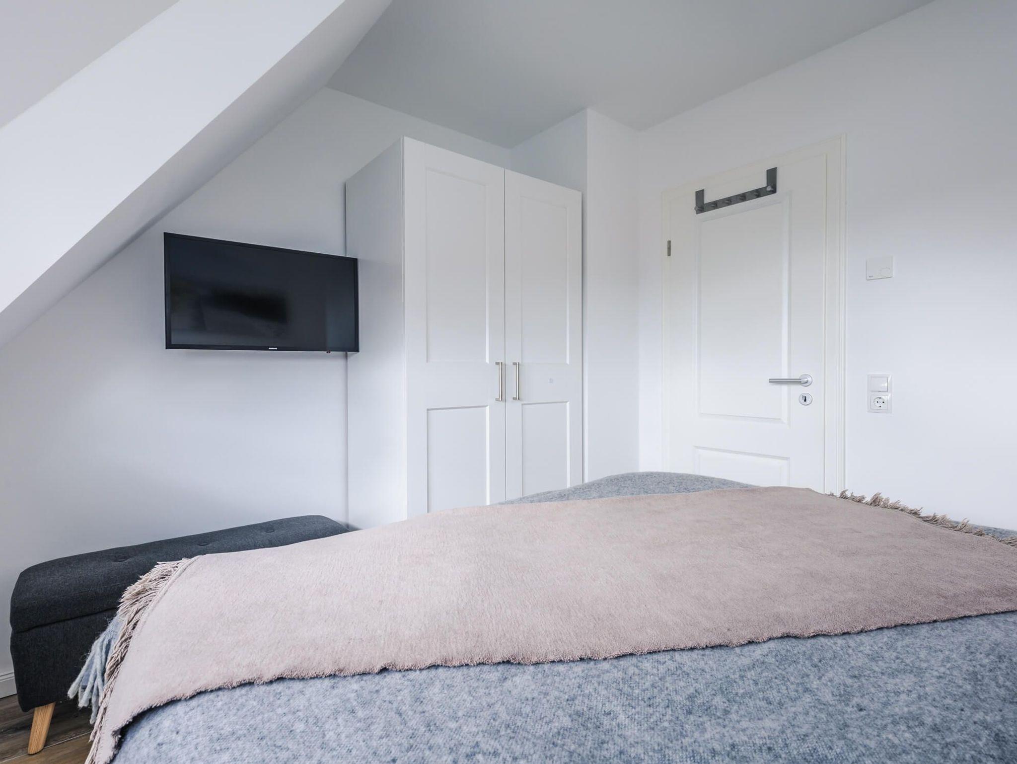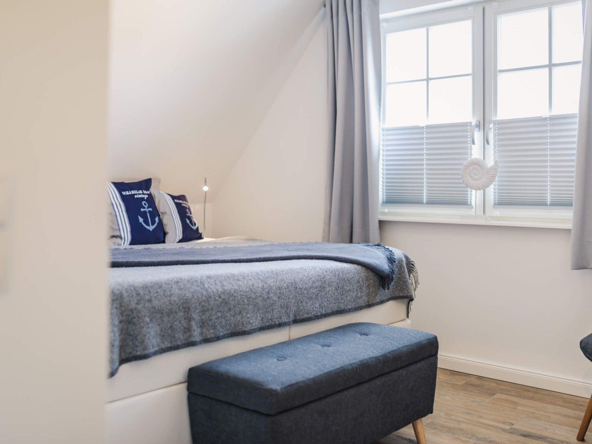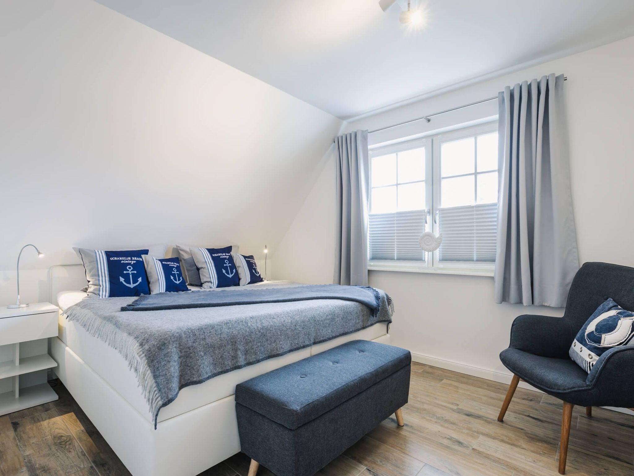 Im Obergeschoss befinden sich zwei Schlafzimmer für je zwei Personen. Die Schlafzimmer, sind mit Boxspringbetten, Kleiderschränken und Ablagemöglichkeiten ausgestattet. Ein Schlafzimmer verfügt zusätzlich über einen Flatscreen TV. In dieser Etage befindet sich das voll ausgestattete Badezimmer mit beleuchtetem Spiegel, bodengleicher Dusche, Badewanne und finnischer Sauna.