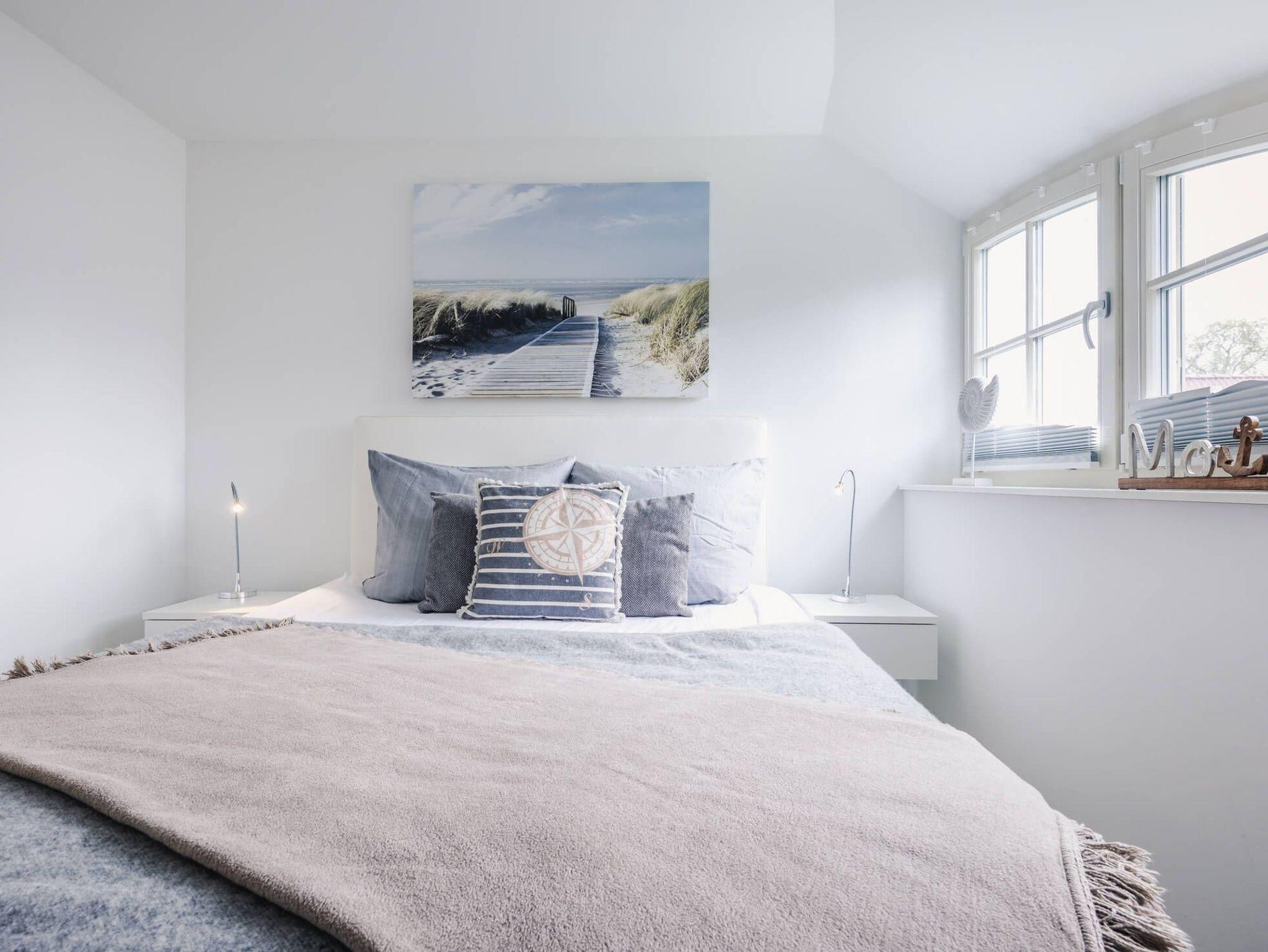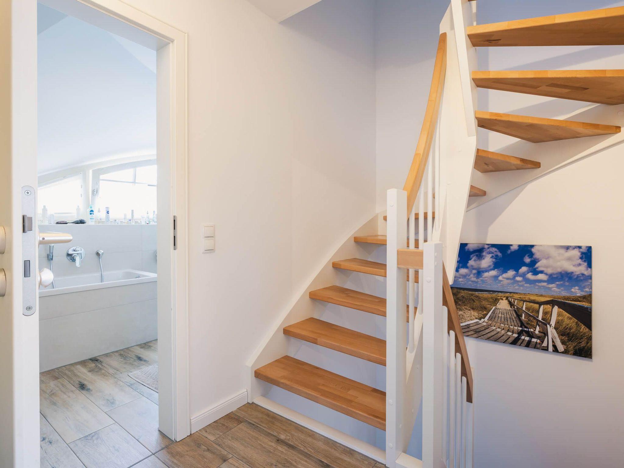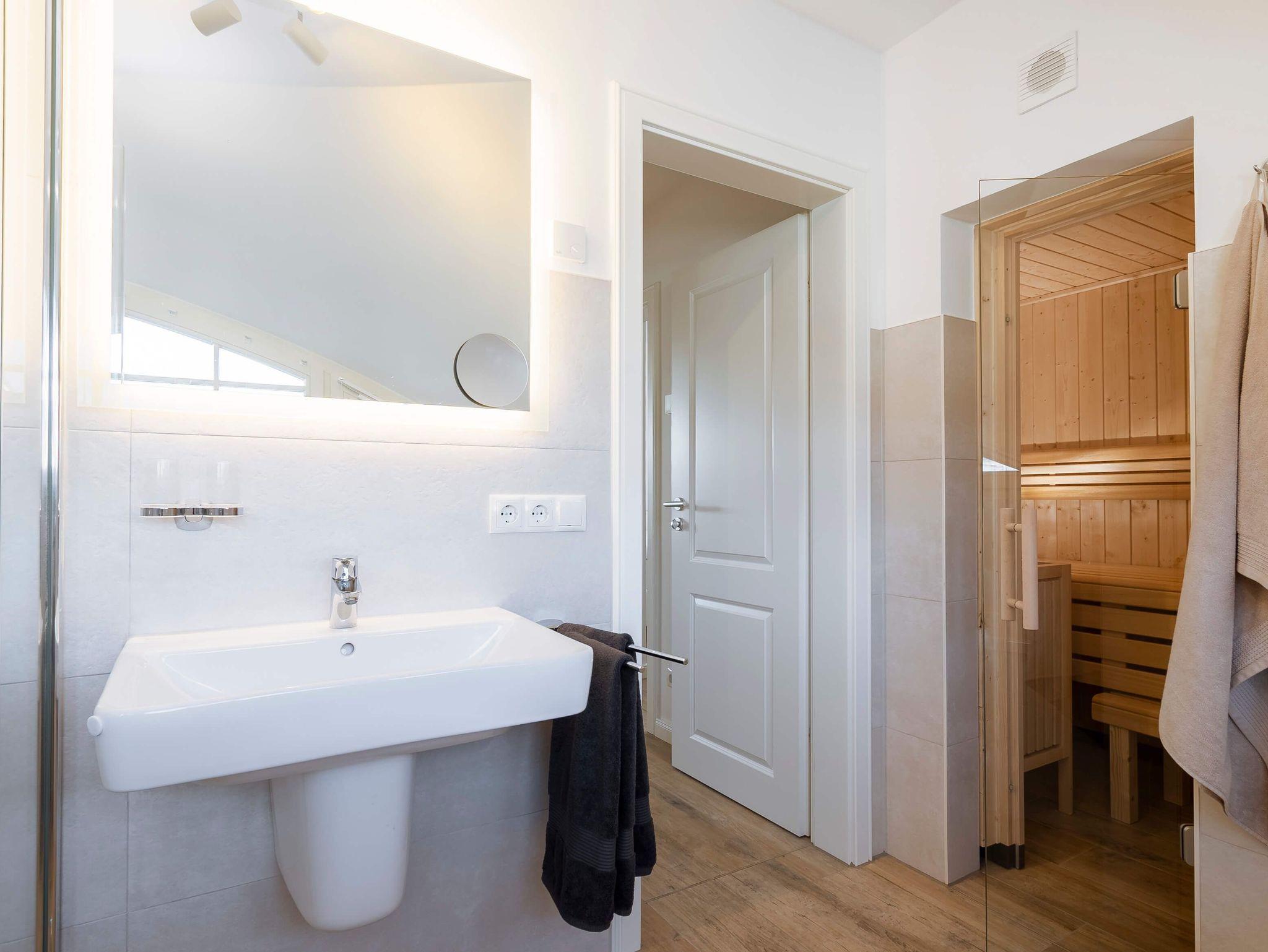 Im Obergeschoss befinden sich zwei Schlafzimmer für je zwei Personen. Die Schlafzimmer, sind mit Boxspringbetten, Kleiderschränken und Ablagemöglichkeiten ausgestattet. Ein Schlafzimmer verfügt zusätzlich über einen Flatscreen TV. In dieser Etage befindet sich das voll ausgestattete Badezimmer mit beleuchtetem Spiegel, bodengleicher Dusche, Badewanne und finnischer Sauna.