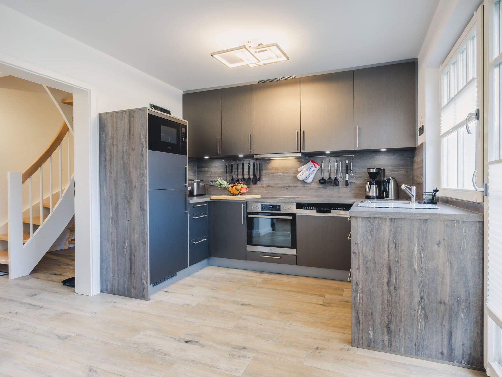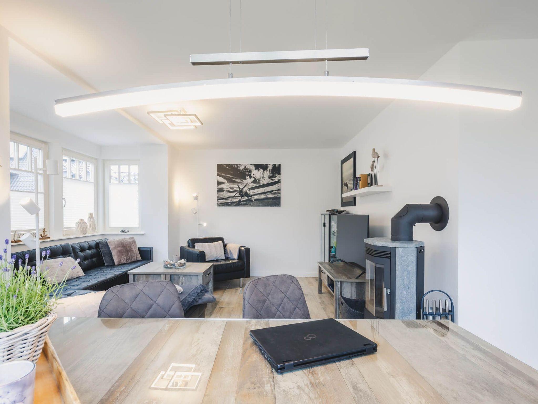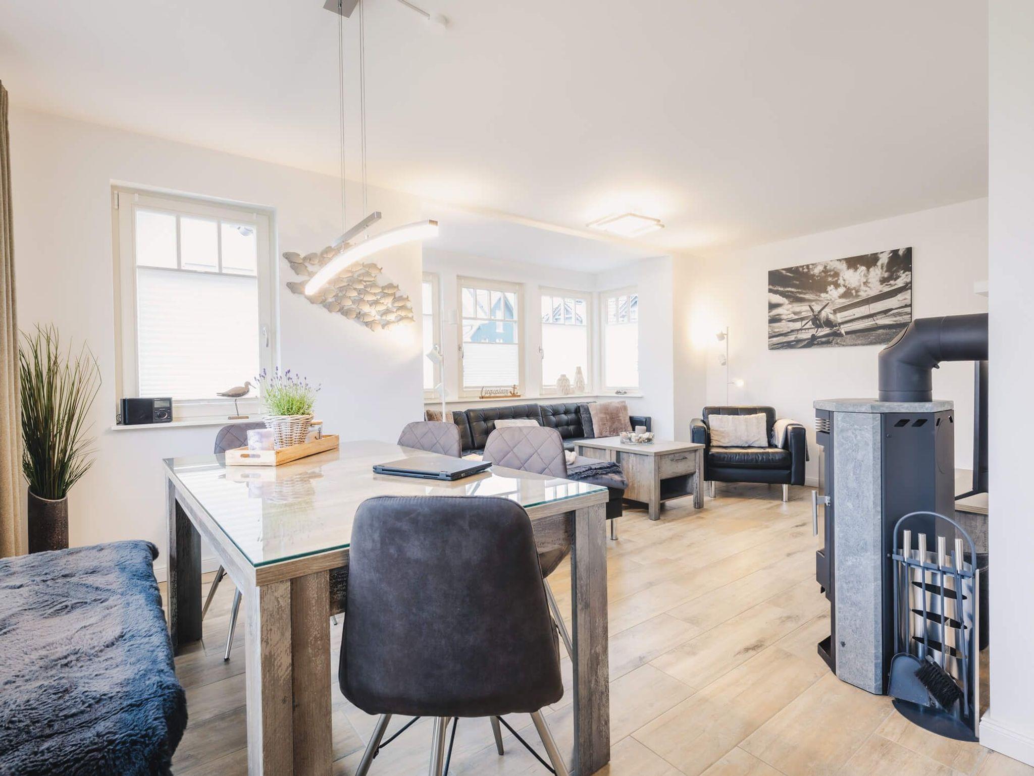 Das Erdgeschoss des Hauses besticht durch ein modernes Wohnflair mit klaren Linien. Im Flur erwarten Sie ein großer Garderobenbereich und ausreichend Abstellmöglichkeiten. Einladende bodentiefe Fenster im Wohn- und Essbereich sowie eine angrenzende Südterrasse mit Terrassenmöbeln, Sonnenschirm und zwei großen Sonnenliegen sind großzügig gestaltet und farblich abgestimmt. Die offene, vollständig ausgestattete Einbauküche mit modernen Elektrogeräten bietet vollen Urlaubskomfort. Im Wohnzimmer befinden sich eine große, bequeme Sitzlandschaft aus Leder sowie ein Kaminofen für gemütlich Stunden. Bücher und Gesellschaftsspiele stehen zur Verfügung. Ein geräumiges Badezimmer mit WC, großzügiger Dusche und beleuchtetem Spiegel runden den Komfort im Erdgeschoss ab.