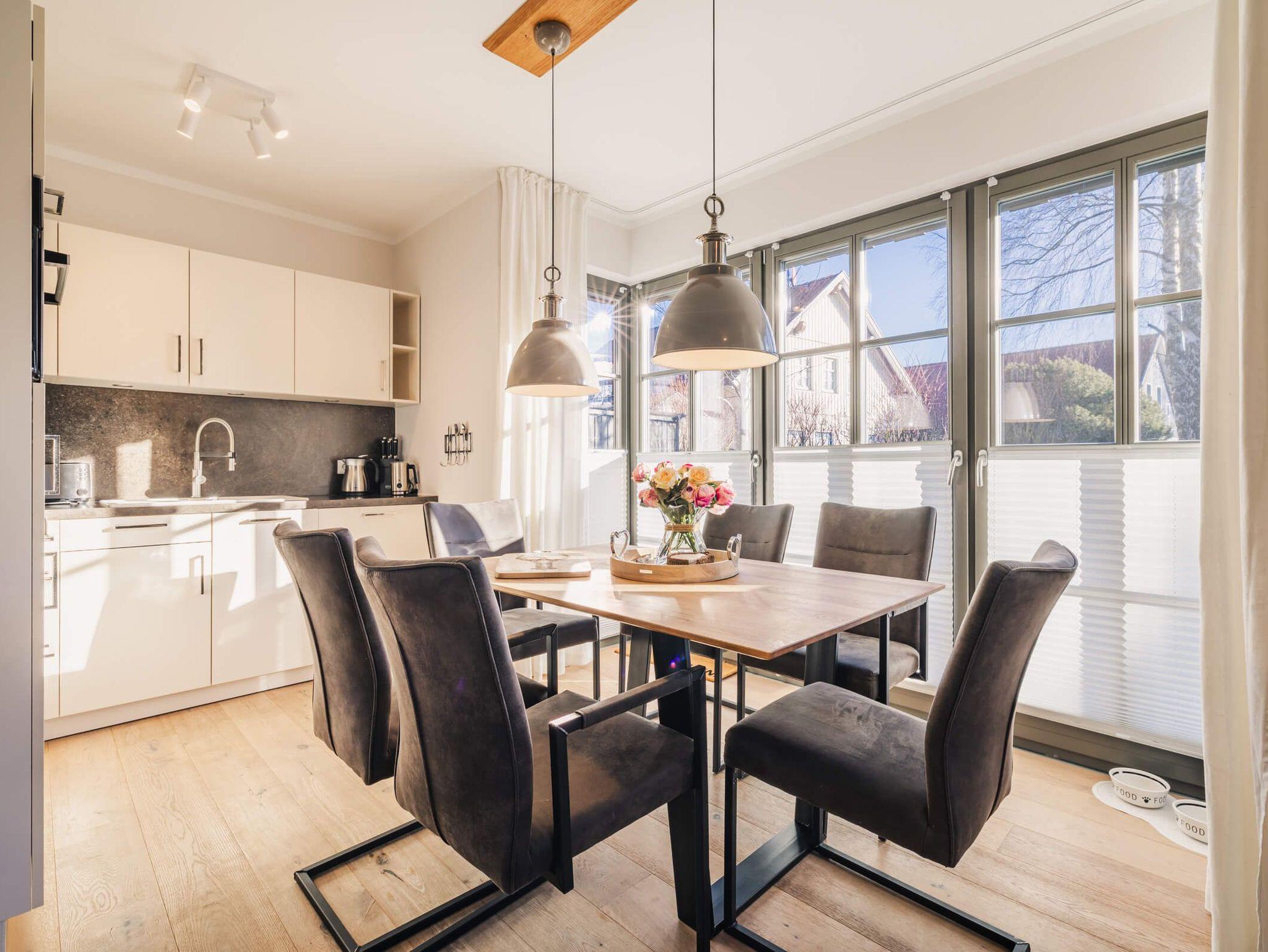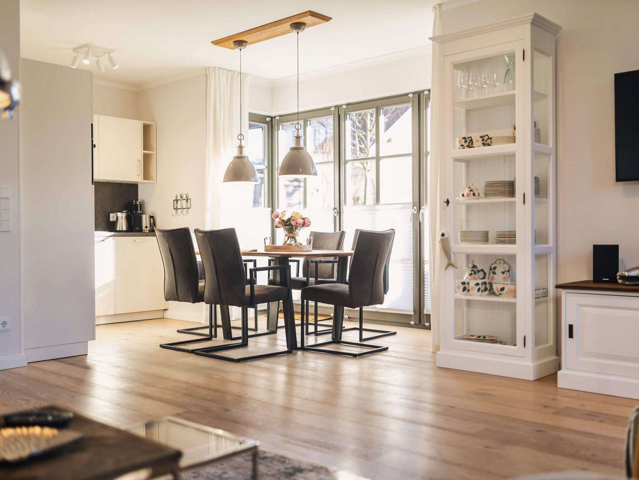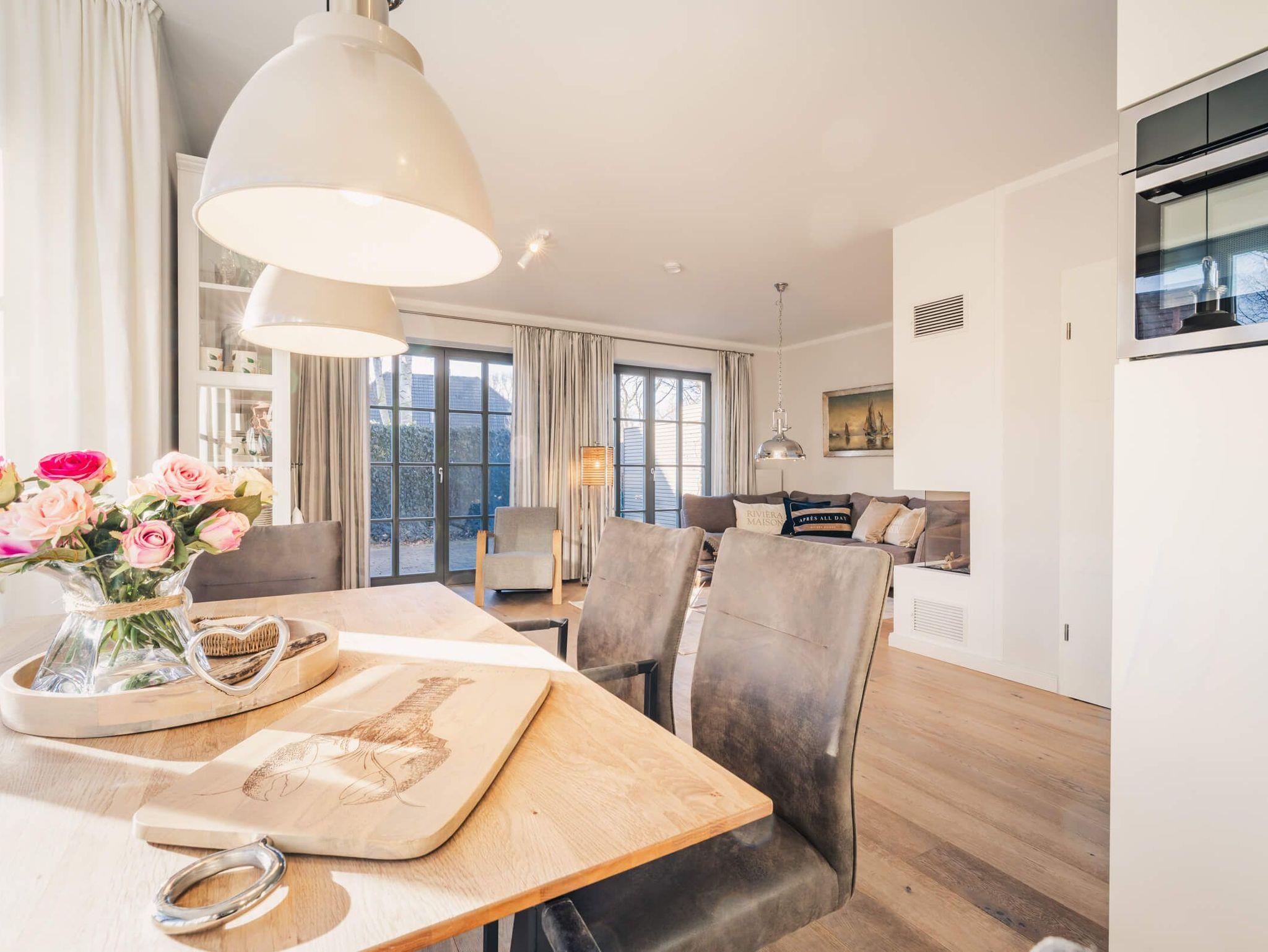 Der offene Wohn- und Essbereich im Erdgeschoss ist das Herzstück des Hauses. Große Fensterfronten sorgen für viel Licht, während der gemütliche Gaskamin in der Nebensaison für eine behagliche Stimmung sorgt. Die Einrichtung in warmen Farben unterstreicht den exklusiven Charakter dieses Ferienhauses an der Ostsee.