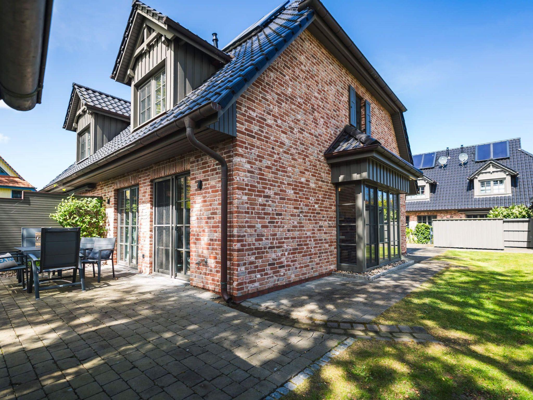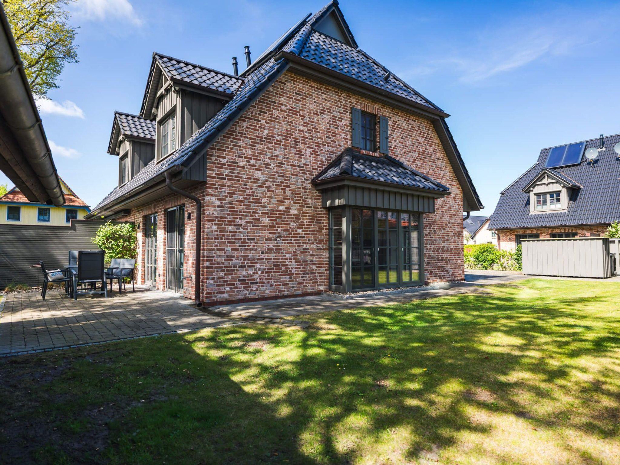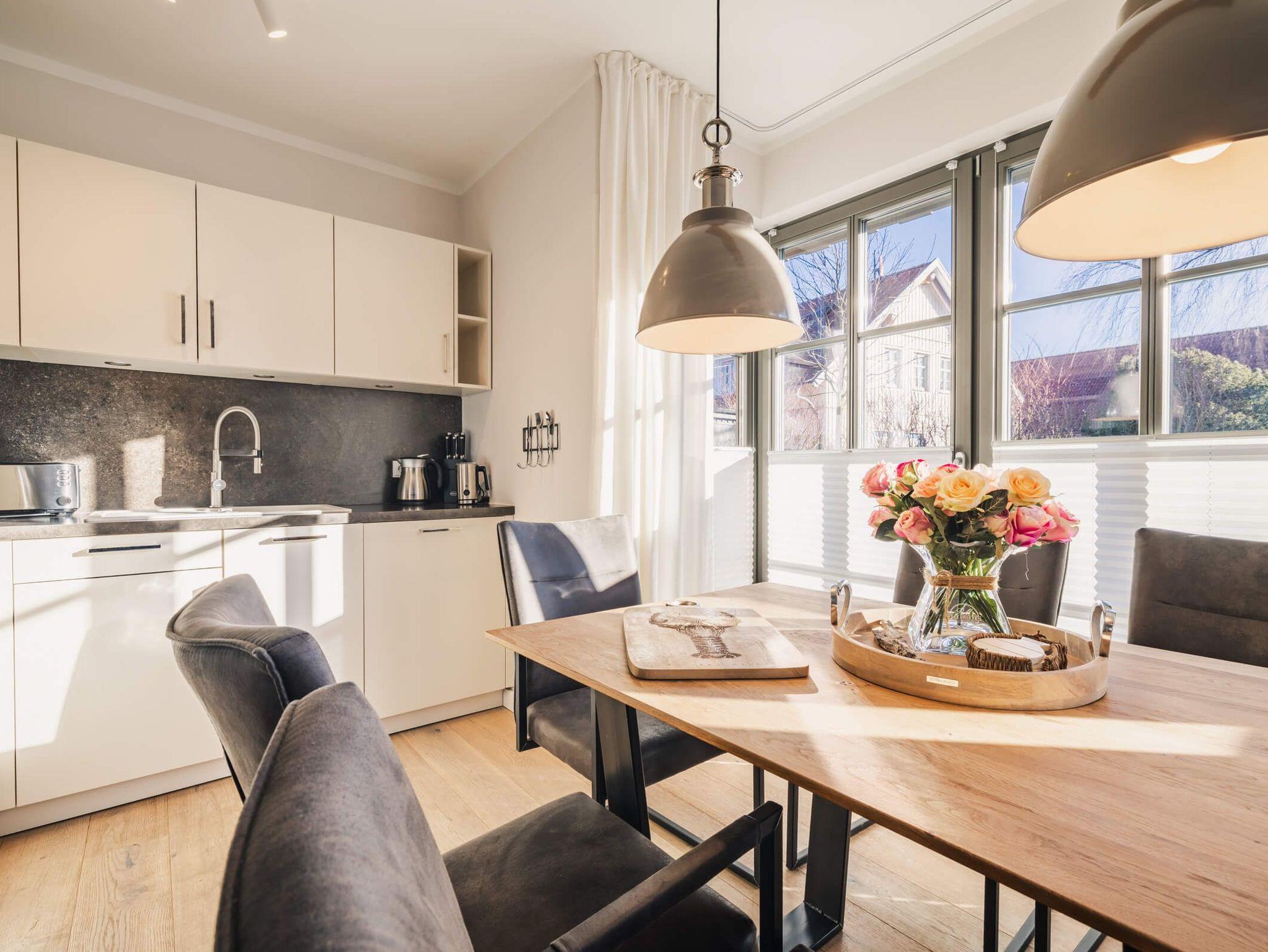 Der offene Wohn- und Essbereich im Erdgeschoss ist das Herzstück des Hauses. Große Fensterfronten sorgen für viel Licht, während der gemütliche Gaskamin in der Nebensaison für eine behagliche Stimmung sorgt. Die Einrichtung in warmen Farben unterstreicht den exklusiven Charakter dieses Ferienhauses an der Ostsee.