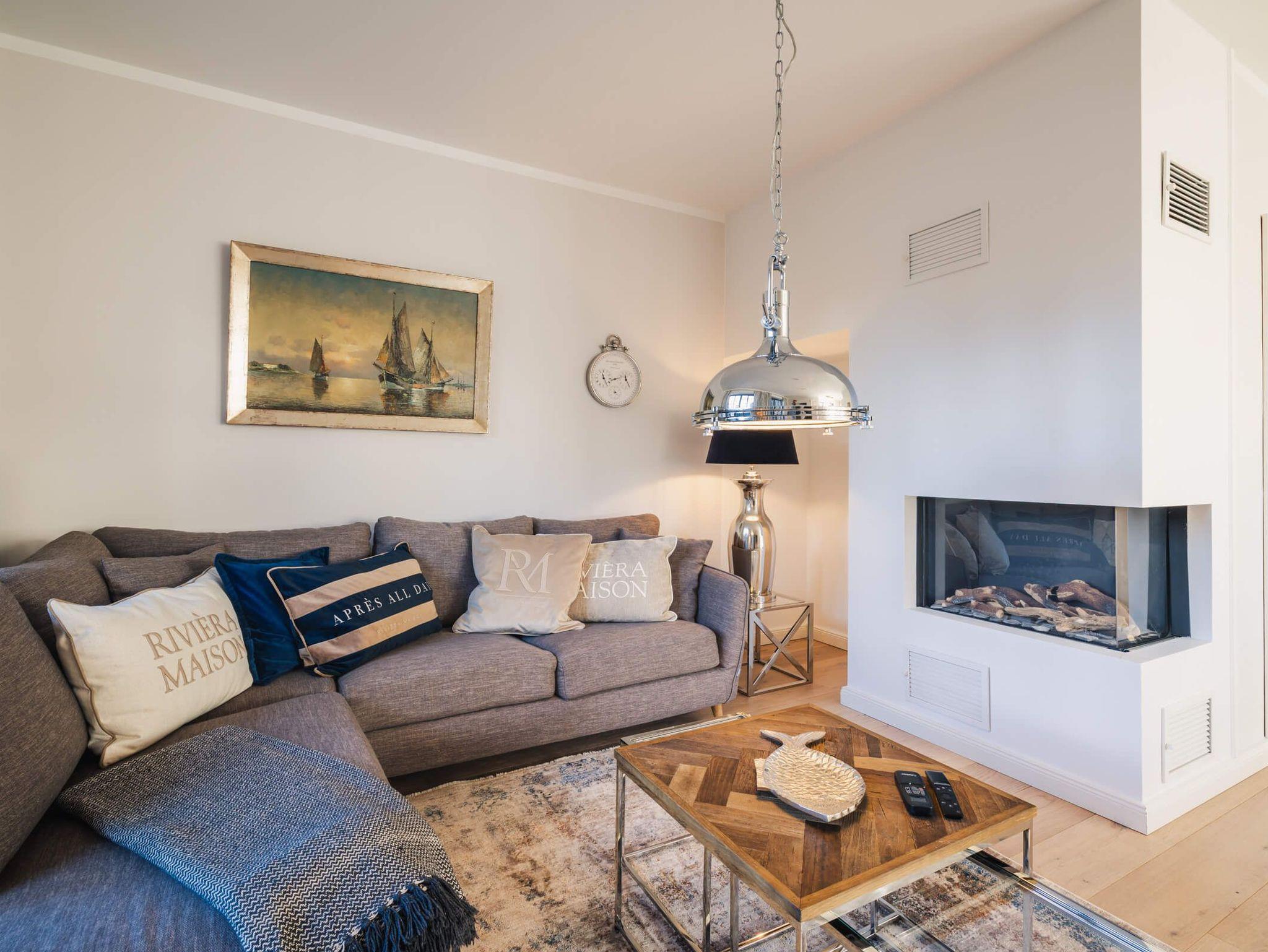 • Gemütlichkeit: Ein stilvoller Gaskamin sorgt an kühleren Abenden für eine besonders behagliche Stimmung im offenen Wohnbereich.