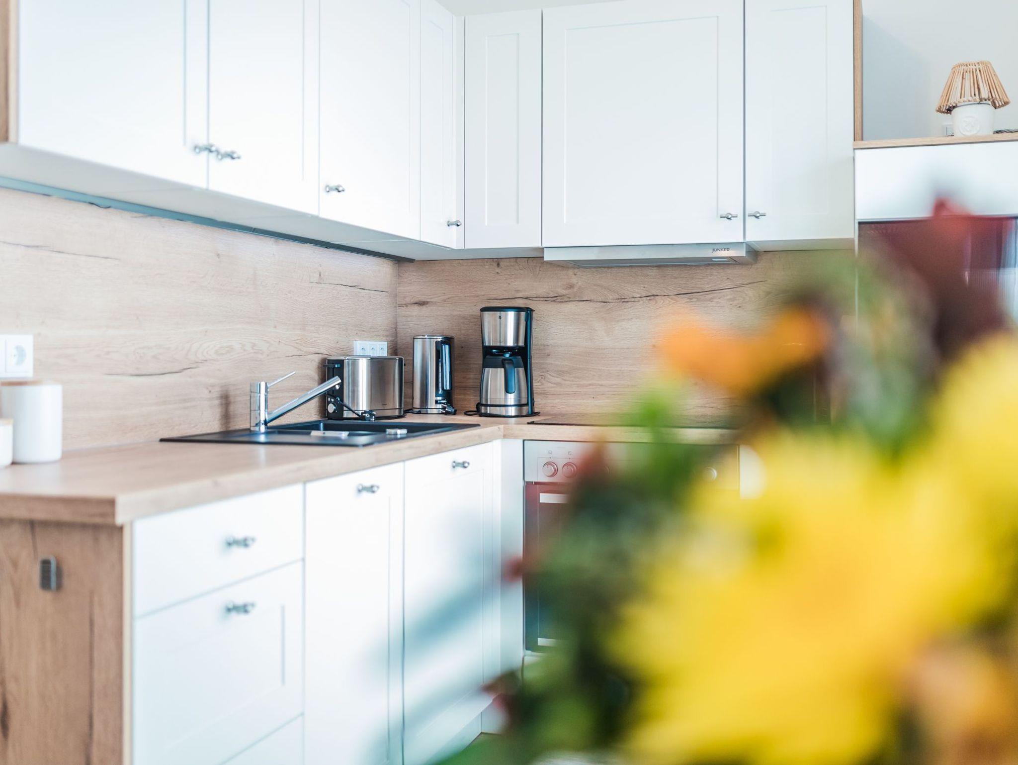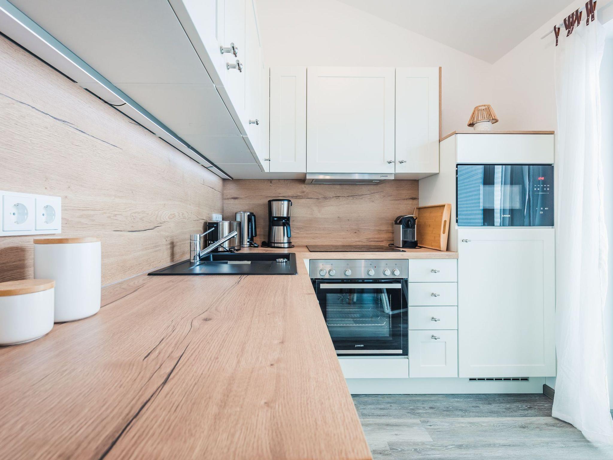 Charmante Wohnung Sandhummel in Zingst mit Balkon, moderner Küche und Naturtönen, ideal zum Entspannen und Sonnenuntergänge genießen.